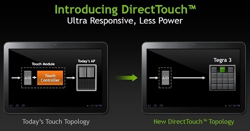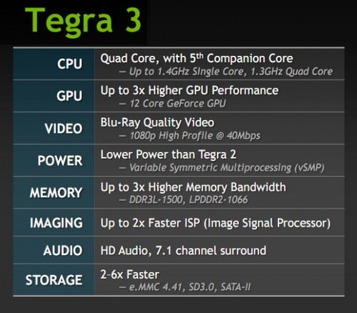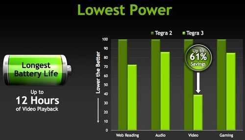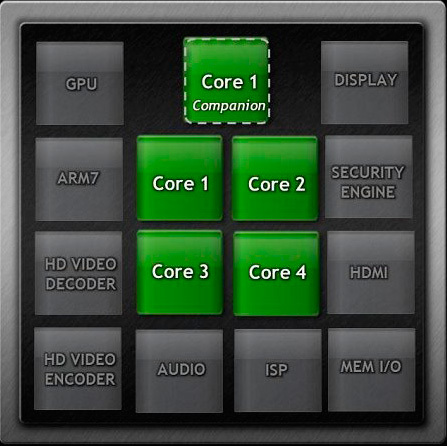 NVIDIA Tegra 3NVIDIA Tegra 3 – это первая платформа с четырехъядерным процессором ARM Cortex-A9 MP Core, каждое ядро которого работает с частотой 1.3 ГГц. Здесь есть еще одно дополнительное ядро со значительно меньшей частотой, на которое устройство переключается при простое. ![]() Основным выгодным отличием платформы является технология Variable Symmetric Multiprocessing (vSMP), сейчас она называется 4-PLUS-1, которая распределяет задачи между основными ядрами и чипом-компаньоном, помогает снизить энергопотребление мобильных устройств и продлить время их работы от батареи. Технология 4-PLUS-1 заключается в использовании четырех основных автономных ядер и дополнительного пятого ядра, которое называется чип-компаньон, суть работы платформы заключается в переменной симметричной многопроцессорной обработке данных. При минимальной нагрузке: воспроизведении видео и музыки, установке обновлений, работе в интернете и т.д. за работу отвечает чип-компаньон, который переключается в режим экономии энергии. А вот, когда нужно запустить какое-либо энергоемкое приложение, чип-компаньон завершает свою работу, и включаются четыре основных ядра, потребление энергии которых все же меньше, чем у двухъядерных процессоров. Следует еще отметить, что на платформе Tegra 3 система самостоятельно анализирует загруженность отдельно каждого ядра CPU, исходя из этого, уже включает или выключает от одного до четырех ядер. ![]() Сравнивая Tegra 3 с Tegra 2, можно выделить ряд преимуществ. В первую очередь следует отметить, что производительность процессора Tegra 3 составляет 13800 MIPS (миллионов операций в секунду), а в двухъядерном процессоре Tegra 2 она в три раза меньше. Четырехъядерный процессор рассчитан на многопоточность, т.е. способен работать с несколькими требовательными приложениями одновременно, а также его мощности хватит, чтобы поддержать фоновые процессы. Главная цель создателей Tegra 3 – сделать возможным выполнение многих задач без использования мощного четырехъядерного процессора. Такая архитектура позволяет снизить энергопотребление устройства на 61% в сравнении с Tegra 2, обеспечив тем самым до 12 часов воспроизведения HD-видео в автономном режиме. ![]() В новой платформе появился усовершенствованный графический процессор. По сравнению с Tegra 2, производительность его стала выше в два раза, также он поддерживает стерео 3D. Подключив телефон или планшет к 3D телевизору можно играть в любимые игры на большом экране, насладившись в полной мере всеми 3D эффектами. Платформа NVIDIA Tegra 3 оснащена 12-ядерным графическим процессором GeForce, в то время как у Tegra 2 было всего 8 графических ядер. Tegra 3 имеет три блока, в то время как Tegra 2 только два блока, выполняющих по четыре команды за такт. Это позволило создавать более сложные и реалистичные изображения. ![]() Разработчики попытались сделать все, чтобы уменьшить энергопотребление устройств, построенных на новой платформе. С этой целью была добавлена энергосберегающая технология подсветки экрана PRISM, которая обеспечивает экономию электроэнергии до 40%. Также в Tegra 3 используется технология DirectTouch – запатентованная сенсорная архитектура, благодаря которой ускоряется быстродействие и повышается чувствительность сенсорного дисплея до 6 раз. Но при этом часть вычислительной нагрузки при нажатии на экран переносится на чип-компаньон, благодаря чему уменьшается энергопотреблен