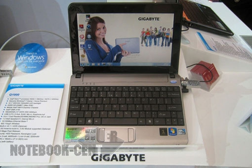 Компания Gigabyte представила на выставке Computex 2010 свой новый нетбук Q1000C. Работающий под управлением Windows 7, нетбук оснащается 10.1" глянцевым дисплеем с разрешением 1024 x 600 пикселей и процессором Intel Atom N450 или N470. Имеется также видеокарта Intel GMA 3150, до 2GB оперативной памяти DDR2 и 2.5" жесткий диск емкостью 250GB с интерфейсом SATA и скоростью вращения шпинделя 5400RPM.