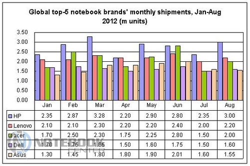 Глобальная пятерка производителей ноутбуков в августе должна была продемонстрировать увеличение поставок. По словам старшего аналитика Digitimes Research, Джоан Чена (Joanne Chien), HP и Acer должны показать рост отгрузок на 20% по сравнению с предыдущим месяцем.
