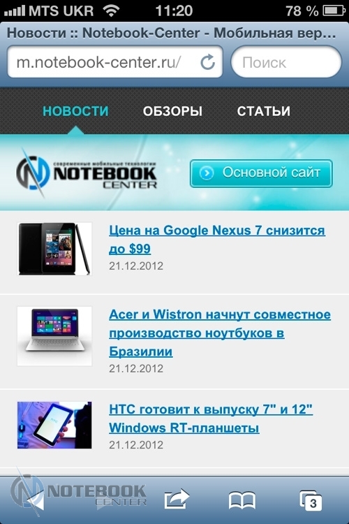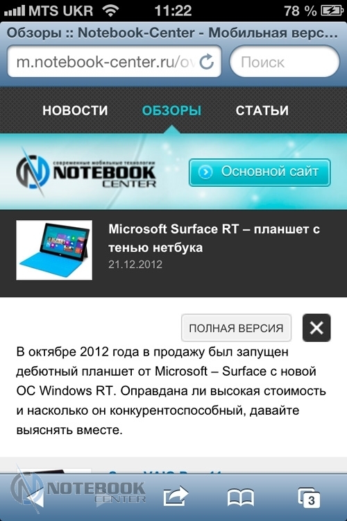 ![]() Наш сайт адаптирован для большинства мобильных браузеров, которые используются в современных моделях планшетов и смартфонов. Для просмотра полной версии новостей достаточно перейти по ссылке-названию новости. Если же вы желаете ознакомиться с содержание статьи или обзора, то после клика по названию у вас появится иконка «Полная версия», нажав на нее, вы перейдете в режим просмотра текста с полноразмерными картинками. ![]() Чтобы ознакомиться с мобильной версией сайта с ноутбука вы можете перейти по этой ссылке, либо нажав на ссылку «Мобильная версия», расположенную в левом нижнем углу страницы основного сайта. Чтобы вернуться к полной версии сайта необходимо нажать на иконку «Основной сайт», находящуюся в правом верхнем углу мобильной версии. ![]() Мобильная версия сайта всегда доступна по адресу m.notebook-center.ru. Чтобы облегчить доступ к сайту с мобильного устройства, достаточно добавить эту ссылку в «Избранное» вашего мобильного браузера. ![]() Свои рекомендации и замечания по работе мобильной версии сайта размещайте в комментариях к этой новости. Автор: Ксения Мыцык Дата: 24.12.2012 ПоделитьсяНравитсяПредыдущие новости: