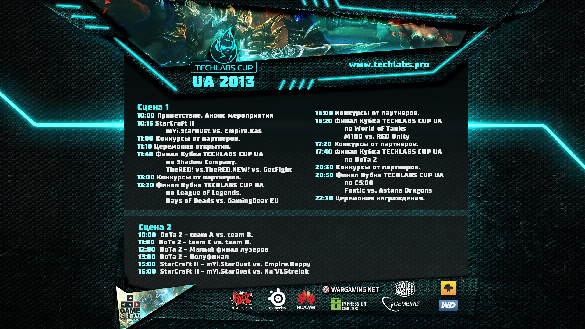 ![]() Старт мероприятия в 10.00 по киевскому времени. Официальная трансляция: Расписание мероприятия: ![]() StarCraft II ![]() Призовой фонд финала: $3000* (1 победа $1000). Dota 2 ![]() Призовой фонд финала: 1 место – $5000* + Квота на Гранд-Финал 2 место – $3000* 3 место – $1500* 4 место – $500* Shadow Company ![]() Призовой фонд финала: 1 место – $5000* + Квота на Гранд-Финал 2 место – $2500* 3 место – $1500* League of Legends ![]() Призовой фонд финала: 1 место – $6000 + Квота на Гранд-Финал 2 место – $3000 World of Tanks ![]() Призовой фонд финала: 1 место – $7000* + Квота на Гранд-Финал 2 место – $3000* Counter Strike: Global Offensive ![]() Призовой фонд финала: 1 место – $3000* + Квота на Гранд-Финал 2 место – $1500* Киберфестиваль TECHLABS CUP UA 2013 пройдет 31 августа в ТРЦ «DreamTown1» - Киев. Вход свободный. В течение года TECHLABS CUP 2013 на своих страницах в социальных сетях http://vk.com/techlabscup и https://www.facebook.com/techlabscup будет разыгрывать ценные призы. Узнать актуальную информацию о TECHLABS CUP 2013: Официальная страница чемпионата: http://techlabs.pro/ Официальная группа вКонтакте: http://vk.com/techlabscup Официальная группа Facebook: https://www.facebook.com/techlabscup Официальная страница в Twitter: https://twitter.com/techlabs_event Официальный канал YouTube: http://www.youtube.com/techlabscuptv * — ценные призы и подарки от спонсоров эквивалентные указанной сумме. Дата: 30.08.2013 ПоделитьсяНравитсяПредыдущие новости: