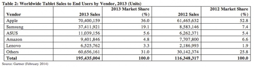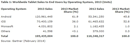 По последним данным аналитиков из Gartner в прошлом году было продано порядка 195 млн планшетных устройств. Платформа Google получила 62% всего рынка планшетов, серьезно обогнав при этом iOS –устройства.
