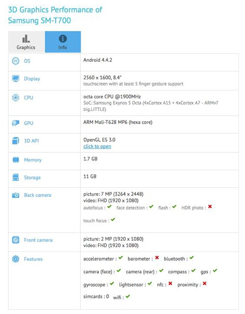 Новый 8.4-дюймовый планшет Samsung прошел ряд тестов в GFX. Устройство поставляется с серийным номером SM-T700, ниже рассмотрим характеристики новинки.