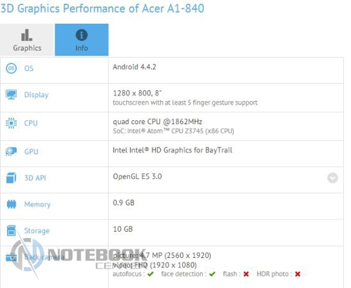 Acer, кажется, уже занята тестированием нового 8-дюймового планшета на ОС Android с процессором Intel Atom Bay Trail. Характеристики устройства и результаты тестирования недавно появились на сайте GFXBench, из чего можно судить, что этот планшет будет довольно недорогим, а комплектация будет включать чип от Intel.