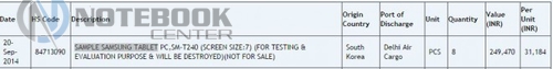 Индийский cайт Zauba, отслеживающий экспорт и импорт товаров, часто является источником информации о еще не вышедших электронных новинках. На этот раз в базе данных сайта замечен загадочный планшет от Samsung с 7-дюймовым экраном под кодовым названием SM-T240.