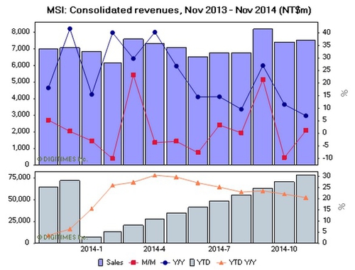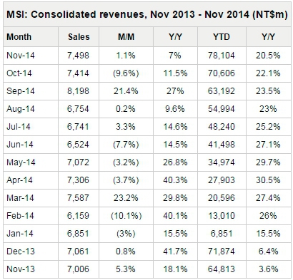 MSI сообщила, что консолидированный оборот компании составил почти $240.5 млн в ноябре 2014 года, что на 7% выше результата прошлого месяца и на 1.14% больше показателя за ноябрь 2013 года.