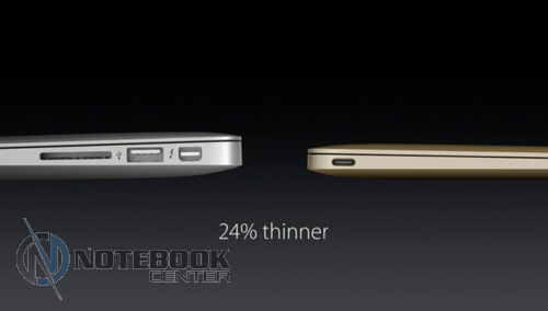 Новенький MacBook от Apple на 24% тоньше, чем MacBook Air, и весит всего 900 грамм. Что касается названия, то компания так и назвала его MacBook без каких-либо дополнительных приставок. ноутбук имеет 12-дюймовый безрамочный Retina-дисплей с разрешением 2304х1440 пикселей. Толщина новенького MacBook составляет всего 13.1 мм, он имеет цельнометаллический корпус, и безвентиляторный дизайн, что делает его первым MacBook с пассивной системой охлаждения.