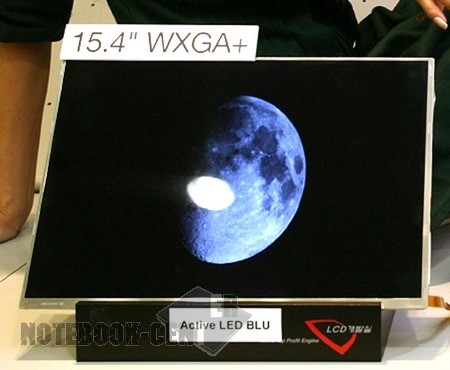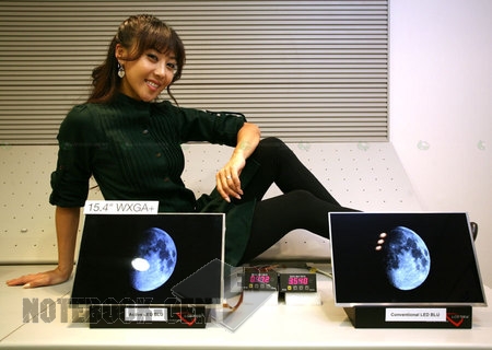 Samsung разработала три новых LCD дисплея для использования в ноутбуках. Два из них имеют матрицу с соотношение сторон 16:9, в то время как третий имеет White-LED подсветку, которая повышает яркость изображения и уменьшает потребление электроэнергии. Этот дисплей имеет очень высокий уровень контрастности, который составляет 10000:1. Это 15.4" LCD с разрешением WXGA 1440 x 900 пикселей, яркостью 300 кд/м2, угол обзора 120 градусов. Он потребляет всего 2 Вт, что на 40% меньше, чем у обычного дисплея с LED backlight подсветкой.