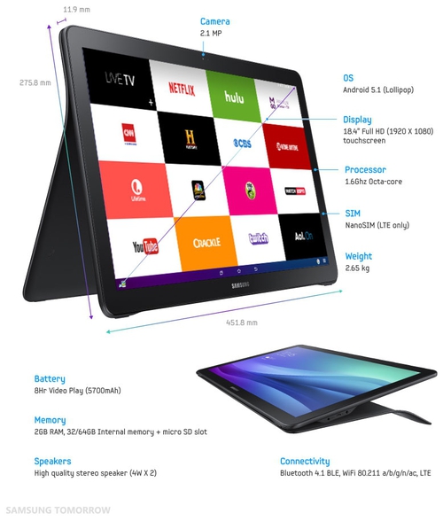 Вчера был представлен 18.4-дюймовый планшет Samsung Galaxy View, вокруг которого ходило столько слухов еще с начала осени. Разрешение огромного дисплея составляет 1920х1080 пикселей, а в основе новинки лежит 8-ядерый процессор с рабочей частотой 1.6 ГГц, предположительно, Samsung Exynos 7580. Помимо всего этого, устройство дополнено 2 ГБ ОЗУ, аккумулятором на 5700 мАч и камерой на 2 Мп; объем флеш-памяти составляет 32/64 ГБ, который можно расширить карточкой microSD. Желающим будут доступны модели планшета с поддержкой LTE и nano-SIM.