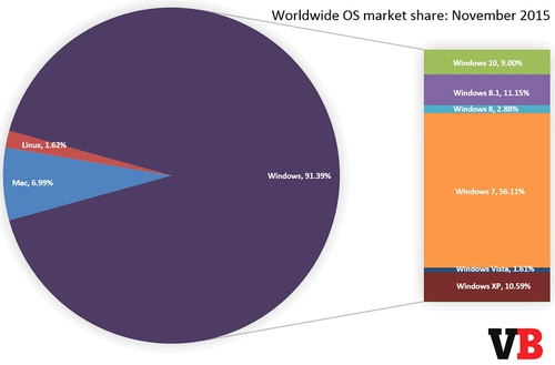 В самом начале Windows 10 сумела за довольно короткий срок, а точнее, в течение месяца, захватить 5.2% рынка. Однако теперь можно констатировать, что ее распространение затормозилось. Во всяком случае, аналитики из Net Applications приводят статистические данные, где показатель «десятки» за ноябрь сумел увеличиться только на 1.06%. Таким образом, рыночная доля данной операционной системы не превысила 9%.