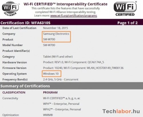 Ожидается, что в самом начале года на CES 2016 компания Samsung может представить 12-дюймовый планшет, работающий на операционной системе Windows 10. Samsung SM-W700 уже засветился, проходя сертификацию в Wi-Fi Alliance и Bluetooth SIG. Таким образом, стоит рассчитывать на то, что в скором времени гаджет анонсируют официально.
