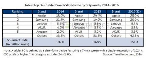 Наблюдается стойкая тенденция снижения мировых поставок планшетных компьютеров – это утверждают аналитики компании TrendForce, анонсировав данные о том, что в 2015 году на рынок вышли только 168.5 млн экземпляров, что на 12.2% меньше, по сравнению с 2014 г.