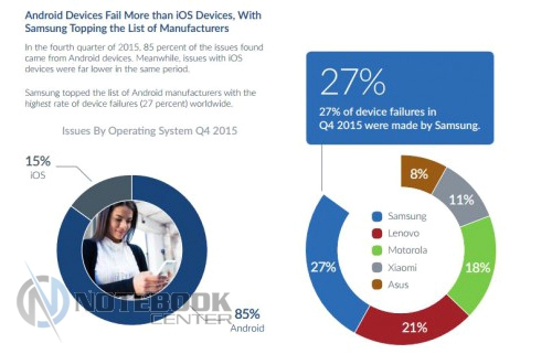 В свое время исследования Crittercism, компании фиксирующей отчеты о проблемах на различных операционных системах, показывали, что платформа Android менее проблемная чем iOS 7.1. Правда, к такому заключению они пришли на основании лишь программных ошибок. Если же учитывать все без исключения баги, как это сделали в Blancco Technology, то получается, что сейчас на iOS-устройствах (планшеты, смартфоны) возникает 15% проблем, тогда как на Android – 85% . Впрочем, такое большое количество сбоев можно отчасти объяснить высокой популярностью гаджетов, работающих именно на Android, ведь их доля в мире занимает порядка 80%.