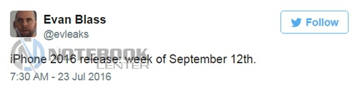 Предположений о том, когда выйдет iPhone 7, за последний период очень много. Одно из них, это информация от Эвана Бласса (Evan Blass), который разместил твит с возможной датой анонса смартфона – 12 сентября, т.е. после ежегодной выставки IFA. Впрочем, интересно и то, что в названии устройства может не быть цифры семь, а производитель ограничится лишь названием iPhone 2016. В любом случае это пока только слухи.