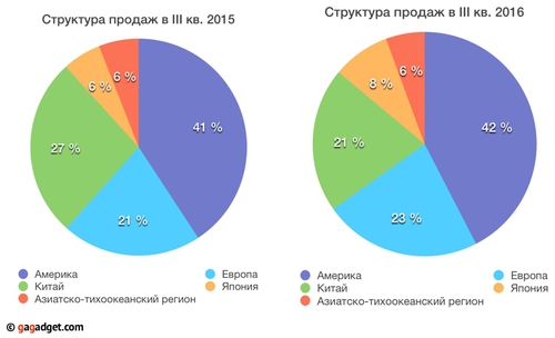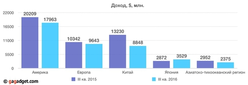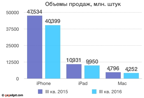 За 3-й квартал 2016 года компания Apple заработала 42.358 млрд долларов, и это на 15% меньше, по сравнению с годом ранее. Главным источником доходов являются продажи iPhone, однако, спрос на смартфоны, а также планшеты и ноутбуки упал на 7 млн штук, 1 млн и 0.5 млн соответственно.