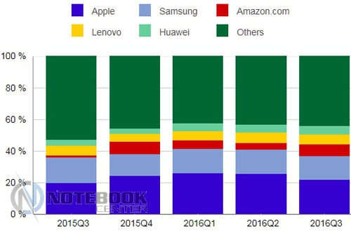 ![]() Если говорить о поставках планшетов конкретно по производителям, то на первом месте Apple. В целом, ее доля на фоне падения всего рынка возросла до 21.5%, хотя, в частности, отгрузки планшетов уменьшились на 6.2% и составили 9.3 млн штук. Второй после лидера идет южнокорейская компания Samsung, которая потеряла часть общего рынка. Снижение составило 0.9%, по количеству поставок это падение до 6.5 млн планшетов, учитывая предыдущий показатель 8.1 млн экземпляров. В пятерку также вошли: Amazon, Lenovo и Huawei. В частности, первая и последняя увеличили отгрузки планшетов до 3.1 и 2.4 млн устройств соответственно. Автор: Кравец Татьяна Дата: 01.11.2016 Ключевые слова: планшет ПоделитьсяНравитсяПредыдущие новости: |