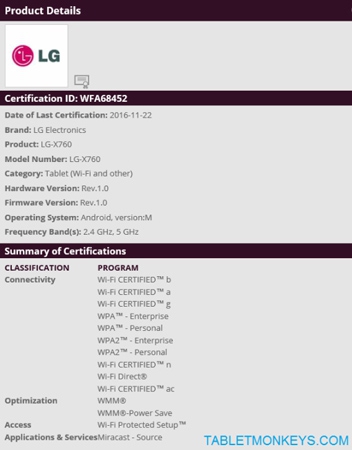 Компания LG Electronics, похоже, готовится показать новую модель планшета, которая проходила сертификацию Wi-Fi под названием LG-X760. Информации об устройстве очень мало. Пока что известно о наличии двухдиапазонного Wi-Fi 802.11 стандарта ac и работе на операционной системе Android 6.0 Marshmallow.