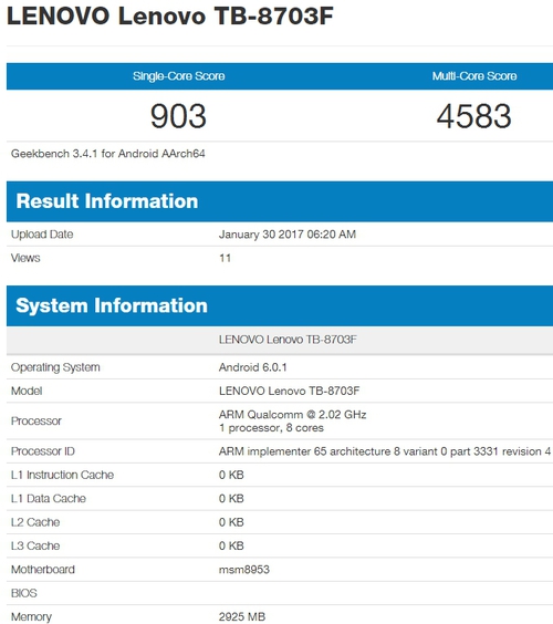 Компания Lenovo готовит к выпуску новый планшет Lenovo Tab3 8 Plus. Согласно данным теста GeekBench, аппарат получит чип Qualcomm Snapdragon 625 с восьмью процессорными ядрами, оперативной памяти 3 ГБ, во главе стоит операционная система Android 6.0 Marshmallow. Также, он оснащен дисплеем на 8 дюймов с разрешением 1920х1080 пикселей, 16/64 ГБ внутренней памяти, кардридером MicroSD, веб-камерой на 8 Мп и аккумулятором на 4300 мАч. Цена и дата начала продаж пока неизвестны, однако, скорее всего планшет появится на прилавках в модификациях как без модуля LTE, так и с ним.