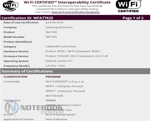 Компания Samsung, видимо, планирует в скором времени выпустить android-планшет Galaxy Tab A 10.1 (2018). В всяком случае 10-дюймовый гаджет с модельным номером SM-T595 успешно прошел сертификацию в Wi-Fi Alliance. Информации немного, известно, что на устройство установлена OS Android 8.1 Oreo, в корпусе предусмотрен модуль Wi-Fi 802.11 ac, который может работать на частотах 2.4 или 5 ГГц.