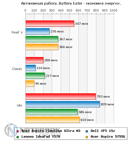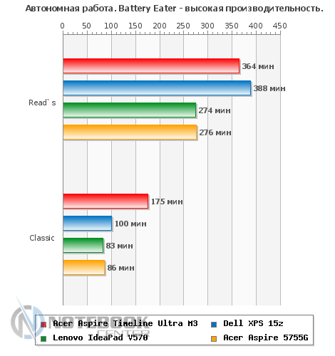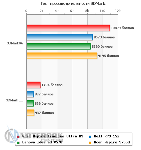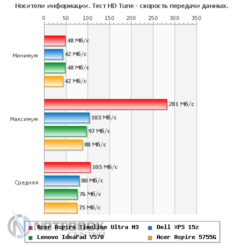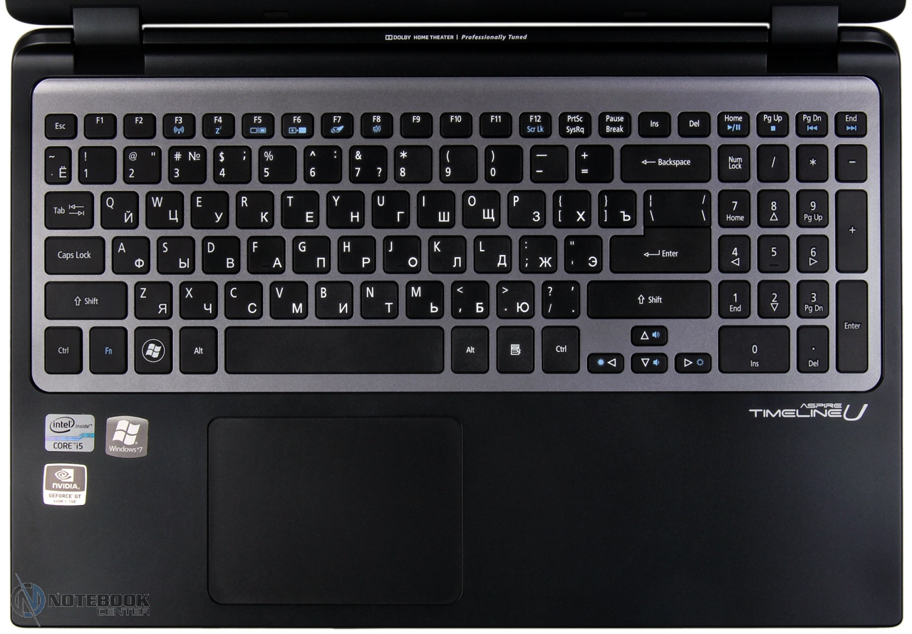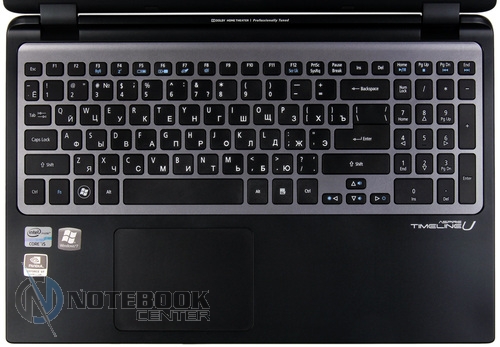 КомплектацияНоутбук пришел к нам на обзор, в белой коробке с эмблемой олимпийских игр, напомним, что компания Acer является спонсором Олимпийских игр 2012 года в Лондоне. В коробке кроме самого ультрабука находился блок питания мощностью 90 ватт, краткое руководство пользователя, буклет с описание ноутбука и схемой расположения портов и прочих элементов. В комплекте поставки отсутствует батарея, так как в Acer Aspire Timeline Ultra M3 она встроенная. В целом все лаконично и компактно, в стиле ультрабуков. ![]() ДизайнДизайн этой модели отличается от большинства ультрабуков в первую очередь, тем, что его поверхности сделаны матовыми. Также корпус лишен каких-либо шлифовок и хромированных или блестящих деталей. Такой дизайн будет по душе почти всем возрастным категориям. ![]() Кстати считается, что матовая поверхность более практичная, так как на ней не так сильно остаются отпечатки пальцев и не так видно царапины. Но наша модель тоже довольно сильно и охотно собирала следы от пальцев, которые ко всему прочему с трудом удалялись. А вот подладонная поверхность, изготовлена из пластика, который очень легко очищается. Очень удачным решением в дизайне является сочетание с матовым корпусом черного цвета еще и темно-серой подложки клавиатуры, что преподносит ультрабуку еще большую оригинальность. ![]() Качество сборки хорошее, отсутствуют какие-либо прогибы и изгибы на корпусе. Крепление дисплея довольно жесткое, а рамка дисплея выполнена из матового пластика, который не будет бликовать. ![]() Благодаря совершенно ровному днищу, ультрабук смотрится еще тоньше, чем есть на самом деле. А плавные, лишенные портов боковые грани придают ноутбуку слегка обтекаемую форму, которая также положительно сказывается на восприятии габаритов. Если габариты 376.2×253×19.7~20.6 мм, визуально выглядят меньше, чем есть на самом деле, то вес ультрабука составляет 2.23 кг, что может показаться довольно тяжелым как для ультрабука. ![]() Дисплей и звукИ снова мы видим нестандартный подход к реализации концепции ультрабуков как класса. Стандартным размером дисплеев ультрабуков является диагональ 11.6 или 13.3 дюйма. В компании Acer решили, что можно совместить довольно привычную диагональ 15.6 дюйма и размеры, который бы соответствовали классу ультрабуков. К тому же установленная в Acer Aspire Timeline Ultra M3 видеокарта подразумевает его использование как игровой модели, что обязывает иметь довольно большой дисплей. Таким образом, наш ультрабук обзавелся широкоформатным дисплеем с диагональю 15.6 дюймов. ![]() 15.6-дюймовый дисплей имеет стандартное разрешение 1366х768 пикселей. Что касается его качества, то оно лучше стандартных TN-матриц, но для устройства такого класса хотелось бы и лучше. Яркость и контрастность также вызывают положительные эмоции. А вот глянцевое покрытие дисплея может создать ряд неудобств, в первую очередь тем, что при работе за ноутбуком в солнечную погоду он будет довольно сильно бликовать. Что касается углов обзора, то тут не все так однозначно. При отклонении дисплея от себя или, наоборот, к себе, цвета чуть инвертируются, но изображение остается читаемым. А вот вертикальные углы не могут похвастаться хорошим диапазоном и искажают изображение при небольшом изменении угла. Кстати максимальный угол раскрытия дисплея составляет 153 градуса. Если говорить о дисплее в целом, то играть и см