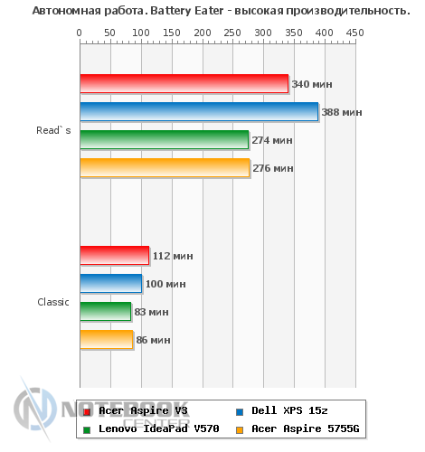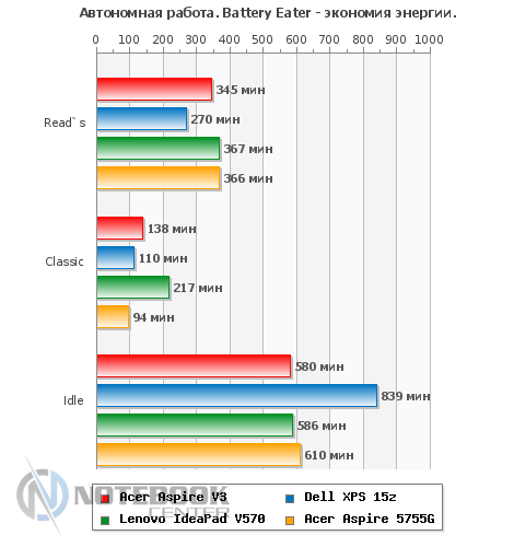 Комплект поставкиКроме самого ноутбука, в комплект поставки также вошли краткое руководство пользователя, буклет с кратким описанием ноутбука, лицензионное соглашение, диск с программным обеспечением, 6-секционная литий-ионная батарея и 65-ваттный блок питания. Все это, вместе с ноутбуком, было упаковано в презентабельную коробку с логотипом олимпийских игр. Напомним, что компания Acer является официальным спонсором Олимпийских игр 2012 в Лондоне. ![]() ДизайнПожалуй, это один из самых глянцевых ноутбуков, из всех которые мне доводилось видеть. К тому же еще и покрытый лаком. Кажется немного странным использование лакированных глянцевых поверхностей на ноутбуке такого класса, который, скорее всего, станет заменой вашему домашнему компьютеру. ![]() Глянцевая лакированная поверхность вызывает двойственные чувства. С одной стороны черный лакированный корпус смотрится довольно красиво, с другой стороны этот же корпус после пары касаний руками становится не очень приятным на вид. Отпечатки пальцев на черных лакированных поверхностях появляются мгновенно и очень сильно заметны в дальнейшем, к тому же есть риск поцарапать или затереть лакированную поверхность. ![]() Из особенностей дизайна еще можно отметить красивое сочетание черных лакированных и серебристых поверхностей. Из украшений можно выделить небольшую надпись «acer» на крышке ноутбука. ![]() Что касается формы самого ноутбука, то тут преобладают ровные поверхности без каких-либо закруглений, только задняя грань выполнена в виде цилиндра. Серебристый цвет используется на подложке клавиатуры и боковых гранях. А вот днище выполнено из более грубого, не лакированного пластика также черного цвета. Кстати на днище почти отсутствуют вентиляционные отверстия, зато есть легкий доступ к таким внутренним компонентам как память и накопитель, для этого нужно открутить всего два винта. ![]() Подводя итог, хотелось бы сказать, что материалы, использованные в Acer Aspire V3 довольно качественные, сборка тоже заслуживает внимания, а вот жесткости корпусу явно не хватает. Были замечены сильные прогибы на крышке, на клавиатуре ближе к цифровому блоку, а также на днище. Что касается лакированных поверхностей, то они очень легко пачкаются, но и также легко очищаются. ![]() Габариты ноутбука не маленькие, как и его вес, но для 15.6-дюймовой модели, к тому же такого класса, эти показатели не являются критическими. Вес ноутбука составляет 2.4 кг, габариты - 382х253х25~33 мм. Дисплей и звукВ этом ноутбуке установлен обычный 15.6-дюймовый дисплей. Его разрешение составляет 1366х768 пикселей, соотношение сторон 16:9, что позволит комфортно просматривать фильмы или играть. Что касается матрицы, то ее вполне хватит для обычных потребностей, включая просмотр фильмов, фотографий или работы в интернете. ![]() Углы обзора являются слабым местом многих, даже довольно дорогих ноутбуков, поэтому данную модель, к сожалению, не обошла стороной эта же участь. Как и во многих ноутбуках, боковые углы обзора довольно приличные, хотя некоторые искажения картинки присутствуют. А вот при отклонении дисплея от себя, кстати, максимальный угол раскрытия составляет 144 градуса, изображение очень сильно темнеет и искажается, прочитать с него что-либо становится очень затруднительным. ![]() ![]() Еще одна особенность данного дисплея заключается в том, что он