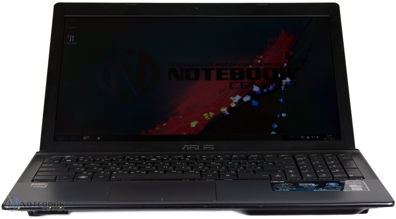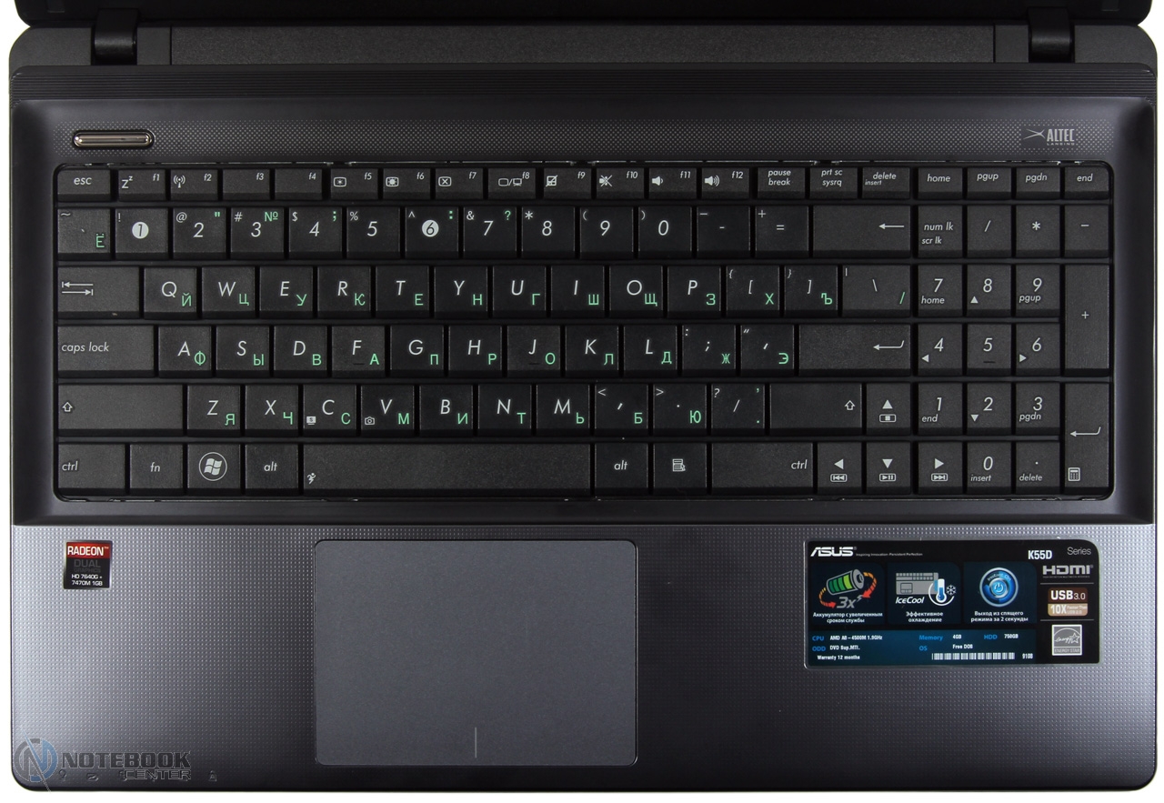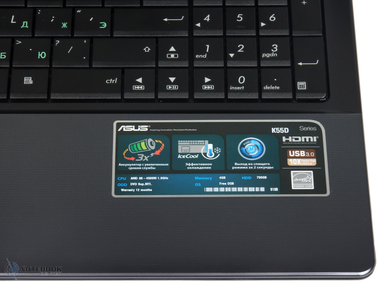 ДизайнНоутбук отличается большим количеством разнообразных типов поверхностей. Так, его днище выполнено из более темного пластика с рельефным рисунком в виде плетения. Верхняя крышка изготовлена из пластика с горизонтальными, чуть волнистыми линиями. Подладонная панель из серо-фиолетового пластика имеет едва заметную текстуру, а рамка дисплея сделана матовой. ![]() Кроме текстурной поверхности можно выделить логотип ASUS на крышке ноутбука. И замысловатые изгибы на днище ноутбука. Также в глаза бросается углубление, в котором чуть утоплена клавиатура, и горизонтальные полосы над ней. ![]() ASUS K55DR отличается не только различными текстурами корпуса, но и использованием нескольких цветов. Например, крышка ноутбука сделана черной, а подладонная поверхность - темно-фиолетовой. ![]() Что касается качества сборки и материалов, то, несмотря на «бюджетность» модели, она собрана из высококачественных материалов и довольно добротно. Петли держат дисплей очень крепко, прогибов почти не наблюдается, только в левой части клавиатуры и на крышке ноутбука при надавливании поверхность чуть уходит вниз. ![]() На днище довольно много вентиляционных отверстий, но по размерам они не очень большие. Также стоит отметить неравномерную толщину днища. Кроме того, что ноутбук имеет большую толщину возле батареи и сужается к передней грани, на нем также можно увидеть выпуклую часть в области жесткого диска. ![]() Ноутбук нельзя назвать очень тонким, но со стороны он смотрится довольно аккуратно и компактно. Вес ноутбука составляет 2.48 кг, что довольно тяжеловато, впрочем, это средний показатель по данному классу. Габариты ASUS K55DR составляют 378х253х32 мм. ![]() Дисплей, звук и веб-камераВ ноутбуке установлен стандартный для бюджетного сегмента дисплей. Матрица под названием AU Optronics B156XW02 выполнена по TN-технологии. Диагональ дисплея составляет 15.6 дюймов, а разрешение - 1366х768 пикселей. ![]() Качество дисплея почти ничем не отличается от большинства моделей данного ценового сектора, углы обзора также. Наблюдается «затемнение» картинки при наклоне дисплея от себя, и наоборот, картинка сильно светлеет при наклоне на себя. ![]() Цветопередача и яркость дисплея довольно хороши. В любом случае, дисплеи в бюджетном сегменте практически отличаются в различных моделях, поэтому при выборе недорогого ноутбука этому можно не уделять столько внимания. Для просмотра фильмов или игр данного дисплея хватит на все 100%. ![]() Компания ASUS в своих последних моделях бюджетного сегмента просто поражает качеством установленной акустики. Звук также хорош, как и в недавно протестированной нами модели ASUS X501A. Почти все частоты хорошо выражены, а уровень громкости достаточно высок, чтобы отчетливо слышать музыку даже в очень шумном месте. Просмотр фильмов или прослушивание музыки без сильных басов доставят вам удовольствие. Звук выходит через два динамика, которые расположены на днище, но в отличие от модели X501A, они располагаются ближе к задней, а не передней грани, что создает более объемный звук. ![]() Веб-камера, установленная в ASUS K55DR, располагается на рамке дисплея. Ее максимальное разрешение составляет 640х480 пикселей. Качества веб-камеры вполне хватит для общения в Skype или других похожих программах, а вот снимки, сделанные с ее помощью, получаются не такими качественными. ![]() Ниже видны фотографии, сд