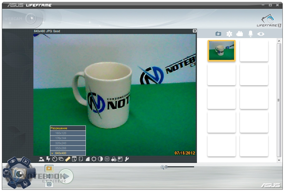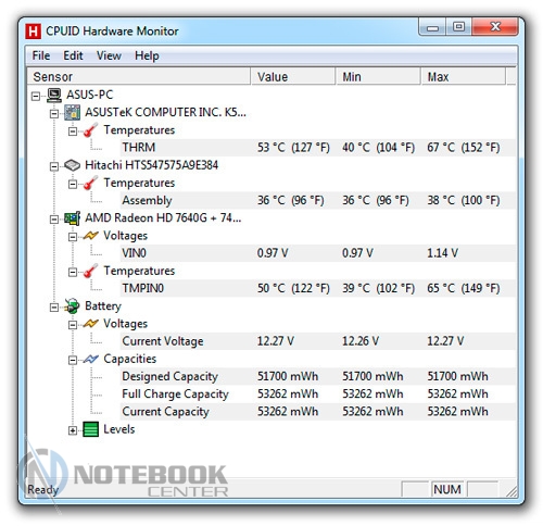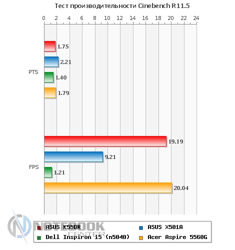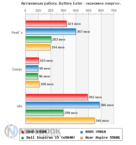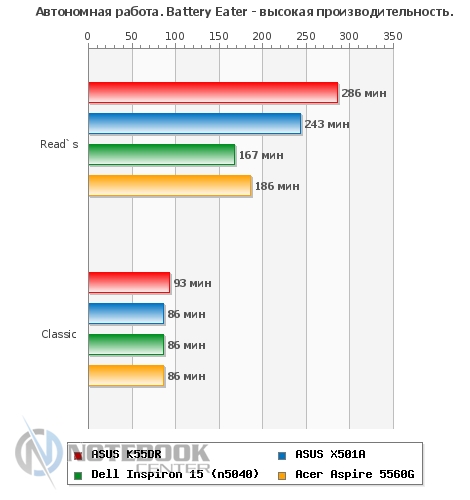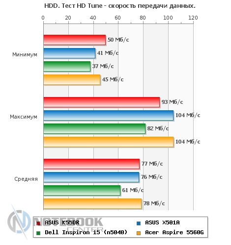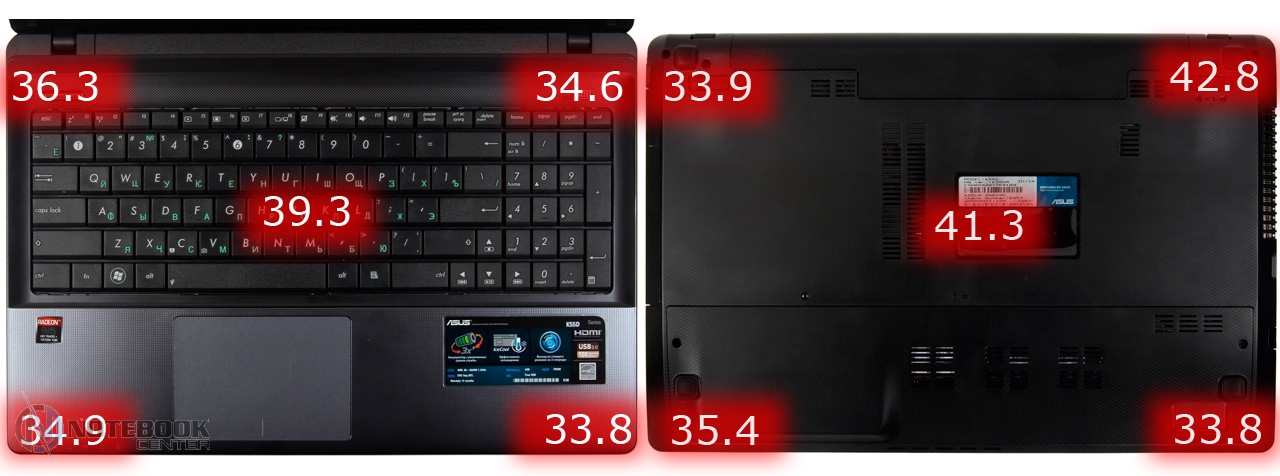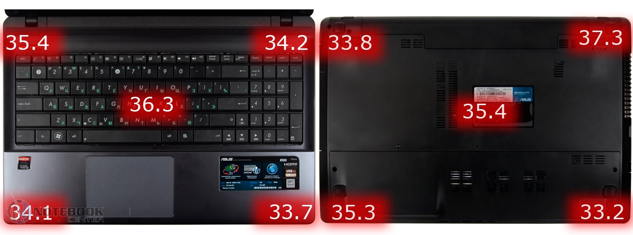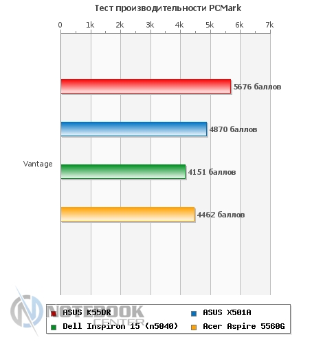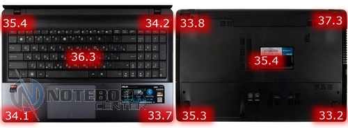 ДизайнНоутбук отличается большим количеством разнообразных типов поверхностей. Так, его днище выполнено из более темного пластика с рельефным рисунком в виде плетения. Верхняя крышка изготовлена из пластика с горизонтальными, чуть волнистыми линиями. Подладонная панель из серо-фиолетового пластика имеет едва заметную текстуру, а рамка дисплея сделана матовой. ![]() Кроме текстурной поверхности можно выделить логотип ASUS на крышке ноутбука. И замысловатые изгибы на днище ноутбука. Также в глаза бросается углубление, в котором чуть утоплена клавиатура, и горизонтальные полосы над ней. ![]() ASUS K55DR отличается не только различными текстурами корпуса, но и использованием нескольких цветов. Например, крышка ноутбука сделана черной, а подладонная поверхность - темно-фиолетовой. ![]() Что касается качества сборки и материалов, то, несмотря на «бюджетность» модели, она собрана из высококачественных материалов и довольно добротно. Петли держат дисплей очень крепко, прогибов почти не наблюдается, только в левой части клавиатуры и на крышке ноутбука при надавливании поверхность чуть уходит вниз. ![]() На днище довольно много вентиляционных отверстий, но по размерам они не очень большие. Также стоит отметить неравномерную толщину днища. Кроме того, что ноутбук имеет большую толщину возле батареи и сужается к передней грани, на нем также можно увидеть выпуклую часть в области жесткого диска. ![]() Ноутбук нельзя назвать очень тонким, но со стороны он смотрится довольно аккуратно и компактно. Вес ноутбука составляет 2.48 кг, что довольно тяжеловато, впрочем, это средний показатель по данному классу. Габариты ASUS K55DR составляют 378х253х32 мм. ![]() Дисплей, звук и веб-камераВ ноутбуке установлен стандартный для бюджетного сегмента дисплей. Матрица под названием AU Optronics B156XW02 выполнена по TN-технологии. Диагональ дисплея составляет 15.6 дюймов, а разрешение - 1366х768 пикселей. ![]() Качество дисплея почти ничем не отличается от большинства моделей данного ценового сектора, углы обзора также. Наблюдается «затемнение» картинки при наклоне дисплея от себя, и наоборот, картинка сильно светлеет при наклоне на себя. ![]() Цветопередача и яркость дисплея довольно хороши. В любом случае, дисплеи в бюджетном сегменте практически отличаются в различных моделях, поэтому при выборе недорогого ноутбука этому можно не уделять столько внимания. Для просмотра фильмов или игр данного дисплея хватит на все 100%. ![]() Компания ASUS в своих последних моделях бюджетного сегмента просто поражает качеством установленной акустики. Звук также хорош, как и в недавно протестированной нами модели ASUS X501A. Почти все частоты хорошо выражены, а уровень громкости достаточно высок, чтобы отчетливо слышать музыку даже в очень шумном месте. Просмотр фильмов или прослушивание музыки без сильных басов доставят вам удовольствие. Звук выходит через два динамика, которые расположены на днище, но в отличие от модели X501A, они располагаются ближе к задней, а не передней грани, что создает более объемный звук. ![]() Веб-камера, установленная в ASUS K55DR, располагается на рамке дисплея. Ее максимальное разрешение составляет 640х480 пикселей. Качества веб-камеры вполне хватит для общения в Skype или других похожих программах, а вот снимки, сделанные с ее помощью, получаются не такими качественными. ![]() Ниже видны фотографии, сд