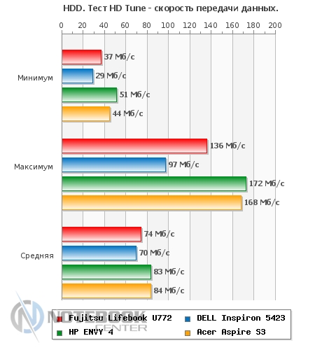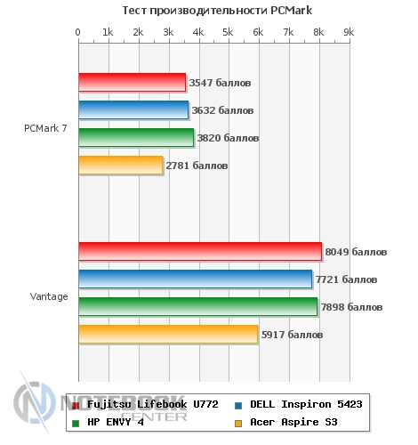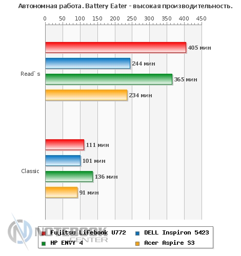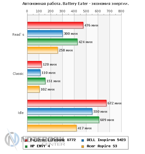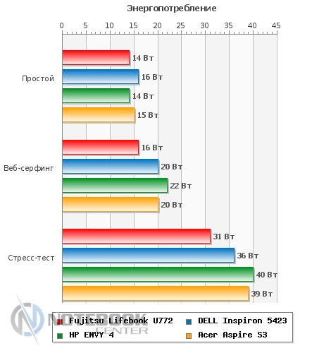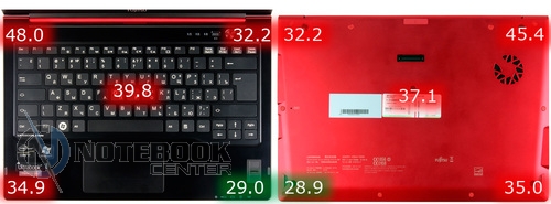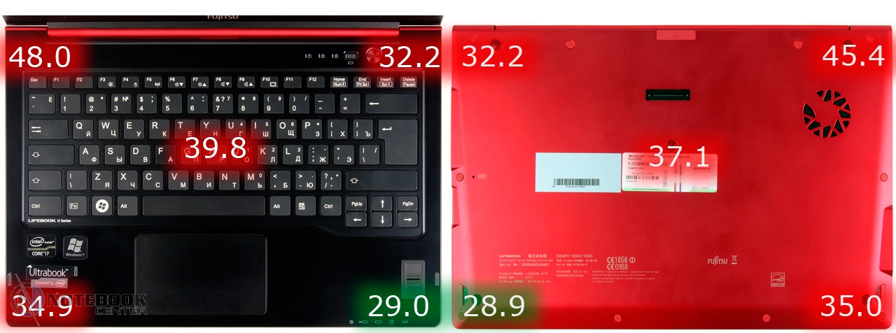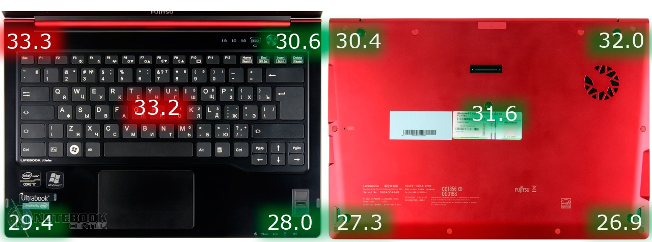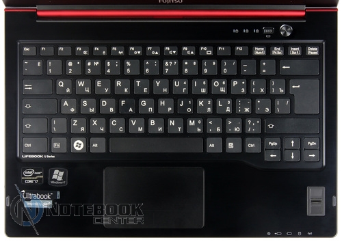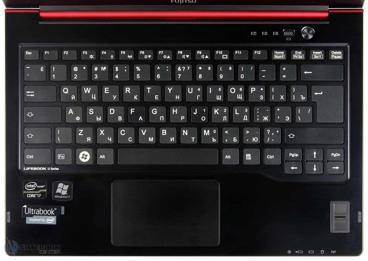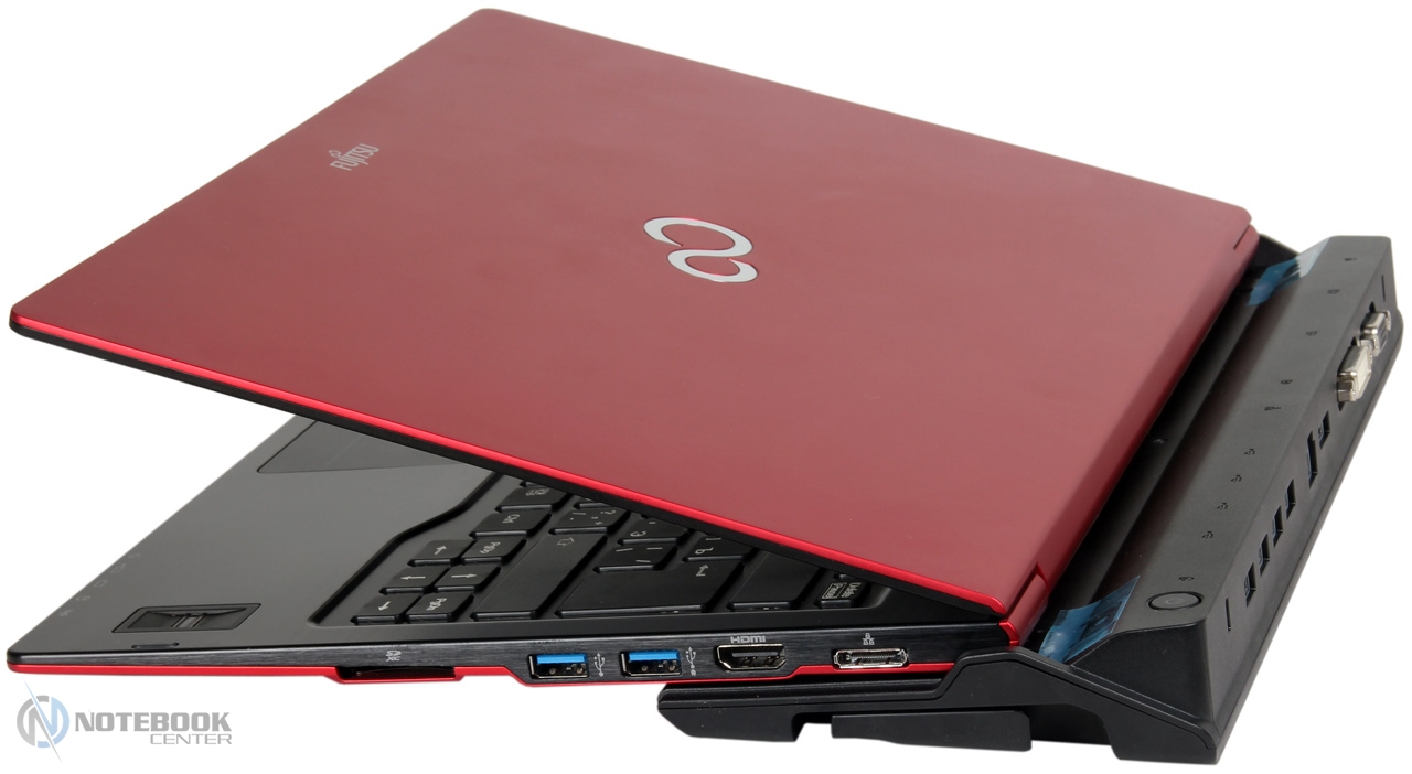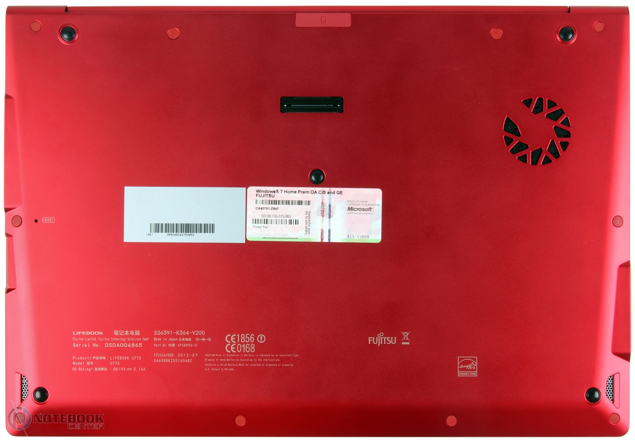 Комплект поставкиКомплектацию ультрабука LIFEBOOK U772 нельзя назвать стандартной и это радует. В первую очередь стоит отметить наличие двух блоков питания – один на 65 Вт, а второй на 100 Вт, что позволит самостоятельно выбирать мощность, с которой ваш ноутбук будет заряжаться, а, следовательно, и время зарядки. Также в комплекте идет докстанция, что является огромным плюсом, как минимум из-за большого количества дополнительных портов, о которых мы расскажем несколько позже. Прилагается еще и переходник с мини-разъема LAN на Ethernet. Ну и, конечно, несколько инструкций о том, как быстро начать работу, указания по технике безопасности и перечень официальных сервисных центров. Есть также диск с 64-битной операционной системой Windows 7 Home Premium SP 1. ![]() ДизайнУльтрабук LIFEBOOK U772 влюбляет в себя с первого взгляда за счет прекрасного цветового решения, формы и материалов. К нам попала модель, выполненная в красно-черных тонах, что уже само по себе выглядит очень эффектно, хотя производитель предлагает еще и темно-серебристую расцветку. ![]() Корпус ноутбука имеет четкую прямоугольную форму с лишь слегка закругленными углами. Верхняя крышка сделана из гладкого металла, а в центре располагается хромированный логотип компании – стилизованный знак бесконечности. Для того чтобы в ноутбуке был отличный сигнал Wi-Fi и 4G у переднего края крышки, где находятся антенны, есть вставка из пластика, но переход между двумя материалами не заметен вовсе. На гладком металле отпечатки пальцев хоть и остаются, но они практически не видны, да и легко удаляются. ![]() Днище ноутбука выполнено из металла, окрашенного в красный цвет, и полностью монолитно. От внутренней начинки, в том числе и батареи, нас отделяют десять шурупов, спрятанных за резиновыми заглушками. Тут же есть пять маленьких резиновых ножек, которые должны предотвращать движение ноутбука по гладкой поверхности стола, но, тем не менее, он пусть незначительно, но скользит. Впрочем, движению такого легкого ноутбука могли бы помешать разве что присоски. ![]() На днище также находятся кнопка экстренного выключения в случае зависания системы, а также вентиляционная решетка, плюсом которой можно назвать интересную стильную форму (которой, к сожалению, никто не увидит), а минусом – очень маленький размер. Впрочем, посмотрим позже, как этот ноутбук справится с тестом на нагрев. ![]() Внутренняя поверхность ноутбука черная, такого же цвета боковые и передняя грань. Открывается крышка очень мягко, при этом, не поднимая за собой нижнюю часть, так что справиться с этой задачей можно и одной рукой. Кстати, угол раскрытия у него довольно большой – около 160 градусов. ![]() Внутри, под клавиатурой, с правой стороны рабочей поверхности расположен сканер отпечатка пальца, ставший уже привычным атрибутом для ноутбуков бизнес серий. ![]() О дизайне док-станции, по большому счету, сказать нечего – она монолитна и очень компактна, выполнена из прочного черного матового пластика, на котором отчетливо остаются отпечатки пальцев. Но не думаю, что это является большой проблемой, учитывая, что ноутбук ее почти полностью скрывает под собой. Днище также монолитно, но, открутив 12 шурупов, вы сможете попасть внутрь. ![]() В целом, внешний вид ультрабука LIFEBOOK U772 вызывает самые положительные эмоции, к тому же, качество сборки тут также на очень высоком уровне 
