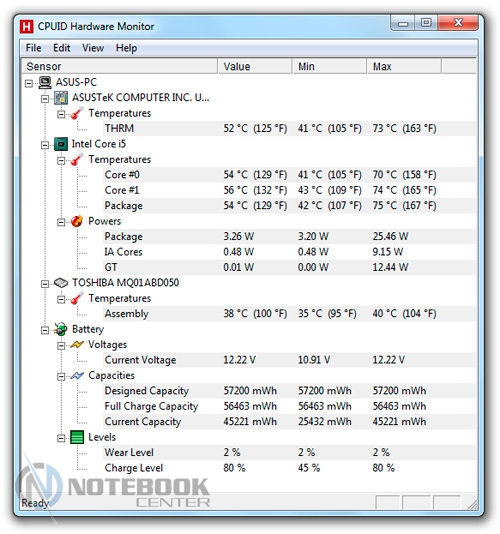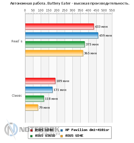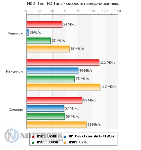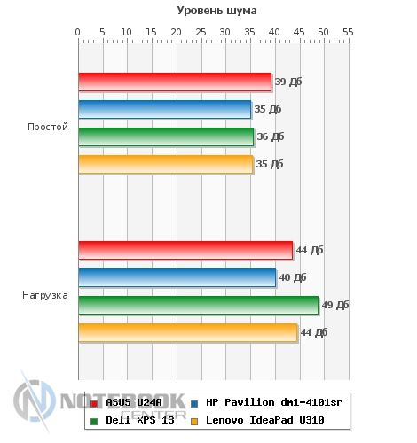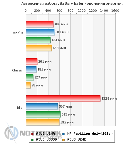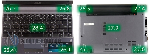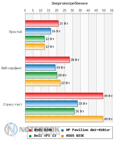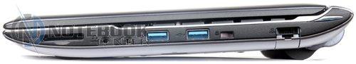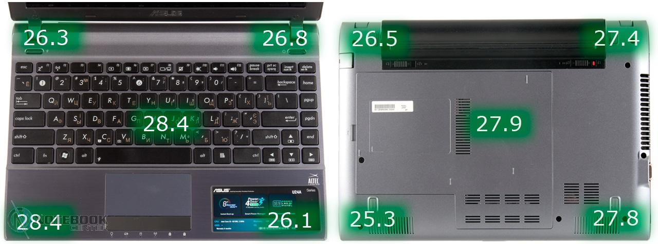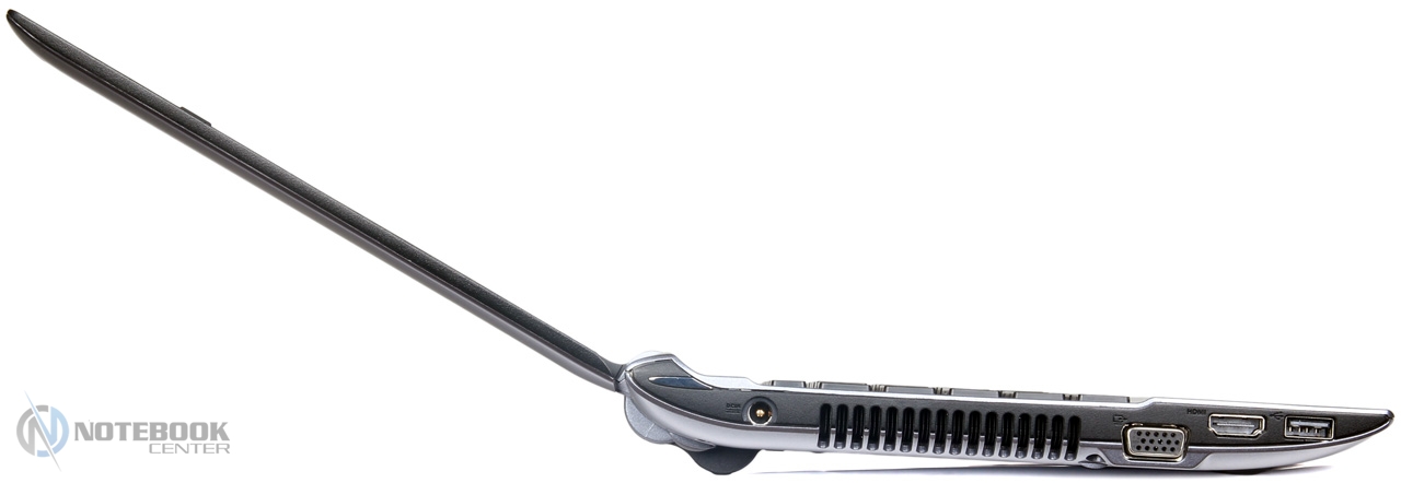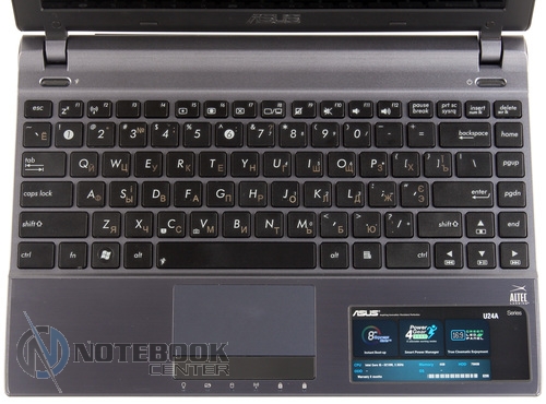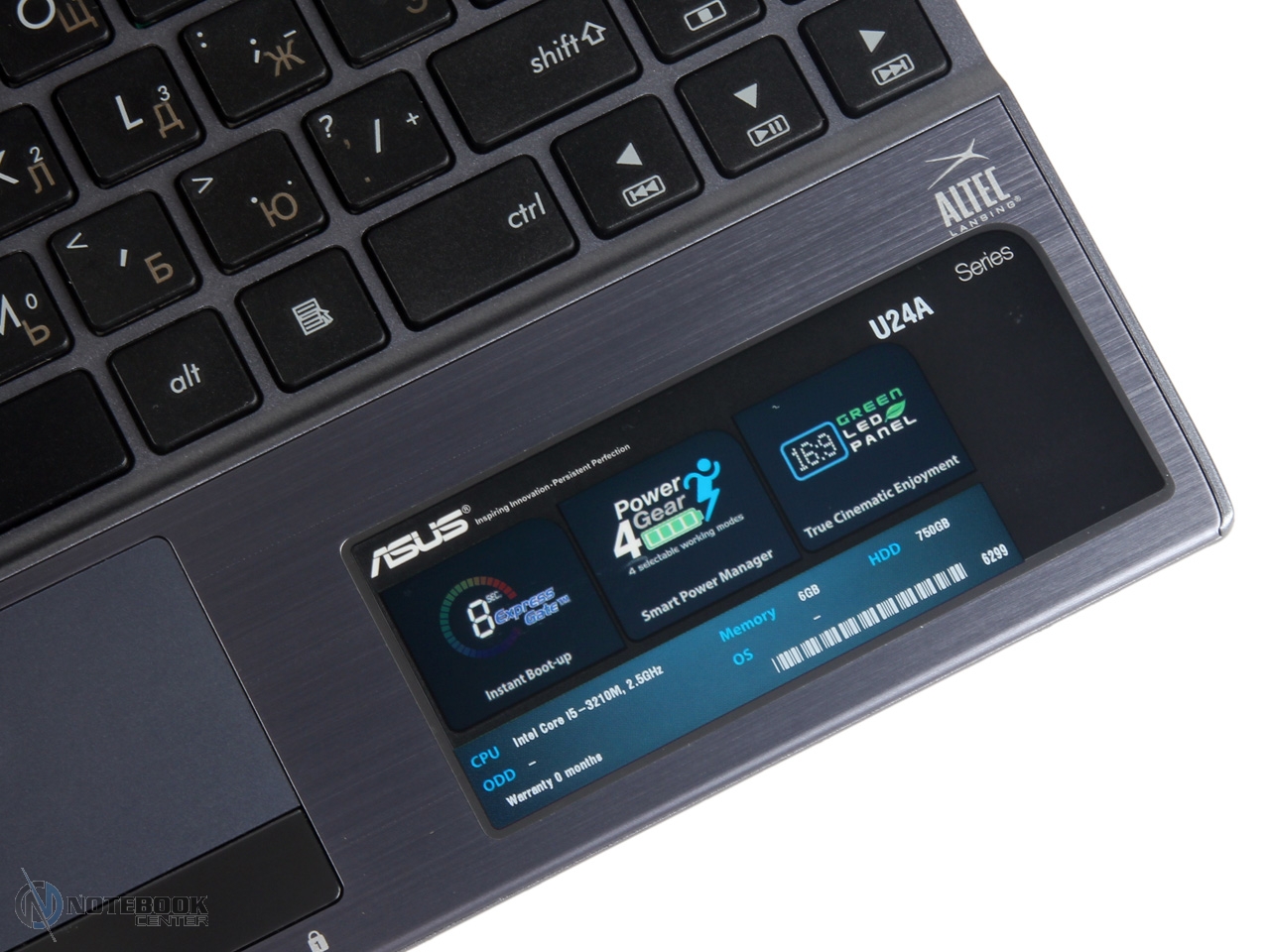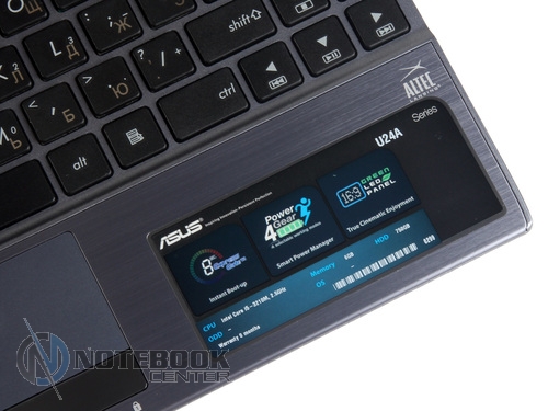 Комплект поставкиК нам на тестирование пришел инженерный образец, поэтому мы не можем точно сказать, как будет укомплектован ноутбук для продажи. Во всяком случае, в нашей упаковке была аккумуляторная батарея и блок питания, который не слишком порадовал своими крупными габаритами и весом 360 граммов. Скорее всего, комплектация будет включать гарантийные документы и инструкцию по эксплуатации. ![]() ДизайнНоутбук имеет корпус размерами 292х206х27-11 мм. Внешний вид ноутбука ASUS U24A, в принципе, как и габариты, мало чем отличается от U24E – края этого устройства обтекаемые, сужаются к фронтальному торцу, углы закруглены. Тем не менее, общее впечатление о дизайне – это строгость и минимализм. Впрочем, таким и должен быть ноутбук, направленный на учебу, выполнение бизнес-задач или офисной работы. ![]() Заметим, что корпус ноутбука может иметь, как серую, так и красную, ближе к бордовой, расцветку. У нас на тестировании был сэмпл серого цвета. Впрочем, даже в такой гамме ноутбук выглядит стильно, в частности, благодаря шлифовке на крышке. Данное решение далеко не единственный плюс, ведь U24A заключен в прочный алюминиевый корпус, который поможет частично избежать повреждений извне. Кстати, использование такого металла нисколько не скажется на чрезмерном утяжелении ноутбука. ASUS U24A весит 1.48 кг. К сказанному остается добавить, что крышка ноутбука сделана не только из алюминиевого сплава. Верхняя ее часть – пластик. За ним скрыта антенна беспроводной сети. На внешней поверхности расположен неизменный логотип ASUS. ![]() Интерьер ноутбука выполнен в серой и черной гамме. Кнопки клавиатуры черные, тогда как серая расцветка варьируется от темно-серой на рамке дисплея, до светло-серой на рабочей площадке. ![]() Интересно, что шарниры, на которых удерживается дисплей, имеют также два цвета – верхняя часть петель темная, нижняя – светлее. Угол раскрытия экрана составляет 145 градусов, чего будет достаточно для любой работы. ![]() Заметим, что в интерьере преобладает матовая поверхность и лишь несколько хромированных элементов освежают такой скромный облик – логотип ASUS, две кнопки над клавиатурой и клавиша под тачпадом. ![]() Внизу ноутбука использован матовый пластик. На нижней панели можно увидеть вентиляционные отверстия и большой отсек, за которым скрыты внутренние компоненты – оперативная память и жесткий диск. Также на днище есть две решетки, за которыми спрятаны стереодинамики, и четыре резиновые ножки, позволяющие избежать ненужного скольжения на плоскости. Кстати, дополнительную устойчивость ноутбуку ASUS U24A создает и продолговатая полоса, расположенная вдоль выступающей батареи. АКБ отсоединяется/закрепляется с помощью специального ползунка. Когда аккумулятор вставлен, происходит характерный щелчок. ![]() К вышесказанному добавим, что ноутбук собран очень хорошо. Даже сэмпл не имел в корпусе зазоров и детали были закреплены на совесть. Дисплей, звук и веб-камераВ ультрапортативном ноутбуке ASUS U24A установлен 11.6-дюймовый жидкокристаллический дисплей AU Optronics B116XW02 V0, имеющий разрешение 1366х768 пикселей. На таком экране символы выглядят мелковатыми, впрочем, это на любителя. Во всяком случае, значки уменьшены не настолько сильно, что надо напрягаться, чтобы что-нибудь рассмотреть. То же самое можно сказать и в отношении иконок на рабочем столе, они хорошо видны 