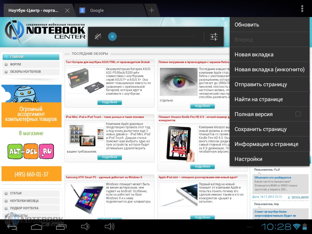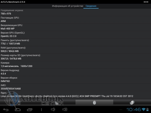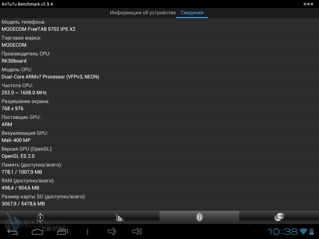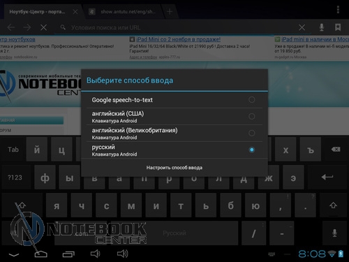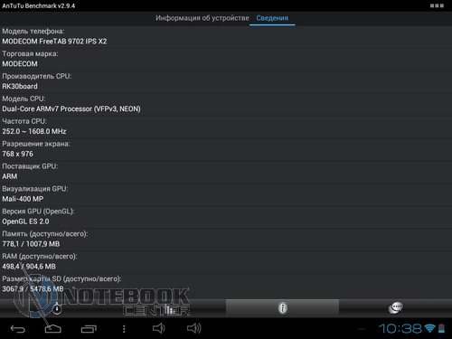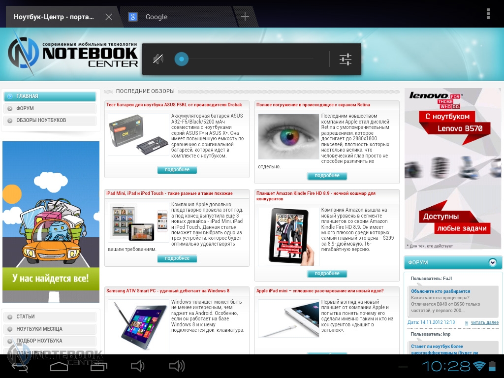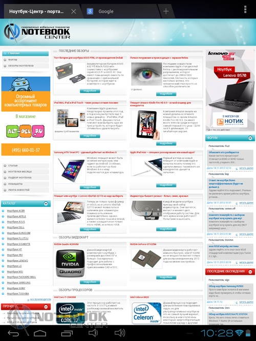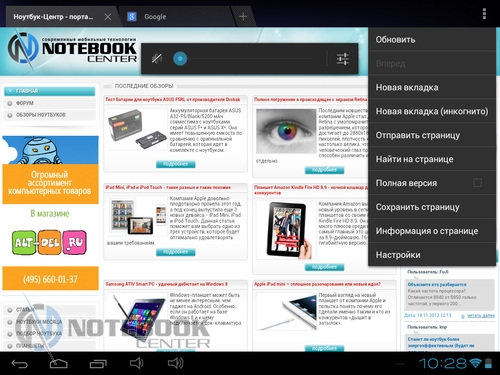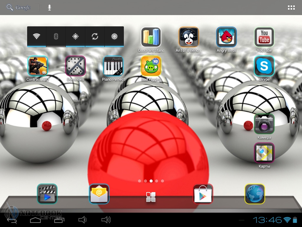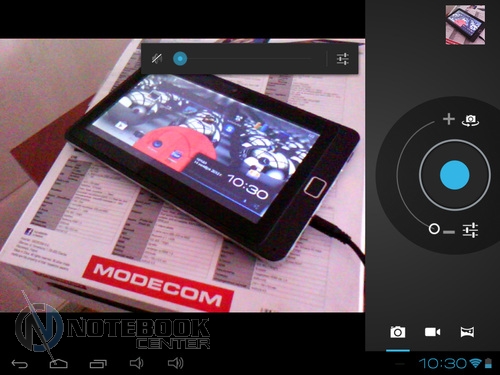 Комплект поставкиКомплект поставки не особо богат, но может предложить покупателю все самое необходимое: собственно сам планшет, набор руководств пользователя и зарядное устройство. Кроме того, в комплект поставки также вошли наушники и переходник Mini-USB/USB. ![]() ДизайнПожалуй, первое, чем привлекает этот планшет - это дизайн. Он изготовлен из качественных и довольно приятных материалов, к тому же габариты позволяют его всегда держать при себе. В руках планшет лежит просто отлично, этому способствуют его закругленные края и довольно малая толщина корпуса - всего в 9.6 мм. ![]() Если говорить о целевой аудитории, не беря во внимание начинку планшета, а более детально останавливаясь на его внешнем виде, то я бы сказал, что он подойдет почти каждому человеку. Его дизайн одновременно можно назвать и нейтральным и в тоже время располагающим. ![]() Что касается материалов из которых он изготовлен, то рамка дисплея выполнена из пластика, а задняя крышка из алюминия. К качеству сборки претензий также нет, зазоры и другие изъяны отсутствуют. Да и такая проблема, как прогиб задней крышки, присущий многим планшетам, отсутствует. ![]() Габариты устройства составляют 243х190х9.6 мм, а весит он 578 грамм. Дисплей, звук, камераВот мы и подошли к одному из самых главных достоинств этого планшета – его дисплею. Для такой недорогой модели как наша, это, несомненно, основной плюс. Разрешение 9.7-дюймового дисплея составляет 1024х768 пикселей при соотношении сторон 4:3. Такого разрешения вполне хватает, чтобы с комфортом просматривать веб-страницы или смотреть фильмы. ![]() Кстати основным достоинством матриц, которые выполнены по IPS технологии являются отличные углы обзора. Просмотр фильма на этом планшете в компании близких вам людей явно будет удовольствием, а не наоборот. ![]() Ниже на скриншоте можно увидеть, как выглядит стандартный плеер для воспроизведения видео, в котором проигрывается Full HD видео. ![]() Размер дисплея позволяет с большим удобством просматривать веб-страницы, чем на 7-дюймовом планшете. Чуть ниже виден пример нескольких скриншотов сделанных в браузере. ![]() ![]() ![]() Емкостный экран поддерживает до 10-ти одновременных касаний, а сенсорный ввод и управление осуществляются четко и без каких-либо проблем. Качество выдаваемого звука вполне привычное для планшетов, более выражены средние и высокие частоты, искажения отсутствуют. Ниже виден скриншот сделанный в стандартном плеере. ![]() В планшете имеют две веб-камеры. И основная камера, и фронтальная имеют одинаковое разрешение, которое составляет 1600х1200 пикселей. Это конечно не Full HD, но при необходимости планшет может заменить вам фотоаппарат, а фронтальная камера лучше подойдет для общения по Skype. ![]() ![]() Стандартный интерфейс приложения, с помощью которого можно делать снимки и снимать видео вы можете увидеть на скриншоте ниже. Здесь присутствует бегунок зума, различного рода настройки, выбор качества изображения и другие. ![]() Хотя обе камеры и имеет одинаковое разрешение, но качество снимков все же чуть отличается. Ниже вы можете увидеть фотографию, сделанную с помощью основной камеры. ![]() А вот такое изображение получилось с помощью фронтальной камеры. ![]() КлавиатураДля управления планшетом предусмотрено пять основных сенсорных (программных) клавиш, а также целых 5 физических клавиш. Такое количество физиче