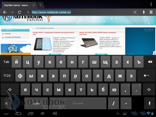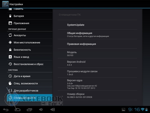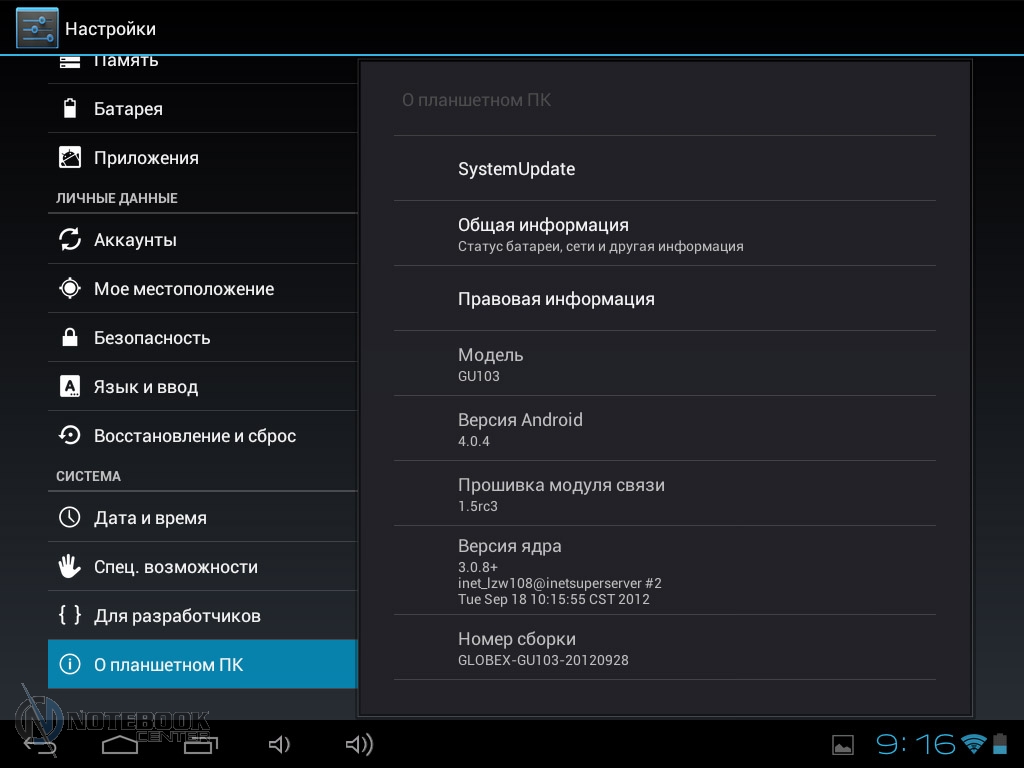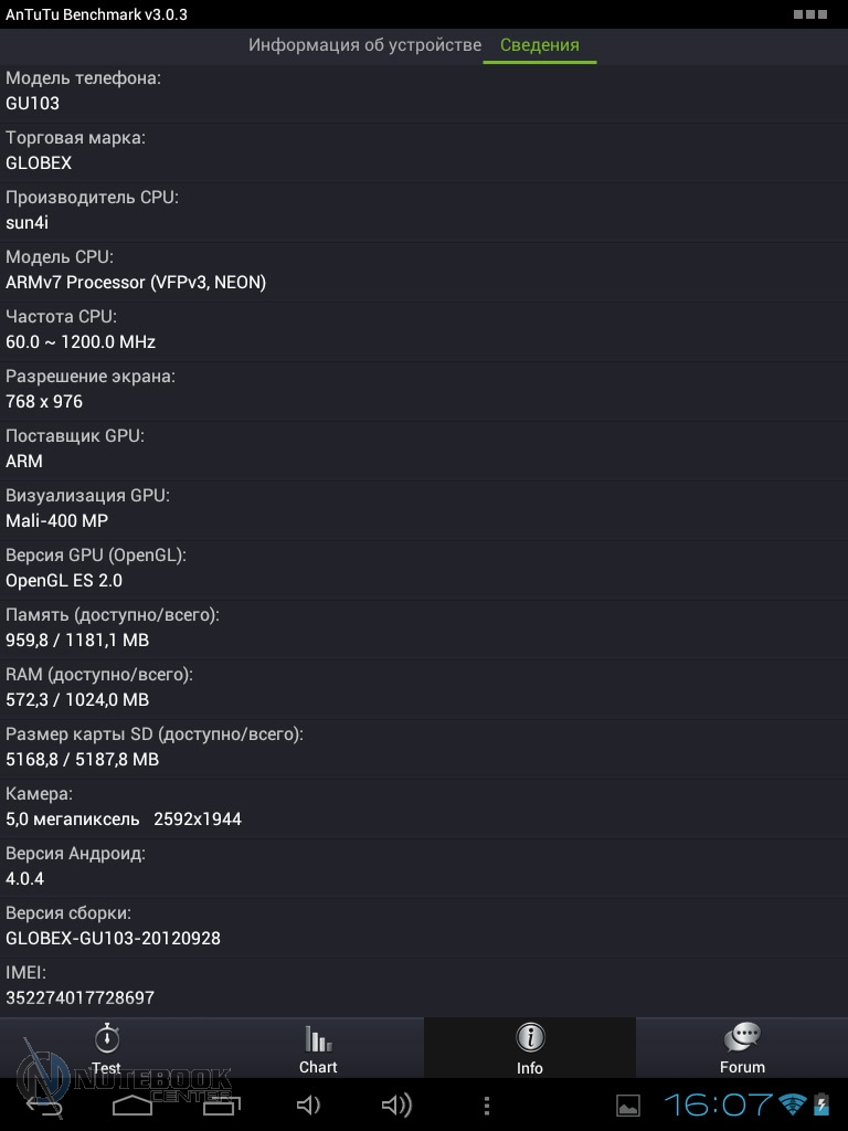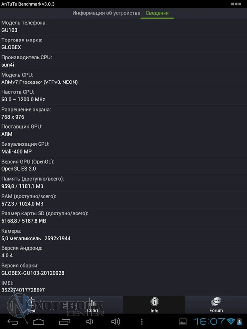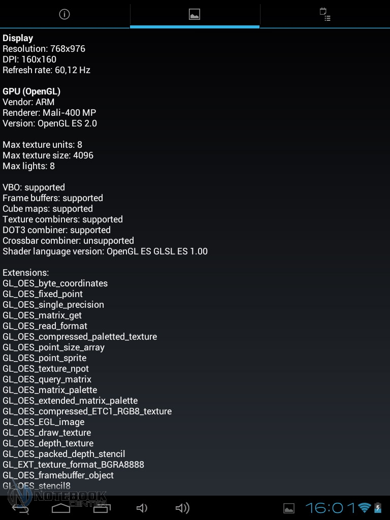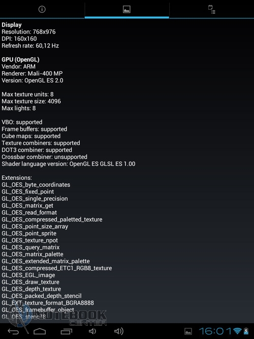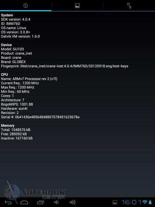 Комплект поставкиПланшет поставляется в черной коробке, в которой кроме самого устройства можно найти кабель USB/Micro-USB и переходник Micro-USB/USB-OTG. Кроме того, там еще была одна небольшая книжечка, которая оказалась инструкцией, причем написана она только на украинском языке. ![]() ![]() ДизайнПланшет не выглядит скучно и однообразно, хотя каких-либо уникальных дизайнерских решений в нем нет. Передняя сторона, выполнена из темного пластика и покрыта защитным стеклом, также из черного пластика выполнены и боковые грани планшета. ![]() Задняя крышка изготовлена из алюминия с едва заметной шероховатой поверхностью (которая ощутима в сравнении с гладким пластиком), что касается цвета, то она серебристая. ![]() В руках планшет кажется чуть тяжеловатым, но со временем понимаешь, что это нормальный вес для 9.7-дюймовой модели. Главное, что Globex GU103C не только удобно держать, но и безопасно, так как он не выскальзывает из рук. Что касается формы планшета, то благодаря соотношению сторон 4:3, Globex GU103C не смотрится слишком вытянутым. Еще очень скрашивает эту модель наличие закругленных углов. Качество материалов хорошее, правда на лицевой части планшета остается очень много отпечатков пальцев, а вот на задней стороне Globex GU103C, выполненной из алюминия, они почти не остаются. ![]() Размеры и габариты Globex GU103C соответствуют стандартным показателям для 9.7-дюймовых планшетов. Заявленные производителем размеры устройства совпадают с теми, что были замерены нами – 242х189х9.2 мм, а вот вес не совпал. Указанные в документации 660 грамм, на деле оказались 691 граммом, разница небольшая, но все же. Дисплей, звук и веб-камераGlobex GU103C оснащен 9.7-дюймовым сенсорным дисплеем, а если быть конкретнее, то емкостным дисплеем. ![]() Его качество среднее, во многом на восприятии картинки влияет не очень большое разрешение, которое составляет 1024х768 пикселей. ![]() ![]() ![]() Но видимое разрешение не всегда соответствует 1024х768 пикселей, так как полоса, на которой располагаются сенсорные кнопки операционной системы «съедает» часть изображения. Что касается углов обзора, то они не очень большие, но работать с планшетом вполне удобно. ![]() Даже, несмотря на не очень большое разрешение, и не идеальное качество матрицы, просматривать веб-страницы и читать книги очень удобно благодаря большой диагонали дисплея. ![]() ![]() ![]() ![]() Кроме чтения электронных книг и веб-серфинга, планшет также можно использовать и для прослушивания музыки. В основном, люди слушают музыку, подключая к устройству наушники, но если вам захочется насладиться любимой песней через встроенные динамики, то вы не разочаруетесь. Они расположены на задней стороне планшета и обладают средним запасом громкости, а также неплохим качеством, возможно, есть небольшие шумы, но этим грешат даже дорогие планшеты. ![]() В любом случае, акустика является сильной стороной этого планшета, учитывая его стоимость. Ниже виден скриншот стандартного плеера, с довольно простым интерфейсом. ![]() Globex GU103C располагает сразу двумя камерами, конечно, сейчас этим никого не удивишь, но как для бюджетного устройства очень даже неплохо. Фронтальная веб-камера имеет разрешение 1.3 Мп и служит для видеозвонков, например, с помощью Skype. ![]() Основная камера имеет разрешение 5 Мп, что позволяет фотографировать и снимать видео, с вполне приличным качеством. ![]() Ниже приведены примеры 