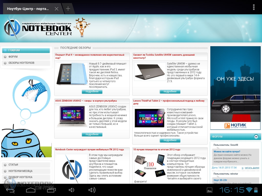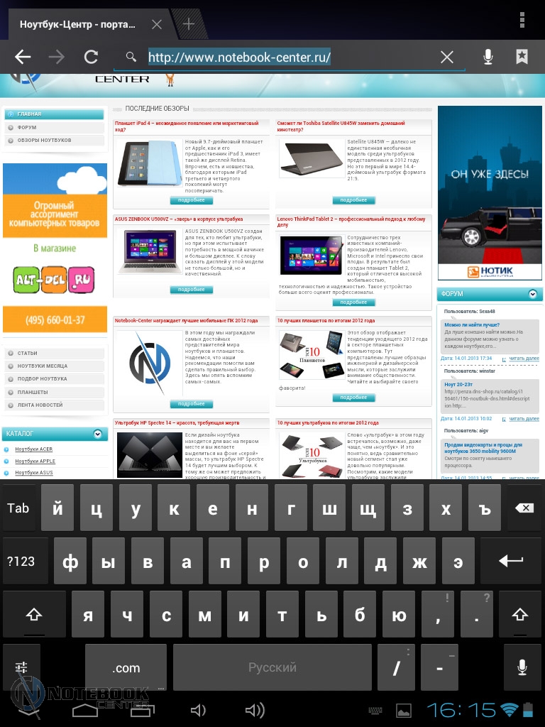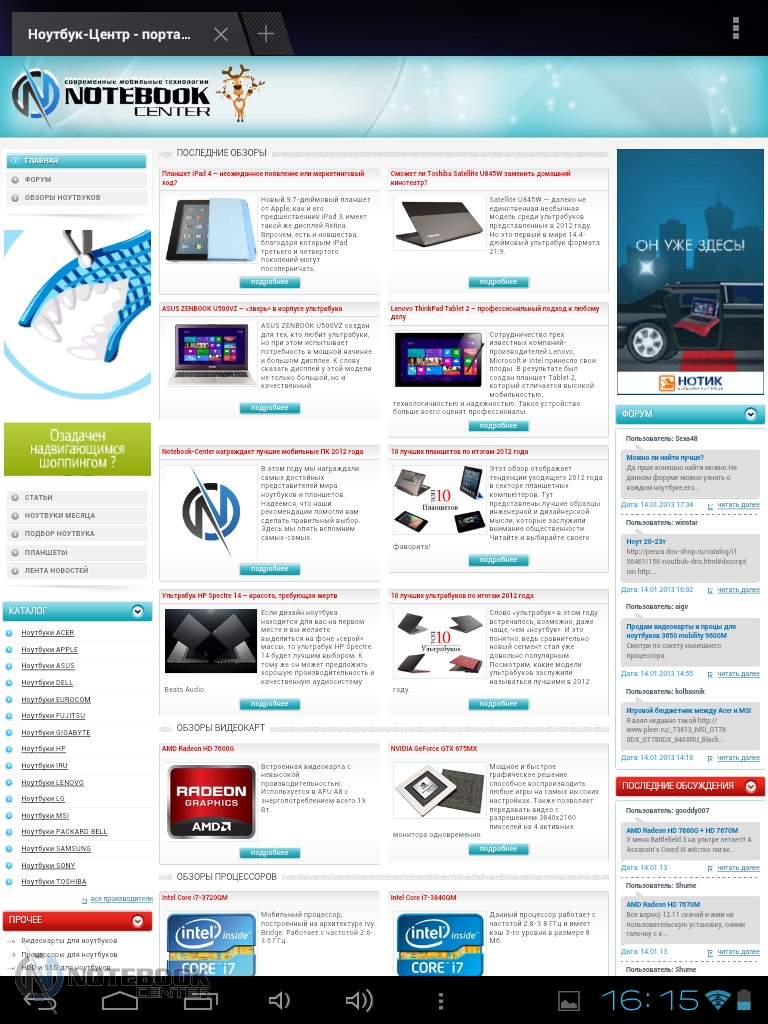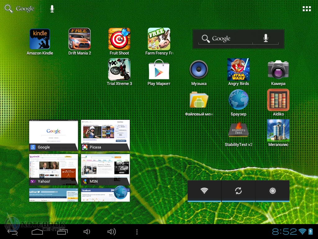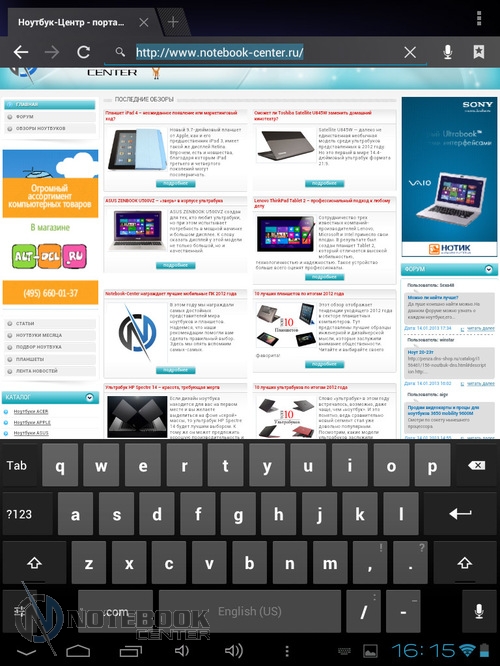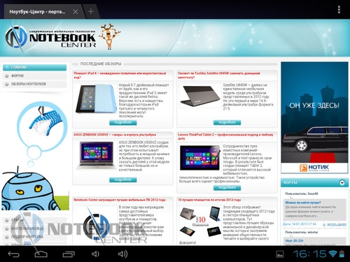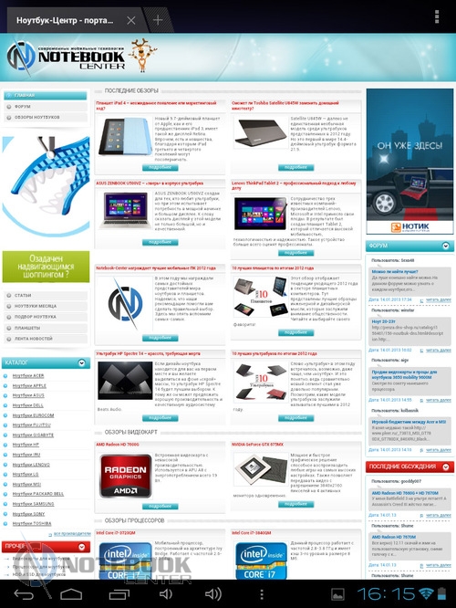 Комплект поставкиПланшет поставляется в черной коробке, в которой кроме самого устройства можно найти кабель USB/Micro-USB и переходник Micro-USB/USB-OTG. Кроме того, там еще была одна небольшая книжечка, которая оказалась инструкцией, причем написана она только на украинском языке. ![]() ![]() ДизайнПланшет не выглядит скучно и однообразно, хотя каких-либо уникальных дизайнерских решений в нем нет. Передняя сторона, выполнена из темного пластика и покрыта защитным стеклом, также из черного пластика выполнены и боковые грани планшета. ![]() Задняя крышка изготовлена из алюминия с едва заметной шероховатой поверхностью (которая ощутима в сравнении с гладким пластиком), что касается цвета, то она серебристая. ![]() В руках планшет кажется чуть тяжеловатым, но со временем понимаешь, что это нормальный вес для 9.7-дюймовой модели. Главное, что Globex GU103C не только удобно держать, но и безопасно, так как он не выскальзывает из рук. Что касается формы планшета, то благодаря соотношению сторон 4:3, Globex GU103C не смотрится слишком вытянутым. Еще очень скрашивает эту модель наличие закругленных углов. Качество материалов хорошее, правда на лицевой части планшета остается очень много отпечатков пальцев, а вот на задней стороне Globex GU103C, выполненной из алюминия, они почти не остаются. ![]() Размеры и габариты Globex GU103C соответствуют стандартным показателям для 9.7-дюймовых планшетов. Заявленные производителем размеры устройства совпадают с теми, что были замерены нами – 242х189х9.2 мм, а вот вес не совпал. Указанные в документации 660 грамм, на деле оказались 691 граммом, разница небольшая, но все же. Дисплей, звук и веб-камераGlobex GU103C оснащен 9.7-дюймовым сенсорным дисплеем, а если быть конкретнее, то емкостным дисплеем. ![]() Его качество среднее, во многом на восприятии картинки влияет не очень большое разрешение, которое составляет 1024х768 пикселей. ![]() ![]() ![]() Но видимое разрешение не всегда соответствует 1024х768 пикселей, так как полоса, на которой располагаются сенсорные кнопки операционной системы «съедает» часть изображения. Что касается углов обзора, то они не очень большие, но работать с планшетом вполне удобно. ![]() Даже, несмотря на не очень большое разрешение, и не идеальное качество матрицы, просматривать веб-страницы и читать книги очень удобно благодаря большой диагонали дисплея. ![]() ![]() ![]() ![]() Кроме чтения электронных книг и веб-серфинга, планшет также можно использовать и для прослушивания музыки. В основном, люди слушают музыку, подключая к устройству наушники, но если вам захочется насладиться любимой песней через встроенные динамики, то вы не разочаруетесь. Они расположены на задней стороне планшета и обладают средним запасом громкости, а также неплохим качеством, возможно, есть небольшие шумы, но этим грешат даже дорогие планшеты. ![]() В любом случае, акустика является сильной стороной этого планшета, учитывая его стоимость. Ниже виден скриншот стандартного плеера, с довольно простым интерфейсом. ![]() Globex GU103C располагает сразу двумя камерами, конечно, сейчас этим никого не удивишь, но как для бюджетного устройства очень даже неплохо. Фронтальная веб-камера имеет разрешение 1.3 Мп и служит для видеозвонков, например, с помощью Skype. ![]() Основная камера имеет разрешение 5 Мп, что позволяет фотографировать и снимать видео, с вполне приличным качеством. ![]() Ниже приведены примеры 
