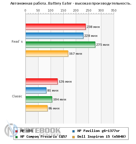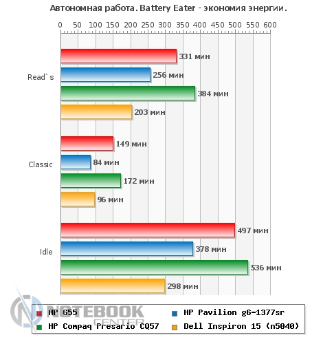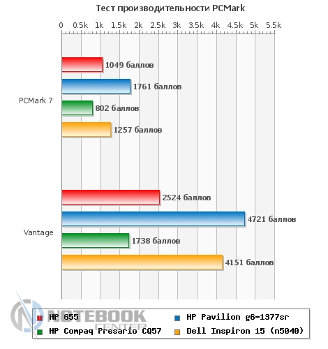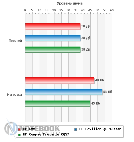 Комплект поставкиВ комплект поставки HP 655, кроме самого ноутбука, входят зарядное устройство, инструкции по установке на нескольких языках, буклет предлагаемых аксессуаров и информационный лист с данными телефонов и сайтов официальных представительств компании HP по всему миру. Кроме того, дополнительным бонусом к данному бюджетному ноутбуку является симпатичная сумка черного цвета. ![]() ДизайнКакими-то особенными внешними данными HP 655 не отличается. Полностью пластиковый корпус типичен для бюджетных лэптопных моделей, а черно-серые тона в некоторой степени усиливают это впечатление. Тем не менее, все сделано предельно аккуратно и добросовестно, при тестировании скрипы или какие-либо другие погрешности замечены не были. ![]() Крышка ноутбука матовая, серого цвета. Это дает некоторые преимущества, поскольку на такой поверхности отпечатки пальцев практически не заметны. В центральной части верхней крышки разместился фирменный логотип компании Hewlett-Packard. ![]() Внутри HP 655 также самый обычный. Достаточно широкая матовая рамка черного цвета ограничивает дисплей. Для предотвращения тесного контакта экрана с клавиатурой при закрытом положении ноутбука, на рамку поместили несколько резиновых прокладок. Они довольно объемные, поэтому вероятность повреждений или появление каких-то других неприятных явлений на внутренней части лэптопа, таким способом сведены к минимуму. Клавиатурный блок и тачпад небольшие, ярко выражены компактность и простота исполнения. ![]() На днище расположились несколько блоков вентиляционных решеток. Кроме того, для более легкого доступа к некоторым внутреннем компонентам, HP 655 обеспечен съемными крышками в соответствующих местах, так что провести апгрейд устройства не составит особого труда. ![]() Габариты HP 655 составляют 376x247x35.8 мм, масса 2.3 кг, хотя на официальном сайте вес указан немножко другой – 2.45 кг. Дисплей, звук и веб-камераДисплей HP 655 с размерами 15.6 дюймов имеет разрешение 1366х768 точек. Это простая TN-матрица с не самой лучшей цветопередачей, углами обзора и контрастностью, однако не стоит забывать, что HP 655 – классика бюджетной линейки, а значит какими-либо феноменальными способностями он не обладает априори. ![]() Углы обзора еще более менее терпимы в горизонтальной проекции, а вот при изменении положения в вертикальном направлении инвертация изображения выражена очень резко, что, естественно, не добавляет комфорта при просмотре видео. Кроме того, не порадовал уровень яркости дисплея, ее HP 655 явно не хватает. ![]() За воспроизведение звука в HP 655 отвечает акустическая система производства компании Altec Lansing. Динамики спрятали за двумя решетками, симметрично расположенными на переднем скосе ноутбука. Качество звучания у HP 655 нельзя назвать идеальным, недостаточно низких и высоких частот, а вот уровень громкости для бюджетной модели очень даже ничего. ![]() Веб-камера HP 655 имеет разрешение 0.9 Мп, рабочего потенциала которой вполне хватает для обеспечения приемлемого качества видеосвязи. По бокам от камеры находятся светодиодный индикатор работы и микрофон. ![]() Ниже приведены фото, сделанные веб-камерой ноутбука HP 655. ![]() Клавиатура и тачпадДанный ноутбук оснащен небольшой клавиатурой, удобно расположенной в углублении на рабочей поверхности. Она имеет свои особенности – угловые клавиши получились округлым