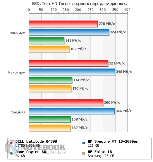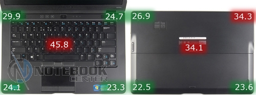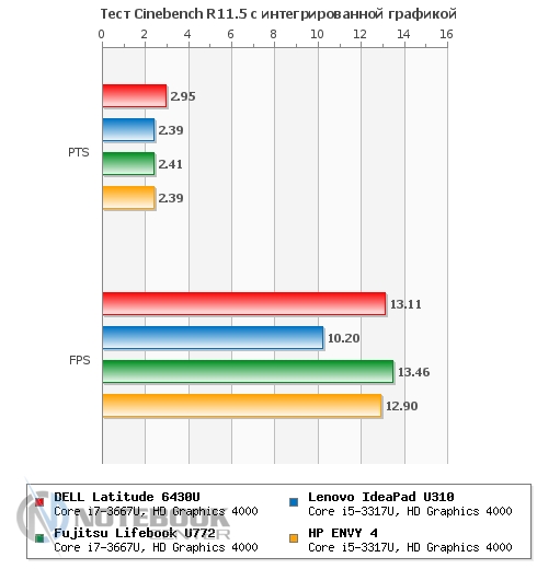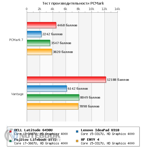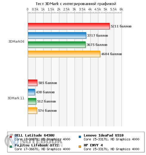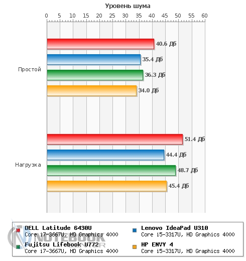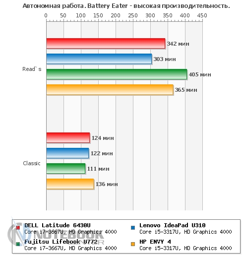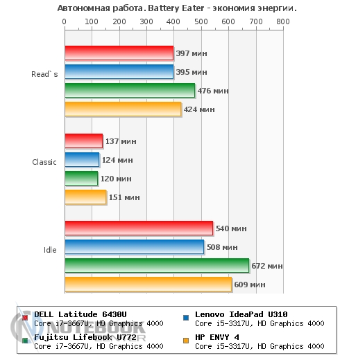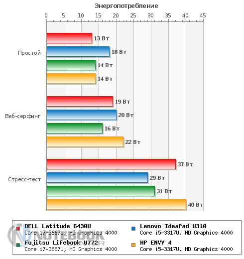 Комплект поставкиК нам на обзор попал инженерный образец, поэтому кроме самого ультрабука в комплекте поставки был только 6-секционный литий-полимерный аккумулятор емкостью 60 Втч и 65-ваттный блок питания для зарядки. ДизайнДизайн Dell Latitude 6430U скорее можно отнести к бизнес-сегменту, чем к имиджевым ультрабукам. Корпус довольно строгий и почти лишен украшений, если не считать логотип компании, обрамленный в металлический круг. В целом, можно сказать, что дизайн выдержан в фирменном стиле Dell. ![]() Что касается материалов отделки, то крышка, днище и подладонная поверхность выполнены из качественного софт-тач пластика, который очень приятен на ощупь, но стоит отметить, что он также успешно собирает пыль, а очищается довольно плохо, поэтому советую иметь средства по уходу за таким покрытием. Также в дизайне применены и другие материалы, так, к примеру, рамка дисплея сделана из обычного пластика, а боковые стороны ультрабука обрамлены по контуру серебристой полосой. К слову, эта полоса придает ноутбуку некую изюминку, но обратной стороной медали является то, что она может быть поцарапана при подключении различных устройств и разъемов, так как именно на этих полосках размещаются все порты. ![]() Корпус ультрабука очень прочный, но отдельно стоит отметить тот факт, что Dell Latitude 6430U прошел тестирование на соответствие стандартам MIL-STD-810G1. Сертификация согласно стандарту MIL-STD-810G1 включает широкий комплекс испытаний для тестирования надежности оборудования, среди которых: работа при высокой и низкой температуре, работа в дождь, устойчивость к тепловому шоку, ударам и падениям. Это единственный ультрабук, который прошел данное тестирование. ![]() Днище ультрабука плоское и разделено на две части, одной из которых является основание устройства, а вторая - съемная батарея. Тут расположено одно небольшое вентиляционное отверстие, а также 4 резиновые ножки по углам. ![]() Если вы заметили, то на днище отсутствуют какие-либо надписи, там нельзя найти даже наклейку с комплектацией устройства. Вся информация об ультрабуке находится под аккумулятором, кроме того, тут также видны различные шлейфы и прочие компоненты ноутбука. ![]() Ультрабук продуман до мелочей, в этом можно убедиться, попытавшись открыть устройство одной рукой. Для этого предусмотрено специальное углубление в корпусе, которое находится чуть ниже тачпада. К тому же петли дисплея позволяют поднимать крышку, не отрывая ультрабук от поверхности, и при всем при этом они сохраняют свою жесткость. ![]() Dell Latitude 6430U хоть и относится к ультрабукам, имеет довольно крупные габариты и вес. К примеру, такие модели как Lenovo IdeaPad U310 и Fujitsu LIFEBOOK U772 весят меньше чем наша тестовая модель. Но Dell Latitude 6430U является полноценной бизнес-моделью, а в сравнении с последними ее вес не так уж высок. Если говорить в сухих цифрах, то мы имеем габариты 338.3x229.5x20.9 мм и массу 1.81 кг. По ощущениям ультрабук весит чуть меньше, а в руках лежит просто отлично, благодаря хорошему распределению веса по сторонам. Дисплей и звукDell Latitude 6430U располагает 14-дюймовым дисплеем с разрешением 1366х768 пикселей. Матрица выполнена по технологии TN, а ее качество можно оценить как среднее. Цветопередача довольно хорошая, а вот яркости немного не хватает. Дисплей подойдет как для работы с документами, так и для просмотра фильмов или фотографий. ![]() Технология, 