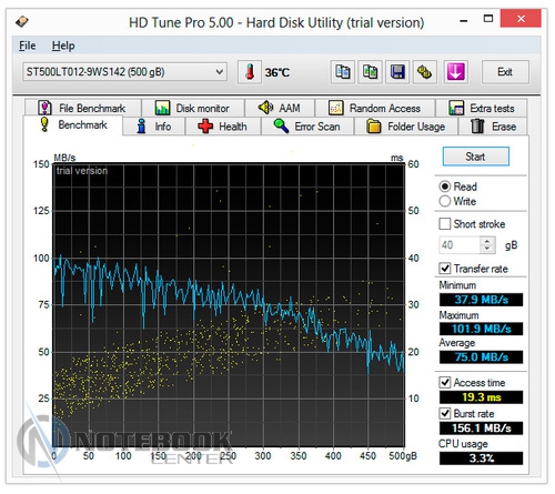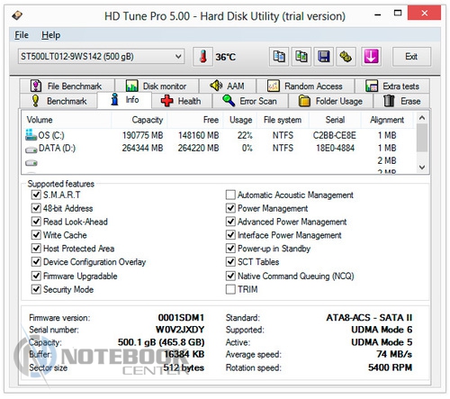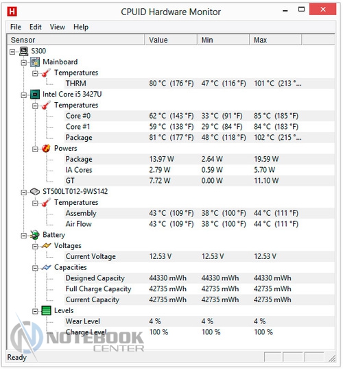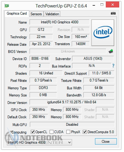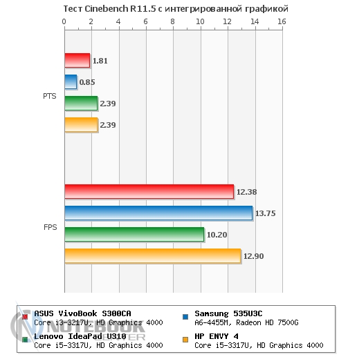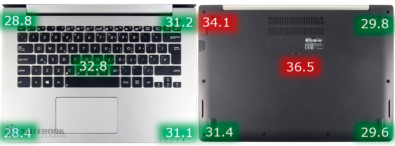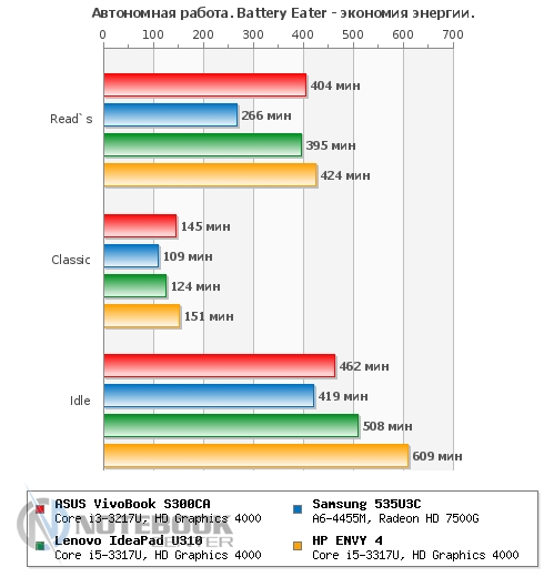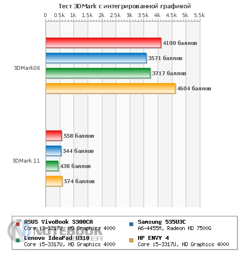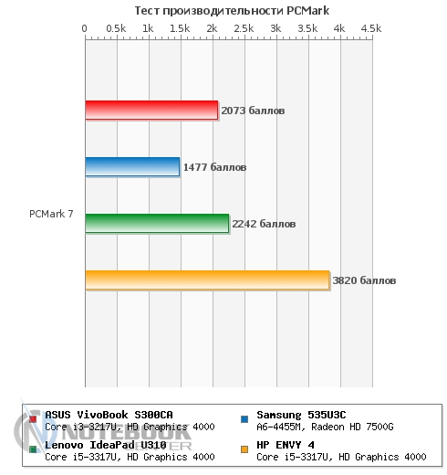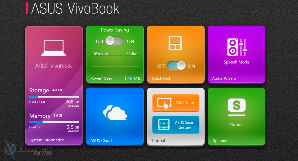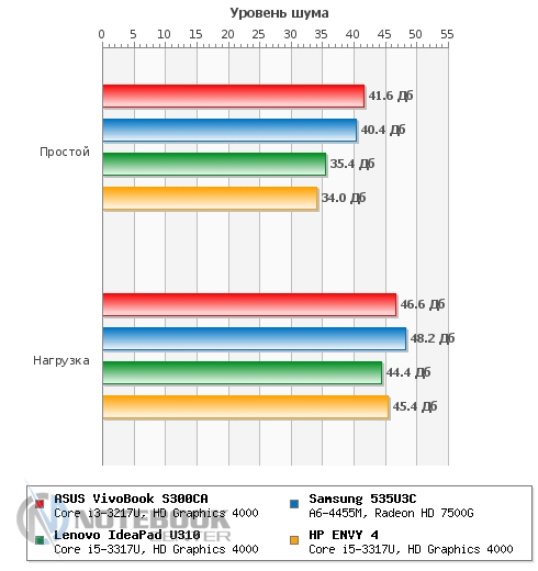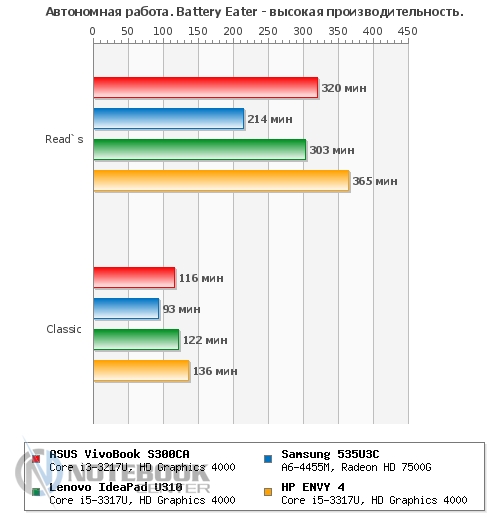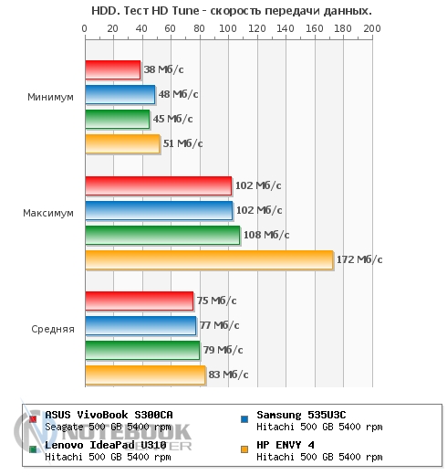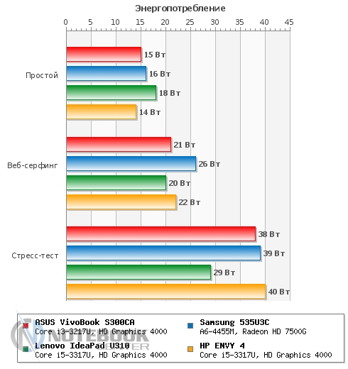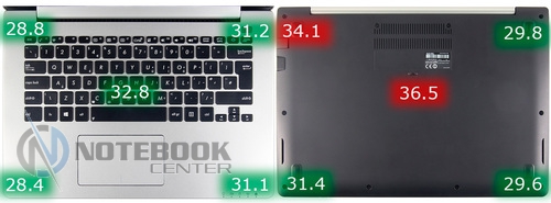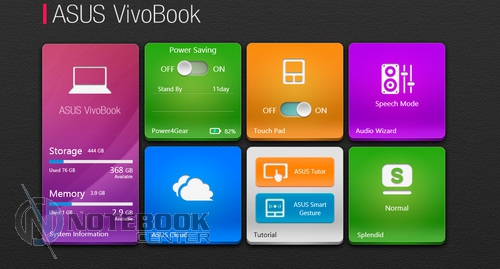 Комплект поставкиУчитывая то, что к нам на тестирование попал тестовый образец, оценить комплект поставки в полной мере мы не можем. Но, как вы уже, наверное, знаете из наших обзоров, ASUS никогда не обижает своих покупателей и предоставляет им все необходимое, чтобы сразу после момента покупки приступить к работе. ![]() ДизайнНоутбук выглядит достаточно просто, оттого не менее элегантно и дорого. Крышка устройства – черная, текстурированная (под шлифовку), выполнена из алюминия, который гораздо практичнее и приятнее пластика. Фирменный логотип компании традиционно расположен посредине крышки. ![]() Качество сборки хорошее, все детали крепко закреплены, не шатаются, корпус, в целом, не прогибается, однако возможен небольшой прогиб в центре клавиатуры. Такая особенность частенько наблюдается у больших ноутбуков, поэтому наличие ее у тестируемой нами модели немного удивило. ![]() Дисплей полностью от края до края покрыт стеклом, что очень удобно, учитывая, что он сенсорный. Окантовкой служит широкая черная рамка, которая добавляет солидности гаджету. ![]() Рабочая поверхность также алюминиевая, правда, цвет у нее серебристый. На нем резким контрастом выделяется черная клавиатура. Она островного типа, клавиши достаточно большие и удобные. Чуть ниже находится тачпад с поддержкой мультитач-жестов. Он немного смещен влево для большего комфорта пользователя. Днище устройства выполнено из черного пластика, бархатистого на ощупь. Чтобы получить доступ к заменяемым компонентам, следует снять крышку, которая присутствует на днище. Там же есть вентиляционное отверстие, и четыре резиновые ножки для фиксации ноутбука на скользких поверхностях. ![]() Подводя итоги, можно сказать, что качество сборки отменное, крышка открывается в меру легко, не шатается и не прогибается. Неотъемлемой частью характеристики ноутбука являются его габариты и вес. Ширина данной модели составляет 33.1 см, длина – 23.4 см, толщина – 2.1 см. Вес гаджета – 1.76 кг. Как видим, такой вес и размеры VivoBook S300CA очень способствуют его мобильности. Дисплей, звук и веб-камераМодель ASUS VivoBook S300CA имеет 13.3-дюймовую TN-матрицу с разрешением 1366×768 пикселей. Разрешение стандартное, современные бюджетные ноутбуки с легкостью составят конкуренцию данной модели по этому параметру. ![]() Углы обзора недостаточно широкие, впрочем, это вполне ожидаемо от такой матрицы. При отклонении дисплея присутствует небольшое искажение цветопередачи. Кроме того, глянцевый экран в солнечную погоду может бликовать. ![]() Матрица ноутбука полностью покрыта стеклом, и это неудивительно, ведь производитель сделал его сенсорным. Учитывая этот момент, стоит приготовиться к тому, что на экране будут видны отпечатки пальцев, к чему, в принципе, поклонники сенсорной техники уже успели привыкнуть. ![]() В линейке VivoBook, конечно же, именно дисплей является ключевым моментом, на который делает особый акцент производитель. По существу, экран здесь – еще одно устройство ввода наравне с клавиатурой и тачпадом. При этом использовать сенсор дисплея оказалось удобно и ни капли не обременительно. Отклик очень быстрый, ничего не тормозит и не подвисает, дважды кликать нет необходимости. Единственное, что длительность работы с сенсорным экраном может быть ограничена из-за возникающего дискомфорта в руках, ведь они, по сути, все время находя