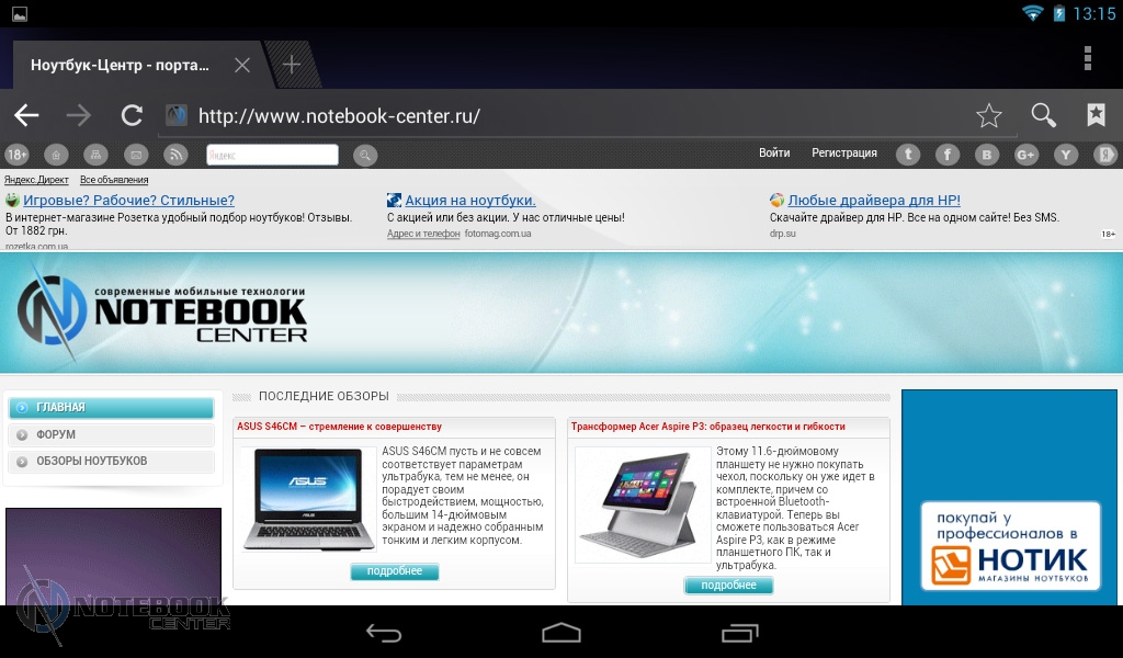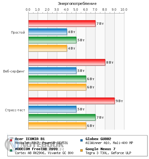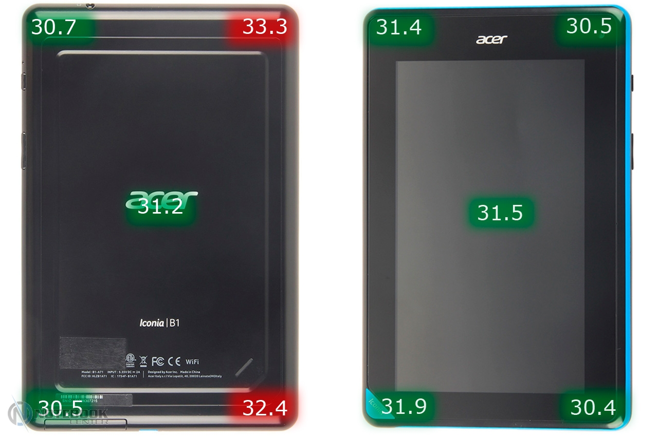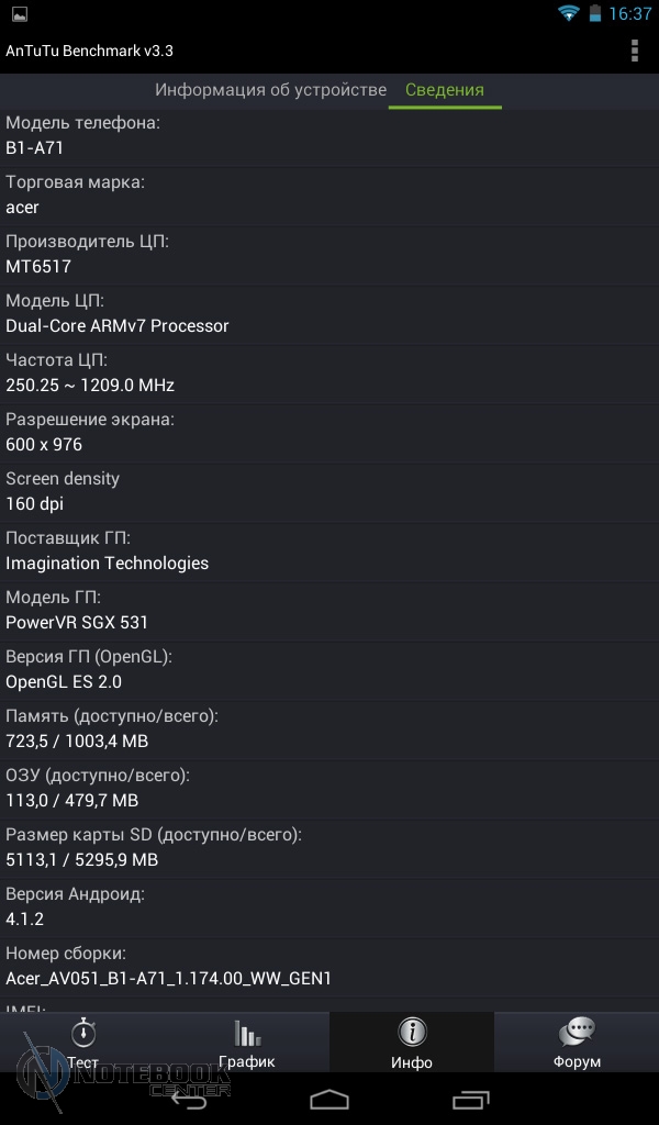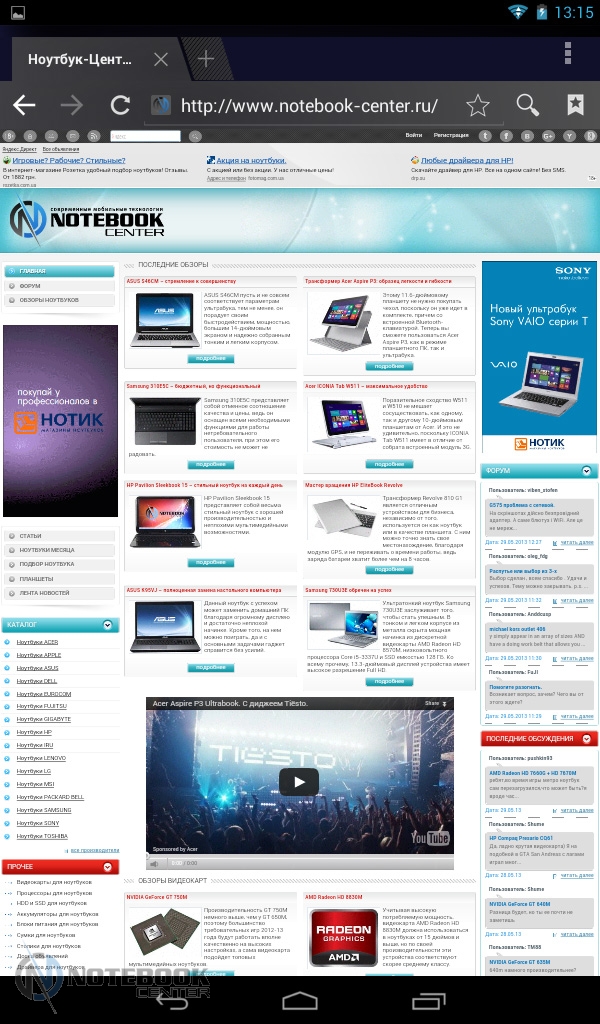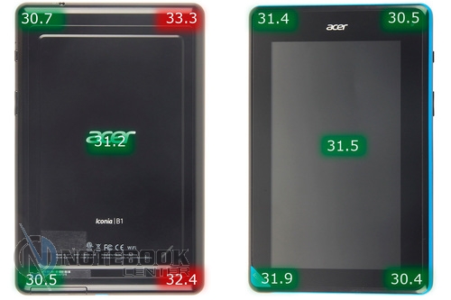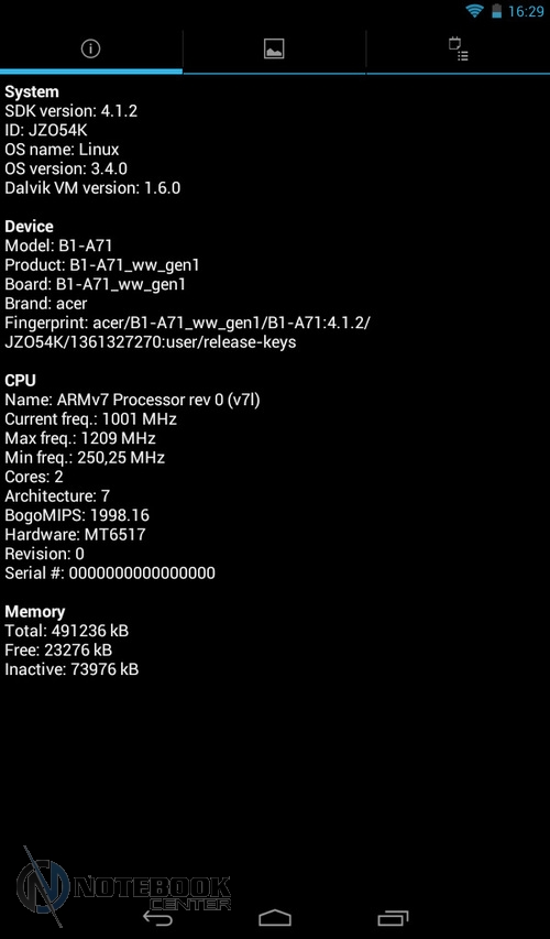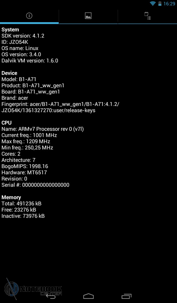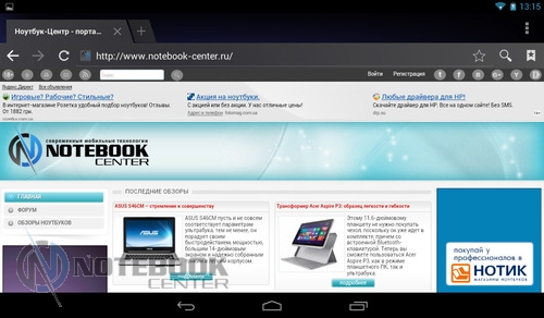 Комплект поставкиПланшет находится в картонной коробке, где дополнительно вложено краткое руководство пользователя, а также сведения о продукции и технике безопасности. Кроме того, в комплекте предусмотрен блок питания с вилкой евростандарта и переходник Micro-USB-USB. ДизайнВнешний вид планшета запоминающийся. Верхняя и нижняя панели имеют черную расцветку, которая сочетается с ярко-синей окантовкой по периметру корпуса. Нижний левый угол рамки дисплея также синий, на нем можно увидеть надпись ICONIA. Если рассмотреть планшет снизу, видно, что в центре производители расположили свой логотип, а ниже – название модели и краткую информацию с указанием страны-производителя. Также на нижней панели также есть решетка, за которой спрятан динамик. Вообще, держать ICONIA B1 удобно, возможно потому, что задняя крышка не плоская, а двухуровневая. Более того, все торцы и панели гладкие, незаостренные. Глянец, использованный в корпусе, смотрится очень красиво, до тех пор, пока не начнешь пользоваться гаджетом. Тогда он сильно залапывается, и его надо периодически протирать. Не совсем приятно видеть, как прогибается пластик и скрипит корпус в нижней части. Также при надавливании сзади на поверхности дисплея видны разводы. Конечно, в этом отношении планшет уступает конкурентам, например, Google Nexus 7. Зато вес устройства 320 граммов, как и размеры 197.4x128.5x11.3 мм совсем небольшие, что позволит, не задумываясь, носить Acer ICONIA B1 с собой постоянно. Дисплей, звук, веб-камераВ планшете установлен емкостный сенсорный дисплей с размером по диагонали 7 дюймов и соотношением сторон 17:10. Разрешение экрана составляет 1024х600 точек (WSVGA) с плотностью 160 пикселей на дюйм. Ниже вы можете увидеть, как выглядят веб-страницы и иконки программ на ICONIA B1. Чтобы посмотреть интернет-сайты, лучше воспользоваться альбомной ориентацией страницы, так шрифт будет крупнее. Что касается приложений, то размеры иконок под стать пальцам, а название под ними легко читаемо. Яркость и контрастность данного экрана не слишком высокая, но ее хватит для работы в помещении и на улице, если привыкнуть к отражениям от глянцевой поверхности. Зато сочные цвета порадуют любителей игр и видео. Добавим, что горизонтальные углы обзора TN-дисплея более стабильны, чем вертикальные, но в целом вы сможете посмотреть фотографии в небольшой компании. Чтобы проверить, на какое количество одновременных касаний реагирует дисплей Acer ICONIA B1, было запущено приложение MultiTouch Tester. В результате мы увидели, что экран планшета поддерживает пятипальцевый мультитач, что подтверждается соответствующим скриншотом. С уверенностью можно сказать, что звук, воспроизводимый планшетом, на удивление громкий, чистый и даже немного объемный. Правда, в первую очередь слышны высокие частоты, иногда через них прорываются низкие. Учитывая, что в планшете всего один динамик, качество акустики держится на весьма приличном уровне. Кстати, на максимальной громкости практически не слышно хрипов, что является еще одним плюсом. Наверное, этого должно хватить для просмотра фильмов. В противном случае, особенно для прослушивания музыки, стоит подключить наушники. Веб-камера находится на рамке дисплея. Только она занимает место не в центре, а в правом верхнем углу. Если вы собираетесь часто общаться по Skype, вам придется привыкать располагаться перед объе