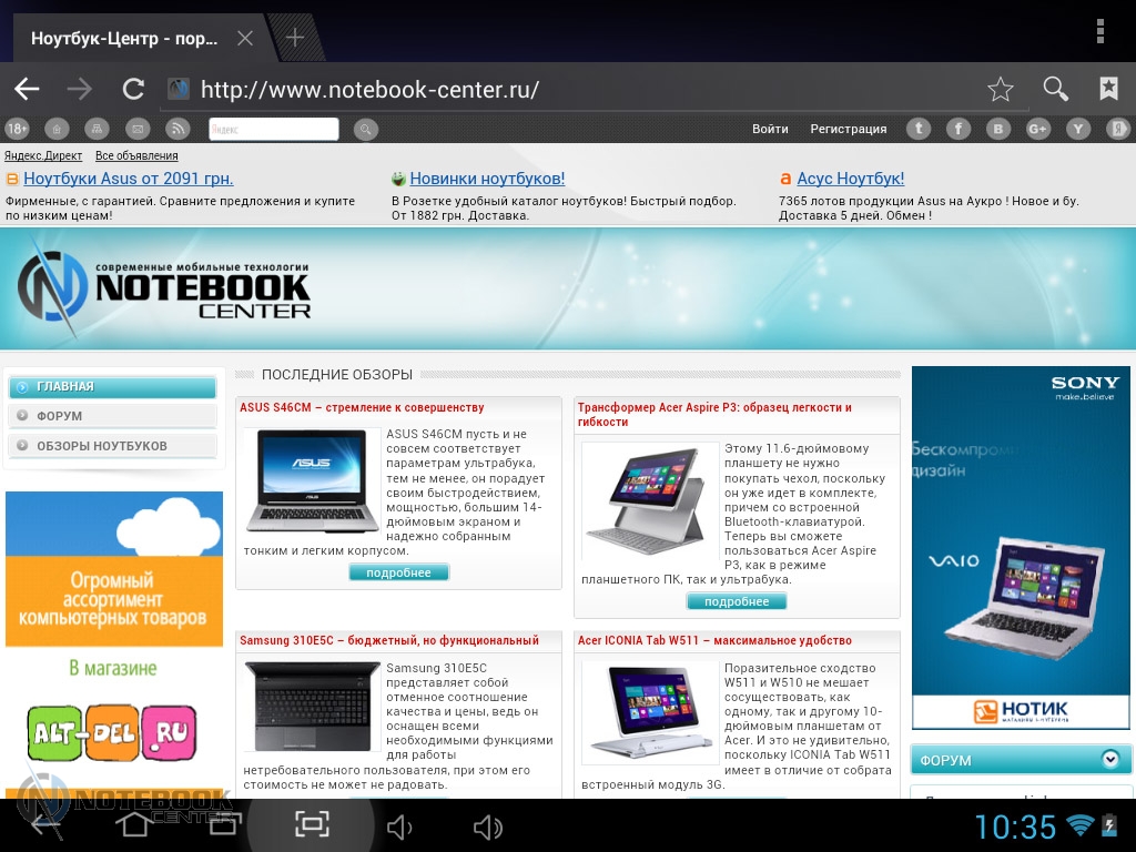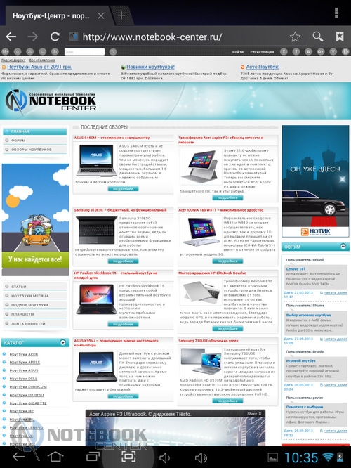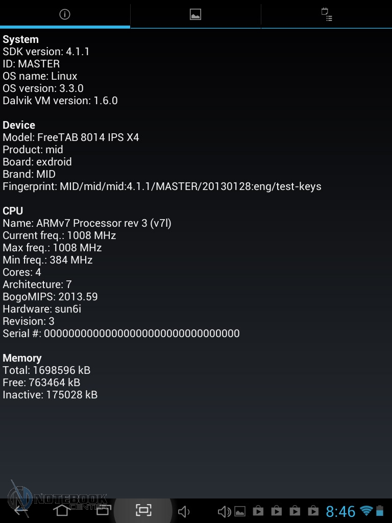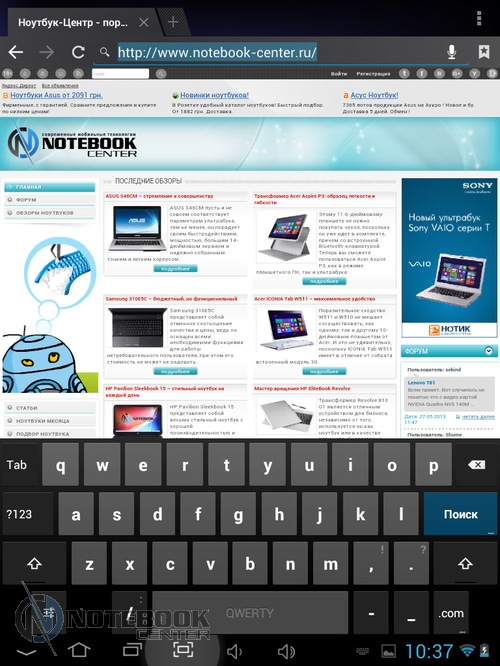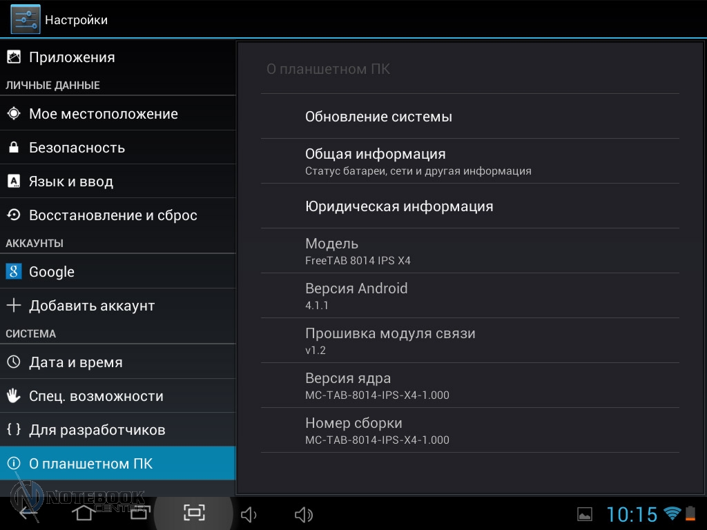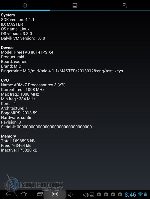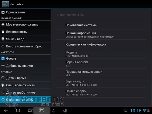 Комплект поставкиПланшет MODECOM FreeTAB 8014 пришел упакованным в плотную картонную коробку. В ней кроме самого гаджета была вложена защитная пленка на дисплей, переходник Micro-USB-USB-Host. ![]() Также в комплекте мы увидели руководство для пользователя, инструкцию по началу работы и зарядное устройство с входом USB и соответствующим переходником. Безусловно, понравилось наличие и чехла из кожзама. ![]() ДизайнВнешность этого устройства непритязательная. Верхняя часть планшета – дисплей, защищенный прочным стеклом. Никаких кнопок нет, есть лишь фронтальная веб-камера. ![]() Нижняя панель сделана из алюминия, прочного и устойчивого к царапинам. В отличие от верха, она имеет серебристую расцветку, на которой практически не видны отпечатки пальцев. В принципе низ совершенно пустой, здесь только указана страна-производитель и название модели, а также расположен объектив задней камеры. ![]() Корпус планшета имеет весьма удобные размеры 199х153х10 мм и вес 480 граммов, все панели устройства обтекаемые, острые углы отсутствуют, так что держать в руках данный гаджет комфортно. ![]() Нельзя не сказать несколько слов о качестве сборки планшета MODECOM FreeTAB 8014. Первое впечатление, что устройство собрано на совесть, впоследствии целиком подтвердилось. Гаджет действительно очень крепкий. Зазоров нет, отсутствуют скрипы. Так что можете быть уверены в том, что планшет выдержит частые поездки и не подведет в ответственный момент. Дисплей, звук, веб-камераОдним из достоинств FreeTAB 8014 является емкостный сенсорный дисплей с разрешением 1024х768 точек. Он имеет диагональ 8 дюймов, соотношение сторон 4:3 и плотность пикселей 160 dpi. Без всякого сомнения, экран удобен для просмотра видео, веб-серфинга и прочих задач. ![]() Иконки приложений на таком дисплее имеют оптимальные размеры, но шрифт на сайтах в альбомной ориентации мелкий. ![]() ![]() Правда, это легко изменить, повернув планшет в книжную ориентацию или использовать масштабирование. ![]() ![]() Не менее удобно читать на планшете электронные книги. ![]() К слову, дисплей MODECOM FreeTAB 8014 поддерживает 10-точечный мультитач. ![]() Экран планшета отображает порядка 16.7 млн цветов, поэтому изображение будет насыщенным. Также в числе плюсов можно отметить четкое изображение и широкие углы обзора, поскольку дисплей планшета изготовлен по технологии IPS c обзорностью до 178 градусов. Это позволяет комфортно смотреть медиаконтент даже при значительном отклонении от прямого угла. ![]() Отдельно хочется отметить чувствительность экрана, благодаря которой вам не потребуется дважды повторять команды. Кстати, разработчики считают, что дисплей отличается «исключительной остротой и глубиной». ![]() В планшете предусмотрен всего один динамик. Впрочем, для звука блокировки экрана и нажатия на экран его достаточно, но вот для того, чтобы послушать музыку, в любом случае придется подключать наушники. ![]() Устройство оснащается двумя камерами. Фронтальная веб-камера имеет разрешение 0.3 Мп и оптимальна для разговоров по Skype, тогда как 5-мегапиксельная тыловая (2592х1936 точек) оснащается автофокусом, позволяя делать качественные фото или видео с разрешением 720 p. ![]() ![]() Сравнить качество снимков, сделанное каждой камерой, можно на приведенных фотографиях. Первым показано фото с тыловой камеры, вторым – с фронтальной. ![]() ![]() КлавиатураВ MODECOM FreeTAB 8014 предусмотрена сенсорная клавиа