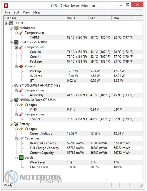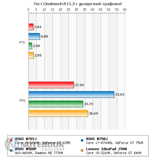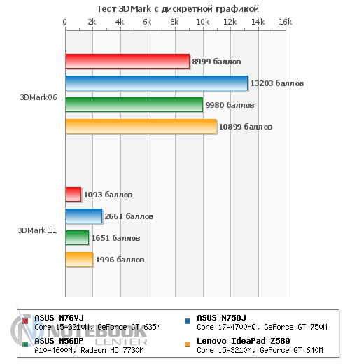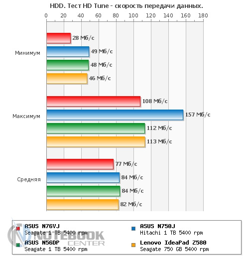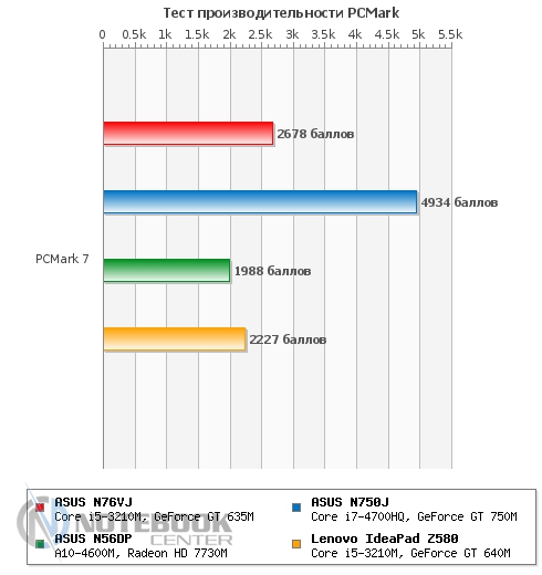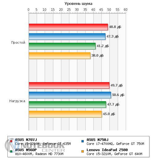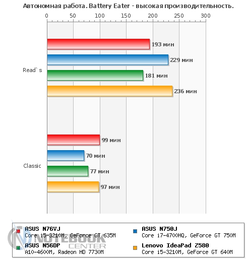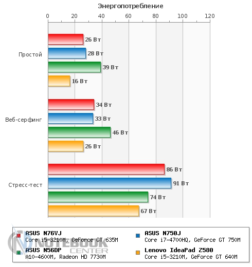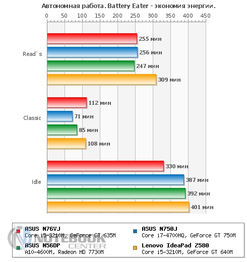 При выборе ноутбука мы очень редко учитываем, насколько сильно будет шуметь ноутбук, а на практике этот фактор оказывается довольно значимым и влияет на комфорт работы за девайсом. В целом этот ноутбук не самый шумный из всех, которые были у нас на тестировании, нарекание разве что может вызвать уровень шума в состоянии простоя – 48.8 дБ, что выше, чем у большинства аналогичных моделей. Во врем проведения стресс-теста этот показатель поднялся совсем не значительно – до 49.7 дБ. Как видим на графике, показатели шума нашей тестовой модели сравнимы с ASUS N750J, а вот менее производительные 15-дюймовые модели шумят чуть меньше. ![]() БатареяАвтономную работу ноутбуку обеспечивает 6-секционный литий-ионный аккумулятор емкостью 5200 мАч. Он съемный, а это значит, что при выходе батареи из строя заменить ее не составит труда. Для сравнения у N750J аккумулятор прячется внутри корпуса, и, чтобы получить к нему доступ, вам придется обращаться в сервисный центр. ![]() Питание от сети обеспечивается 90-ваттным блоком питания. Для такой же модели ноутбука, но с процессором Intel Core i7, мощность блока питания будет составлять 120 Вт. ![]() Тест батареи в плане электропитания «Экономия энергии» порадовал нас своими результатами. В режиме «Read's» ноутбук проработал 4 часа 25 минут, а в режиме «Classic» – 1 час 52 минуты. Время простоя хоть и оказалось самым результативным, но ненамного отличалось от режима «Read's» – всего 5 часов 30 минут. На графике видно, что среди всех четырех моделей дольше всего может проработать Lenovo Z580, но стоит учесть, что его начинка несколько слабее, чем у представителей ASUS. Единственное что можно отметить, так это отставание нашей тестовой модели от конкурентов в режиме простоя. ![]() План электропитания «Высокая производительность» показал более скромные результаты по сравнению с планом электропитания «Экономия энергии». Так в режиме «Read's» ноутбук проработал 3 часа 13 минут, а в режиме «Classic» это время сократилось до 1 часа 39 минут. Как и на предыдущем графике, мы видим, что в плане электропитания «Высокая производительность» режиме «Read's» лидирует Lenovo Z580. А вот в «Classic» первенство удерживает ASUS N76VJ. В целом, в этом ноутбуке можно отметить хорошее соотношение производительности и времени автономной работы. ![]() Энергопотребление ноутбука находится в разумных пределах – оно не отличается низкими показателями, но и очень большим его назвать нельзя. Замеры с помощью мультиметра показали следующие результаты: в простое потребление составило 26 Вт, при веб-серфинге оно повысилось до 34 Вт, ну а самым прожорливым ноутбук оказался во время проведения стресс-теста – 86 Вт. Как видим на графике, оба 17-дюймовых мультимедийника от ASUS имеют примерно одинаковое энергопотребление, хотя процессор Core i7-4700HQ мощнее, чем наш процессор, и это свидетельствует об улучшенном энергопотреблении чипа на архитектуре Haswell. Что же касается ASUS N56DP, то он отличается крайне нестабильным энергопотреблением в разных режимах – в простое и веб-серфинге он потреблял больше всех, а в стресс-тесте спустился на третье место. Lenovo Z580 – наоборот, во всех режимах показал стабильно малое энергопотребление и по праву стал самым экономичным в этом плане ноутбуком. ![]() ЗаключениеASUS N76VJ – это отличный мультимедийный ноутбук, который оттачивался компанией ASUS в течение многих лет и доводился до ума. У него прак