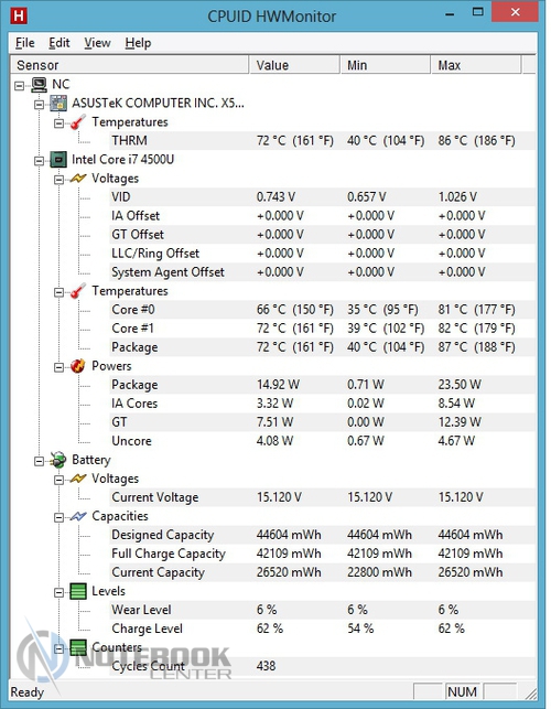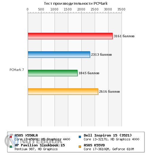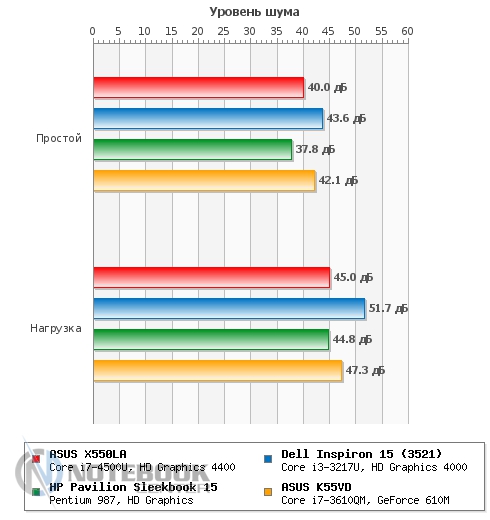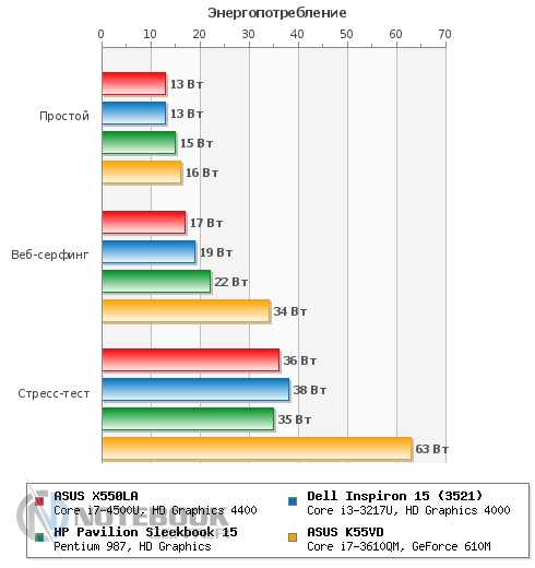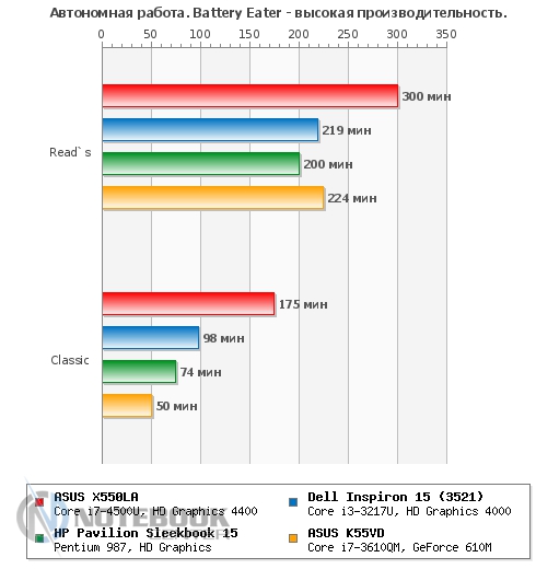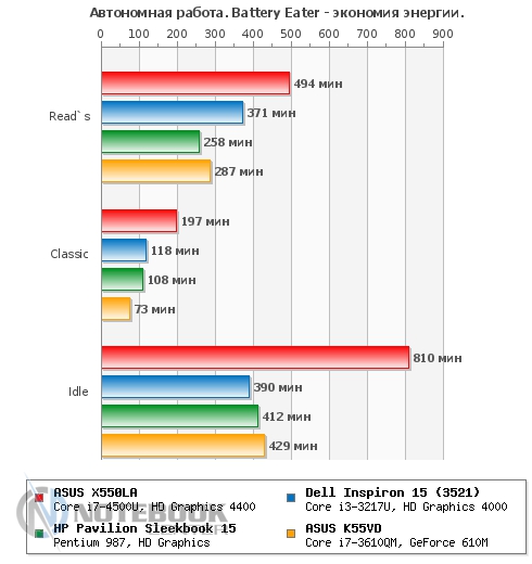 ASUS X550LA оказался настоящим тихоней. Замер уровня шума показал очень низкие значения - 40 дБ в состоянии простоя и всего 46 дБ в состоянии нагрузки. Даже прислушиваясь к работе ноутбука под нагрузкой, услышать гул или свист практически невозможно. Если брать соотношение производительность/уровень шума, то ASUS X550LA показывает себя лучше, чем конкуренты, это можно увидеть на графике. ![]() БатареяВ данном ноутбуке установлена 4-секционная литий-ионная батарея емкостью всего 2600 мАч. Конечно, если сравнивать с большинством одноклассников, то такая емкость кажется очень маленькой, но тут стоит учесть что ASUS X550LA оснащен энергоэффективными компонентами, которые потребляют значительно меньше энергии, чем их обычные аналоги. ![]() Зарядка производится довольно оригинальным блоком питания, во-первых, он очень компактный, а во-вторых, больше напоминает зарядное устройство для смартфона или планшета. Время зарядки ноутбука составляет 2 часа 52 минуты, это средний показатель для такого класса устройств. ![]() ![]() Еще раз отметим, что благодаря использованию энергоэффективных компонентов, ASUS X550LA может похвастаться незаурядной автономностью. Так в плане производительности «Экономия энергии» в режиме «Classic» ноутбук проработал 3 часа 17 минут, это хороший показатель, учитывая, что большинство ноутбуков не может проработать в нем даже более двух часов. Режим «Read’s» также поразил длительным временем автономной работы – 8 часов 14 минут. Но все-таки самым длительным оказалось время работы в режиме простоя – целых 13.5 часов. ![]() В плане электропитания «Высокая производительность» ноутбук показал чуть более скромные показатели, но все же они достаточно высоки. Так в режиме «Classic» мы имеем 2 часа 55 минут, а в «Read’s» – ровно 5 часов. Как видим, и в энергозатратном режиме работы ASUS X550LA опережает конкурентов по времени работы. ![]() Серию энергетических тестов продолжил замер энергопотребления, который проводился с помощью мультиметра. В результате мы имеем: 13 Вт в простое, 17 Вт в режиме веб-серфинга и 36 Вт в режиме полной нагрузки (стресс тест AIDA+Furmark). Как видим, эти очень скромные показатели обязаны энергоэффективным компонентам, установленным в ноутбуке. Для сравнения можете взглянуть на график. ![]() ЗаключениеASUS X550LA оставил после себя хорошее впечатление. Во-первых, он довольно оригинально выглядит как для бюджетной модели, уж очень он внешне похож на ASUS ZENBOOK, который является одним из самых стильных ультрабуков. Во-вторых, его толщина и общие габариты также способствую хорошему визуальному восприятию. Кроме того, свою роль играют и современные компоненты ноутбука, в первую очередь, процессор на архитектуре Haswell и, соответственно, относящаяся к нему встроенная графика. Они сочетают в себе низкое энергопотребление и относительно высокую производительность. Немаловажную роль также играет хорошая система охлаждения, которая не только справляется со своими прямыми обязанностями, но и при всем при этом совсем не издает шума. Еще одно сходство ASUS X550LA с ультрабуками прослеживается в его времени автономной работы, которое на голову выше, чем у его конкурентов по бюджетному сегменту. На фоне всех перечисленных достоинств, наличие дисплея со скромными углами обзора и не самые дорогие материалы отделки выглядят сущими пустяками. Для тех, кто ищет хорошую бюджетную модел