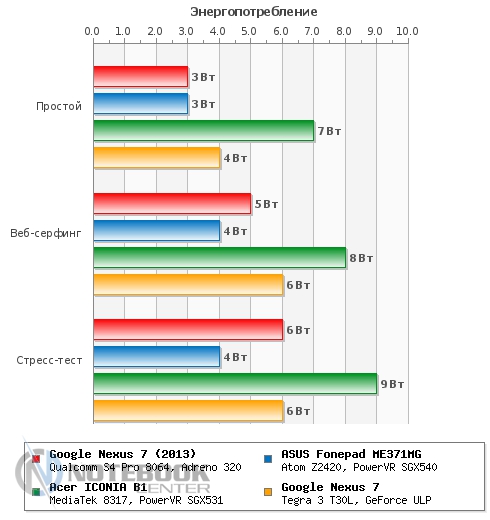 Комплект поставкиПланшет Nexus 7 второго поколения (ME571K) комплектуется кабелем USB/Micro-USB, зарядным устройством мощностью 7 ватт, а также гарантийным талоном и кратким руководством пользователя. ![]() ![]() ДизайнОграничиться лишь описанием нового Nexus 7 мы не смогли, волей-неволей приходилось сравнивать его с предшественником. Итак, оба планшета довольно похожи друг на друга, но есть и заметные отличия. ![]() Например, по периметру корпуса теперь нет серебристой окантовки, да и сзади отсутствует текстура, новый планшет совершенно гладкий. ![]() Нижняя панель осталась матовой, только теперь на ней название планшета «Nexus» сделано глянцевым, а не выдавлено, как раньше. Кроме того, данная надпись располагается не горизонтально, а вертикально. Впрочем, такое решение смотрится не менее интересно. Произошли изменения и в плане расположения акустики, в связи с чем решетки динамиков можно увидеть по бокам, а не внизу. ![]() В верхней части устройства все осталось по-прежнему, разве что глазок фронтальной камеры теперь находится не по центру, а сдвинут слегка вправо. Заметно и еще одно отличие: рамка вокруг дисплея стала тоньше по бокам и шире сверху и снизу. ![]() Сложно сказать, в какую сторону, большую или меньшую, изменились размеры корпуса «второго» нексуса. С одной стороны он стал тоньше и меньше в ширину, с другой – выше. Заметим, что габариты планшета составляют 200x114x9 мм, в отличие от предшественника, имевшего 198х119х10 мм. Вес новинки 290 граммов, а это значит, что Nexus 7 (2013) к тому же и легче. Данный гаджет, как и прежде, удобно держать в руках. Единственное, на маркой поверхности, особенно сзади, остается достаточно много видимых отпечатков пальцев. ![]() Что касается сборки планшета, то здесь ни к чему не подкопаешься: детали корпуса подогнаны отлично, за все время, что гаджет был у нас на тестировании, никаких недостатков в сборке мы не заметили. Кстати, софттач-пластик на нижней панели оказался не только приятным на ощупь, но и сравнительно жестким, и попытка его прогнуть не увенчалась успехом. ![]() Дисплей, звук, веб-камераПланшет оснащается 7-дюймовым дисплеем с разрешением 1920х1200 (Full HD) и плотностью пикселей 323 dpi. Яркость экрана очень высокая, изображение – четкое, а благодаря технологии ASUS TruVivid еще и достаточно сочное. ![]() В качестве примера приводим скриншоты рабочего стола, вида иконок приложений, а также веб-страниц. ![]() ![]() ![]() ![]() Дисплей планшета выполнен по IPS-технологии, поэтому вы гарантировано получите превосходный обзор практически с любой точки и сможете комфортно посмотреть фото или видео в компании друзей. ![]() Более того, будет удобно почитать вместе электронную книгу. ![]() ![]() Чувствительность сенсорной поверхности как и прежде на высоте, на малейшее прикосновение она откликается мгновенно. Кроме того, запуск MultiTouch Tester показал, что экран гаджета поддерживает десять одновременных касаний. ![]() Что ж дисплей Nexus 7, как и у предшественника, действительно выполнен качественно и заслуживает высокой оценки. В отношении акустики можно сказать, что помимо хорошей громкости и четкости можно отметить пространственное звучание. На официальном сайте компании упоминание о нем неразрывно связано с аудиотехнологией Fraunhofer Cingo. Стоит отметить, что ее основное направление – обеспечить объемный звук, близкий к формату 5.1. ![]() ![]() Что касается камер, то их количество ув