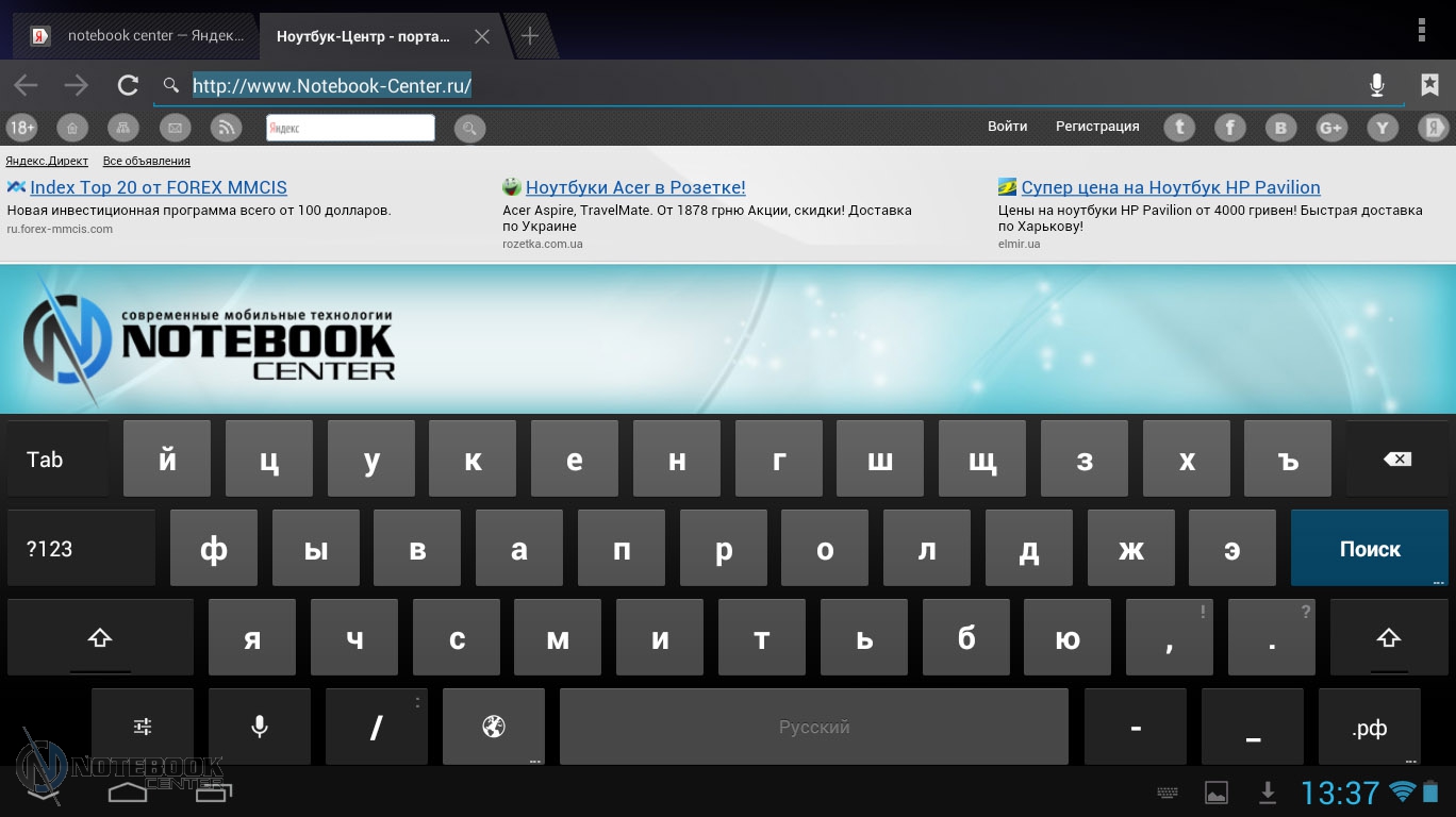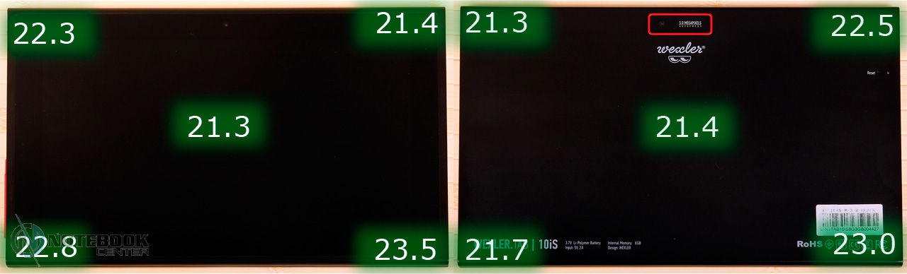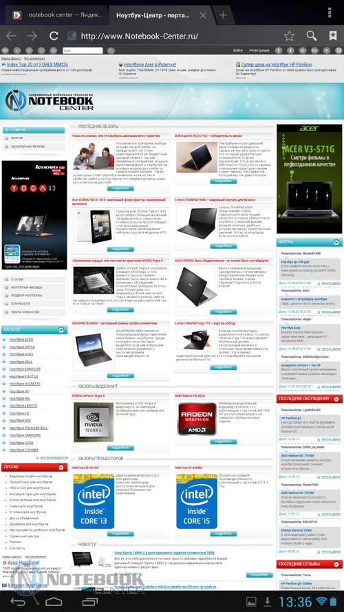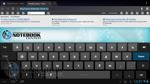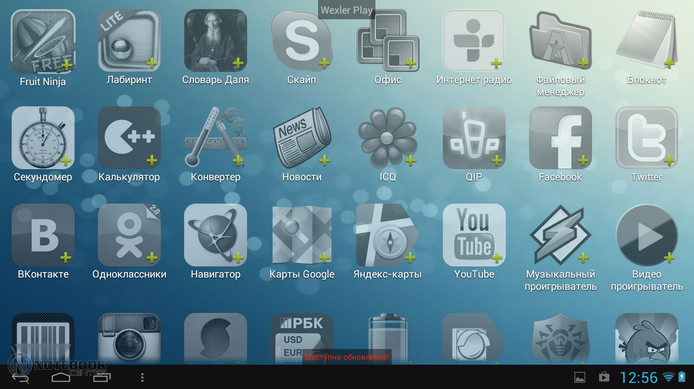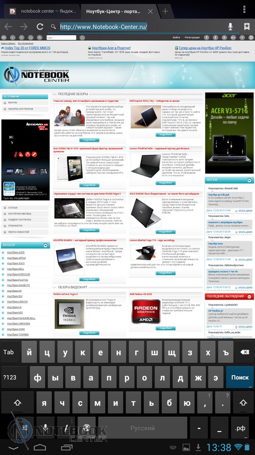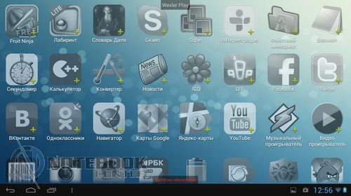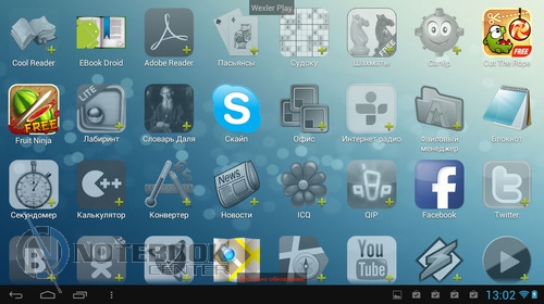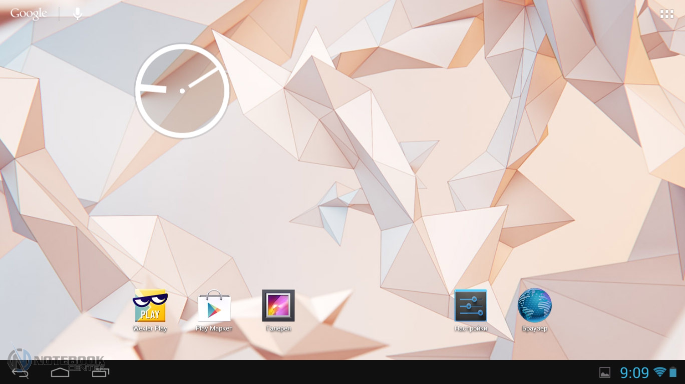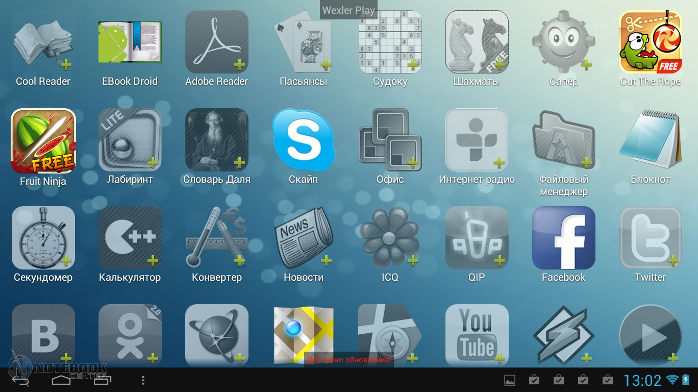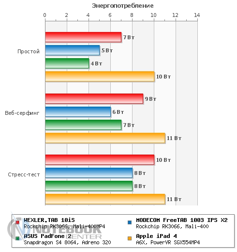 Комплект поставкиВ коробке мы нашли зарядное устройство и краткую инструкцию с гарантийным талоном на обратной стороне. Также в комплекте с планшетом WEXLER.TAB 10iS предусмотрен переходник USB/Micro-USB, предназначенный для обмена данными, например, с ноутбуком или телевизором. ![]() ДизайнЗа вытянутую прямоугольную форму корпуса и острые углы планшет WEXLER.TAB 10iS можно было бы назвать классическим и слишком строгим, если бы черный цвет не дополнялся ярко-красным. ![]() В такой расцветке выполнена правая и левая грани корпуса, а также окантовка основной камеры. Данное решение выглядит очень оригинально и совсем не агрессивно. Пластик, из которого сделан планшет довольно крепкий. ![]() Дисплей покрыт защитным стеклом, которое позволяет избежать повреждений. Здесь же можно увидеть фронтальную веб-камеру. ![]() На задней части устройства расположился логотип компании WEXLER, кнопка Reset, с размещенным рядом светодиодным индикатором заряда, а также информация о стоящей в устройстве батарее, объеме памяти и, конечно, название модели планшета. ![]() ![]() Нижняя поверхность планшета матовая, поэтому она не так сильно пачкается, как глянцевая сторона дисплея. Размеры гаджета составляют 268х168х11 мм, весит устройство 620 граммов. Конечно, это не самый компактный планшет, который нам доводилось видеть, однако, для ежедневного использования является довольно неплохим вариантом. ![]() Дисплей, звук, веб-камераWEXLER.TAB 10iS оснащается 10-дюймовым сенсорным TFT-дисплеем. Он емкостный, имеет разрешение 1366х768 пикселей и плотность 155 пикселей на дюйм. Это не слишком высокая плотность, но для работы и развлечений этого более чем достаточно. Кстати, Android-планшетов с таким разрешением совсем немного. ![]() Соотношение сторон экрана 16:9 позволит комфортно смотреть фильмы (имеется поддержка форматов WMV, RM, AVI, RMVB, 3GP, FLV, MP4, MPEG, MKV), а при широкой обзорности IPS-дисплея можно с не меньшим удовольствием и почитать, причем не только в одиночку, но и вдвоем. ![]() ![]() ![]() ![]() Стоит отметить и хороший уровень яркости, а также приличную цветопередачу. А вот контрастность не столь впечатляющая. Впрочем, это с лихвой компенсируется высокой чувствительность сенсорного дисплея. ![]() Во время выполнения традиционных жестов смахивания, перетаскивания или, например, масштабирования мы не заметили никаких задержек или отсутствия реакции на команды. Кстати, в ходе тестирования с помощью приложения MultiTouch Tester мы узнали, что дисплей планшета WEXLER.TAB 10iS может поддерживать пять одновременных нажатий. Скриншот программы располагается ниже. ![]() По всей видимости, вам не придется надолго расставаться с наушниками, поскольку акустика планшета слабовата и позволяет комфортно наслаждаться звуком только в тихой обстановке. Звук, выходящий через два встроенных динамика, расположенных по обе стороны устройства, сравнительно тихий, маловыразительный, с явным доминированием высоких частот. В то же время нельзя не отметить, что звучание чистое, без хрипов. ![]() В этом планшете предусмотрено две камеры. Для общения в Skype подойдет фронтальная с разрешением 0.3 Мп, а для фото и видео – основная 5-мегапиксельная с автофокусировкой. ![]() Нельзя сказать, что снимки с задней камеры получаются четкими и сочными, скорее они посредственные. Впрочем, согласитесь, что планшет не приобретается в качестве замены фотоаппарату, так что ожидать высокого