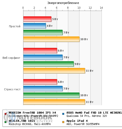 БатареяЕмкость встроенного аккумулятора, используемого в FreeTAB 1004 IPS X4, демонстрирует достаточно серьезные показатели – 7000 мАч, поэтому вполне логично, что мы ожидали от гаджета продолжительную работу в автономном режиме. Кроме того, планшет укомплектован энергоэффективной SoC, что, несмотря на большой экран, также должно сыграть свою роль в улучшении автономности. Итак, на то, чтобы полностью разрядить планшет игровой активностью, понадобится почти 6 часов. А если вы любите коротать свое время за просмотром шедевров кинематографии, то FreeTAB 1004 IPS X4 с удовольствием этому поспособствует в течении 5 часов 51 минут. Таким образом, практически 6 часов планшет будет оставаться активным, что особенно актуально в путешествии или командировке. Заряжается данный гаджет посредством 12.5-ваттного блока питания, компактного и достаточно легкого, который совсем необременительно носить с собой. Так вот, на полную зарядку батареи планшета у нас ушло 5 часов 20 минут. ![]() Что касается энергопотребления, то тут каких-либо сюрпризов не ожидалось, что и подтвердилось на практике средними, характерными для многих подобных устройств, результатами. В простое планшет потребляет 5 Вт, при веб-серфинге - 6 Вт, во время проведения стресс-теста (CPU+GPU Stability Test) показатель не изменился – те же 6 Вт. Как можно судить по графику, расположенному ниже, наш тестируемый планшет оказался самым экономным, лишь в простое уступив первенство устройству ASUS с его 4 Вт. ![]() ЗаключениеMODECOM FreeTAB 1004 IPS X4 имеет довольно современный стиль исполнения наряду с отличным качеством сборки. Достаточно производительная начинка в виде мобильного процессора Allwinner A31 и видеокарты PowerVR SGX 544MP2, дополняется емкой батареей и невысоким нагревом. Также порадовало использование IPS–дисплея, вот только мы надеемся, что в новом поколении планшетов будут применяться матрицы с большим разрешением. Кроме того, вызывает доверие хороший звук, несмотря на всего лишь один динамик, и оптимальные габариты, благодаря чему планшет легко ложится в руку. Несколько расстроили не слишком впечатляющие возможности веб-камеры и скользкая задняя панель Вот, собственно говоря, и все. Но в целом, это очень достойный планшет, тем более, что его стоимость составляет около $250. Благодарим компанию Техника для Бизнеса за любезно предоставленный для тестирования планшет. Также данную модель Вы можете приобрести в сетях магазинов «Комп'ютерний Всесвіт» и «Клік». Дата: 18.11.2013