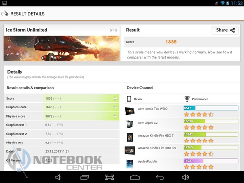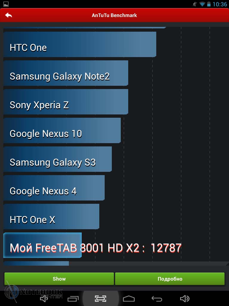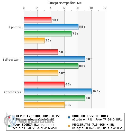БатареяТаблетка укомплектована литий-ионным аккумулятором емкостью 4400 мАч. Обычно мы анализируем возможности батареи тремя способами – в играх, просмотре видео и, конечно, зарядку. В общей сложности, FreeTAB 8001 HD X2 показал достаточно неплохие результаты: смотреть фильмы на планшете можно непрерывно на протяжении 3 часов 33 минут, играть 3 часа 22 минуты, а на то, чтобы полностью зарядить устройство, понадобится 4 часа 35 минут. Это средние показатели, характерные для многих современных планшетов. ![]() Что касается энергопотребления, то в простое таблетка потребляет 4 Вт, при веб-серфинге – 5 Вт, а в режиме стресс-теста (CPU+GPU Stability Test) – 6 Вт. По сравнению с конкурентами, FreeTAB 8001 оказался самым экономичным, буквально на уровне с WEXLER.TAB 7iS 8GB + 3G. ![]() ЗаключениеВот такое знакомство состоялось у нас с новым планшетным ПК MODECOM FreeTAB 8001 HD X2. Так же как и все мобильные устройства, он в чем-то хорош, а где-то не дотянул. Дизайн у него отличный, очень презентабельный и располагающий к себе, аналогично качество сборки и восприятие в целом. Однако здесь присутствует небольшой минус – задняя крышка выполнена из алюминия с шершавым покрытием, что обуславливает повышенную скользкость таблетки. Но решить эту проблему можно с помощью чехла. Дисплей планшета неплохой, углы обзора неплохи, как для бюджетного устройства, производительность достаточная для выполнения ежедневных задач. Емкость батареи средняя, так же, как и показатели автономности, а нагрев планшета во время работы дискомфорта не создает. На прилавках магазинов MODECOM FreeTAB 8001 HD X2 можно приобрести за $130, что, согласитесь, очень демократично по нынешним меркам. На наш взгляд, устройство полностью соответствует своей стоимости. Благодарим компанию Техника для Бизнеса за любезно предоставленный для тестирования планшет. Также данную модель Вы можете приобрести в сетях магазинов «Комп'ютерний Всесвіт» и «Клік». Дата: 20.01.2014