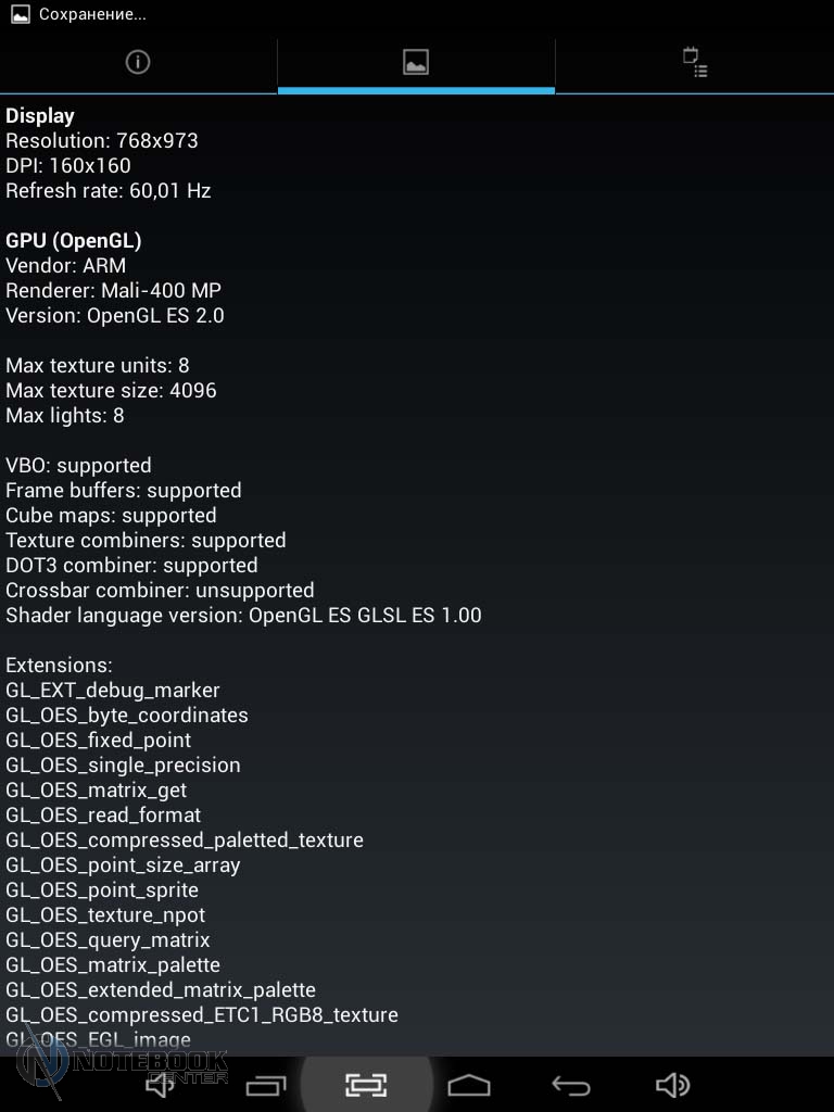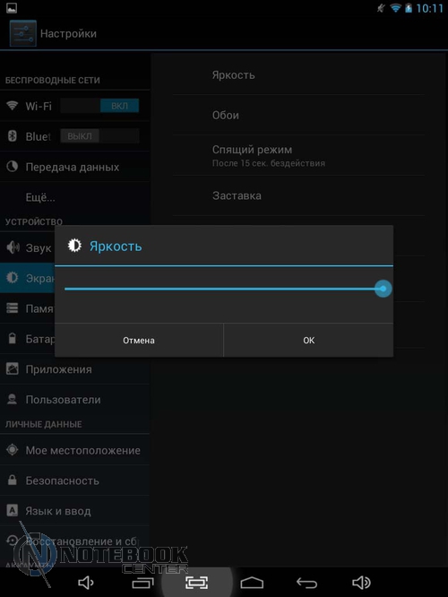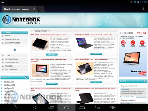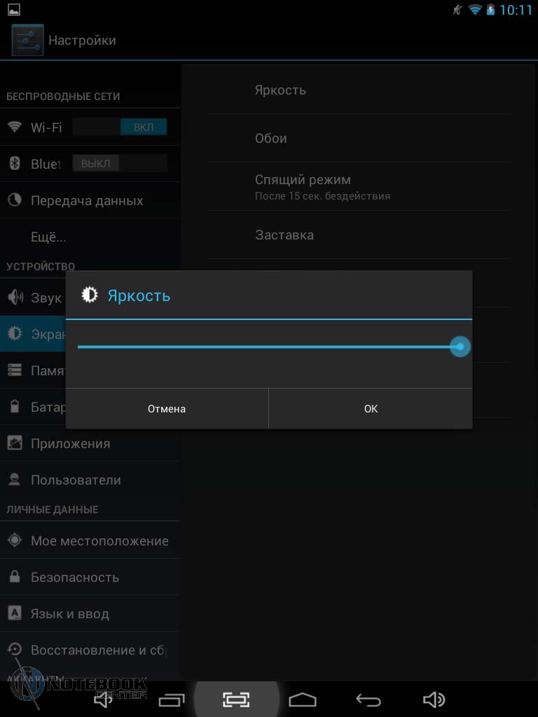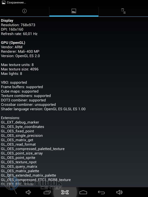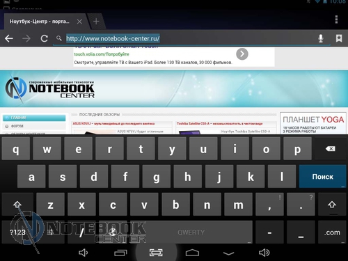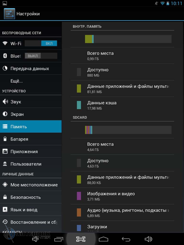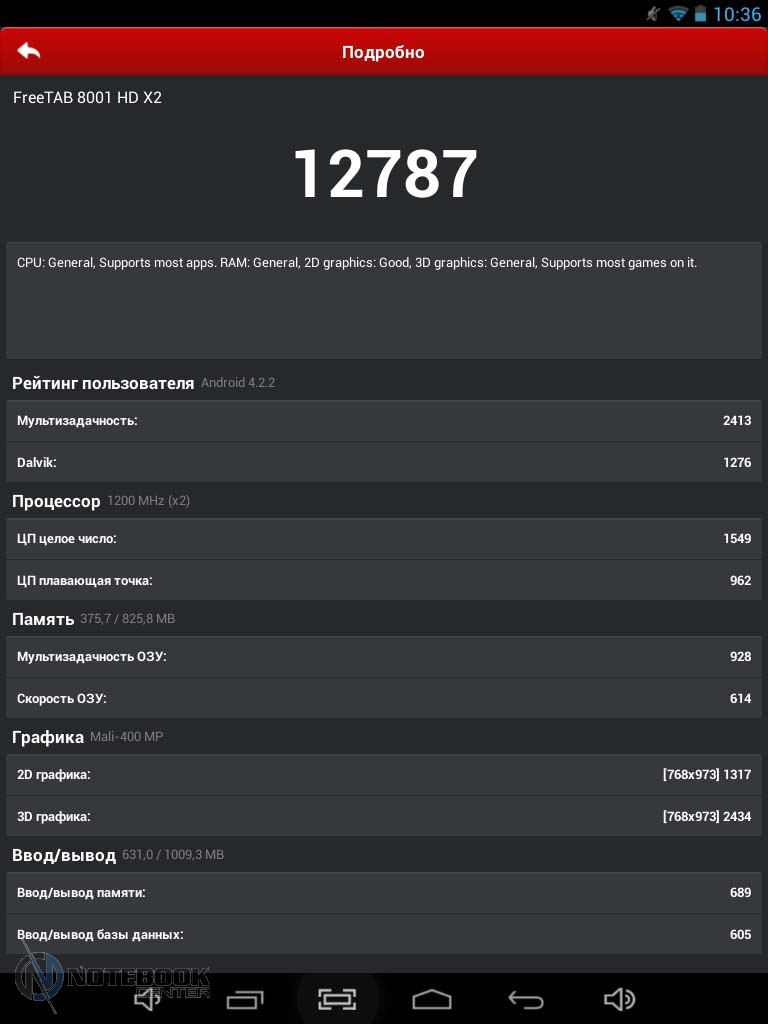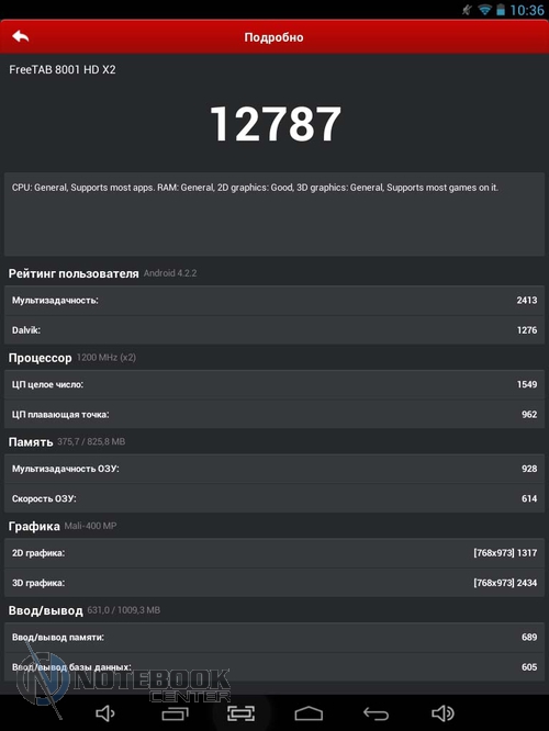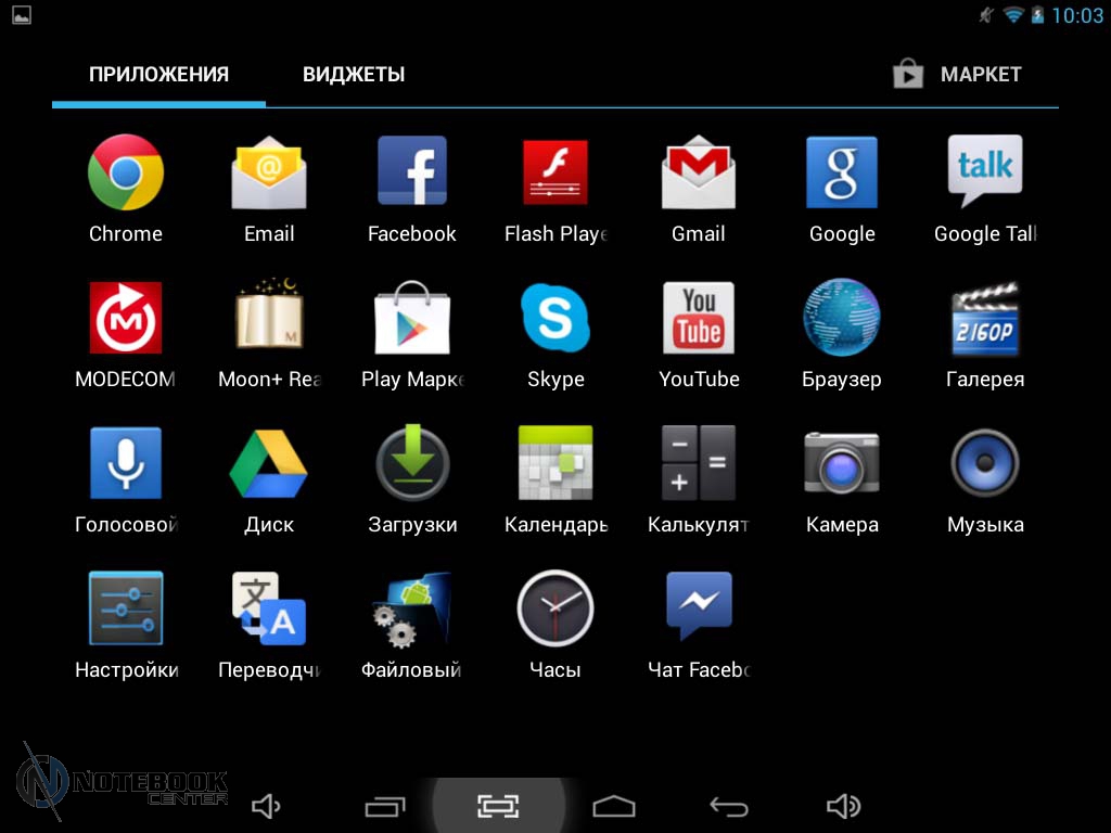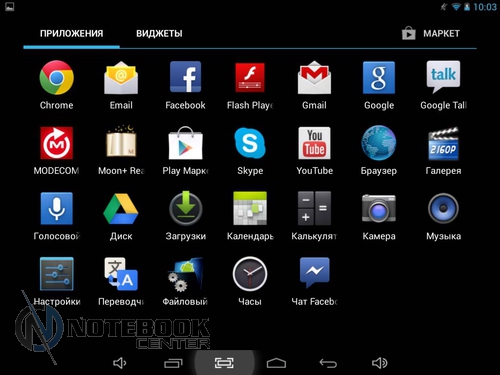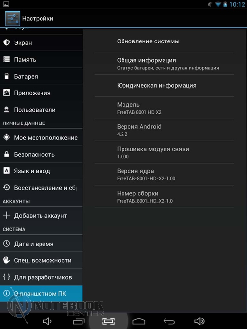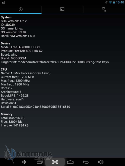 Комплект поставкиВ комплект поставки входит весь необходимый набор периферии – зарядное устройство, два кабеля Micro-USB/USB-OTG и USB/Micro-USB, а также два руководства для пользователя. Сам планшет упакован в одноразовый мягкий чехол и помещен в специальную подставку внутри коробки. ![]() ![]() ДизайнВнешний вид планшета внушает уважение. Имея на вооружении 8-дюймовый дисплей, он имеет форму корпуса, близко приближенную к квадратной, и, как показала практика, это очень удобно. Экран покрыт прочным стеклом, надежно защищающим матрицу от возможных повреждений, и ограничен неширокой рамкой черного цвета. В правом верхнем углу можно обнаружить глазок передней веб-камеры с разрешением 1.3 Мп. ![]() Задняя панель устройства темно-серого цвета, выполнена из алюминия. Она цельная, без каких-либо отсеков или заглушек. Поверхность немного шершавая, однако это не мешает ей быть достаточно скользкой. В верхней части слева расположилась веб-камера, справа решетка динамика, в нижней – краткая информация о девайсе. Так как все разъемы планшета смещены правую грань, их маркировка нанесена на задней крыше возле правой стороны. ![]() Габариты устройства составляют 200х155х10 миллиметров, вес 430 грамм. Но, благодаря своей форме, устройство отлично ложится в руку и весьма удобное в управлении. ![]() Дисплей, звук и веб-камераMODECOM FreeTAB 8001 HD X2 оснащен 8-дюймовым HD-дисплеем с разрешением 1024x768 пикселей и соотношением сторон 4:3. Разрешающая способность экрана весьма посредственная, однако в качестве компенсации можно отметить неплохие углы обзора в рамках возможностей HD-матрицы. При сильных отклонениях дисплея цветопередача изображения немного искажается, но в целом, то, что предлагает нам FreeTAB 8001 HD X2, вполне приемлемо. Также порадовала контрастность – при просмотре видео картинка четкая и насыщенная, именно то, что надо для комфортного восприятия. Единственное, что хотелось бы, так это большей яркости. ![]() Кстати, датчика освещенности здесь нет, поэтому регулировать уровень яркости придется самостоятельно. ![]() Антирефлексное покрытие дисплея позволяет с увеличенным комфортом использовать гаджет вне помещения, так как оно уменьшает отражения. Планшет отзывчив, достаточно быстро реагирует на прикосновение, но бывали моменты в необходимости повторного нажатия. Можно использовать устройство в качестве читалки, с этим экран справляется отлично. ![]() Также как и серфить в интернете. В отдельных случаях придется подстроить размер шрифта или картинок под свои требования, но в целом все отлично. ![]() Управлять таблеткой можно пятью пальцами, что мы определили посредством специальной программой MultiTouch Tester. Это удобно и обеспечивает большую функциональность. ![]() В процессе эксплуатации мы выяснили, что когда активен дисплей сенсорные кнопки скрываются, и на их месте остаются только схематические точки. Поэтому знать порядок расположения клавиш, например, «Назад», «Рабочий стол» и пр. нужно на память, поскольку можно не раз ошибиться, нажав не то, что хотелось бы. Уровнем звучания планшет не впечатлил, громкость невысокая, диапазон частот смещен в сторону высоких. Один динамик не может обеспечить пользователя качественным звуком, и плюс ко всему, он расположен на задней поверхности корпуса. ![]() Планшет FreeTAB 8001 HD X2 располагает двумя веб-камерами – передней и задней. Фронтальная имеет м