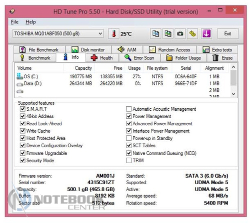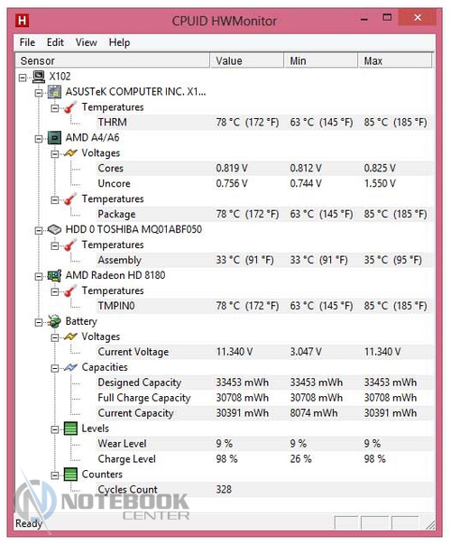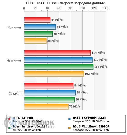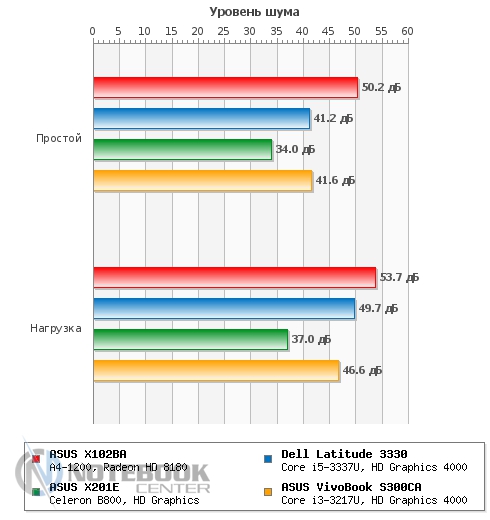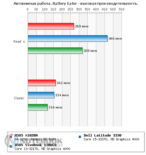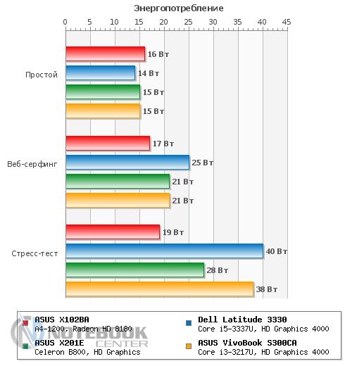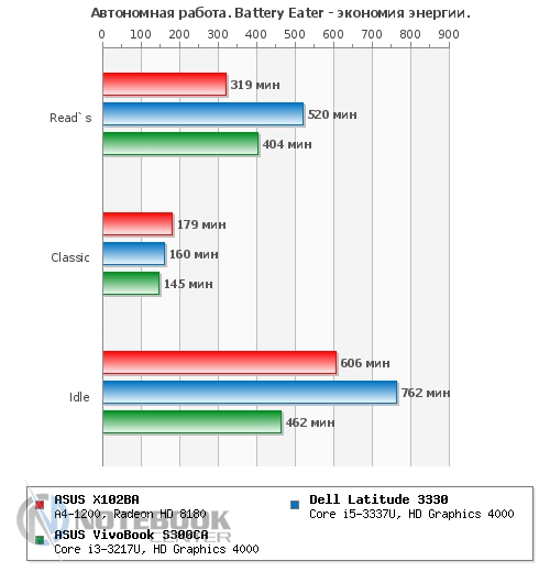 Все вышесказанное подтвердили и результаты нагрева внутренних компонентов, что показала программа CPUID HWMonitor. Аппаратные комплектующие энергоэффективны, система охлаждения работает отлично, результат обнадеживает – процессор максимально нагрелся до 85°С, видеокарта – также до 85°С, HDD – до 35°С. ![]() А вот что касается уровня шума лэптопа, то здесь показатели несколько удивили – как для такого компактного устройства с малопроизводительной начинкой, он достаточно громко работает. В простое ASUS X102BA был зафиксирован показатель в 50.2 дБ, под нагрузкой – в 53.7 дБ. Что ж есть и более тихие ультрапортативные ноутбуки. ![]() БатареяАвтономную работу ноутбука обеспечивает 3-секционная литий-ионная батарея емкостью 3000 мАч. Она несъемная и выступает за пределы днища в виде продольной ступени. Зарядка лэптопа от сети осуществляется с помощью 33-ваттного блока питания, массой 143 грамма. Его мощности хватает на то, чтобы за 2 часа 42 минуты зарядить устройство на 100%. ![]() Согласно итогам тестирования в Battery Eater, ноутбук с планом электропитания «Высокая производительность» в режиме «Classic» способен проработать в автономном режиме 2 часа 42 минуты, а в режиме «Read’s» - 4 часа 29 минут. В «Экономии энергии» продолжительность, естественно, возрастает, и в режиме «Classic» составляет 2 часа 59 минут, а в «Read’s» - 5 часов 19 минут. В простое лэптоп сохраняет активность в течение 10 часов 6 минут. ![]() ![]() Также с помощью мультиметра было измерено энергопотребление устройства. В простое, при веб-серфинге и под нагрузкой лэптоп X102BA использует для своих нужд 16 Вт, 17 Вт и 19 Вт соответственно. Это средние показатели, характерные для многих подобных ноутбуков. ![]() Кстати, здесь предусмотрена утилита ASUS Power4Gear, которая позволяет контролировать энергопотребление путем выбора режима производительности – «высокий» или «энергосбережение». ![]() ЗаключениеСовершенно очевидно, изюминкой ASUS X102BA является его чрезвычайная компактность, а также комбинация сенсорного дисплея и стильного дизайна. Несмотря на то, что лэптоп весит более одного килограмма, и, по крайней мере, для женской руки он немного тяжел, он имеет абсолютную стойкость к отпечаткам пальцев, удобно располагается на коленях за счет малых размеров и выступающей батареи. К сожалению, ноутбук уступает конкурентам в своем сегменте в производительности, но ведь большинство современных устройств демонстрируют просто печальные углы обзора и цветопередачу, а X102BA, наоборот, в этом хорош. Вдобавок он практически не греется и довольно долго способен продержаться без подзарядки. Кстати, цена данного устройства колеблется на уровне $400, к тому же при покупке можно выбрать цвет корпуса на свой вкус: черный, белый, розовый и голубой. Благодарим представительство ASUS в Украине www.asus.ua за любезно предоставленный для тестирования ноутбук. Дата: 18.12.2013