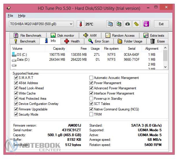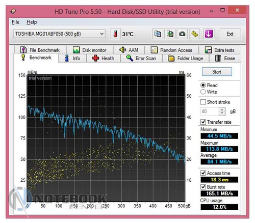 Под нагрузкой (Furmark и стресс-тест AIDA) все показатели, естественно, возросли, однако остались в разумных пределах. Так, самая низкая температура 24.6°С была зафиксирована в правом верхнем углу рабочей площадки, а самая высокая, 36.3°С – в том же месте, только на днище. Что сказать, работать с таким ноутбуком очень комфортно, ведь он практически не греется даже в условиях самого активного пользования.