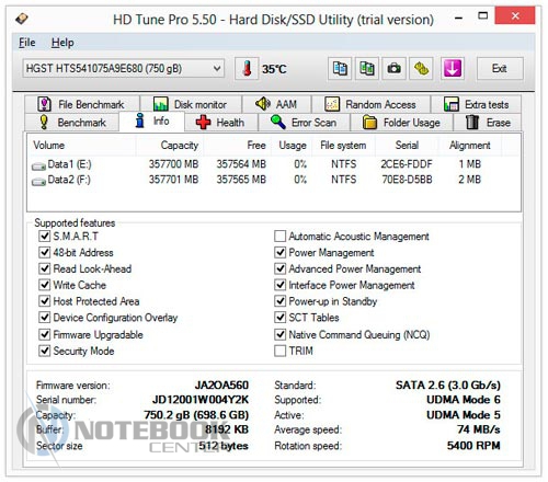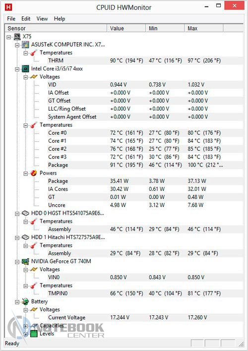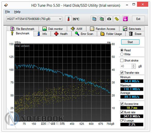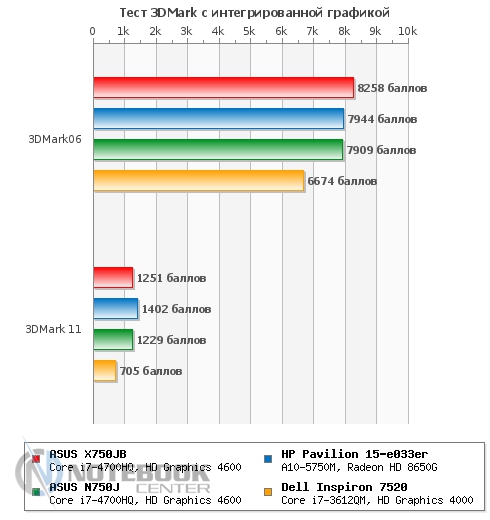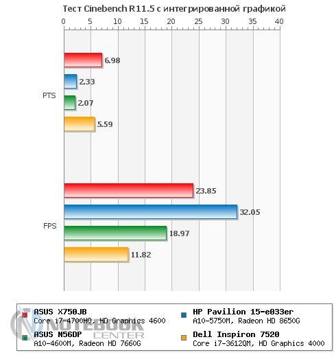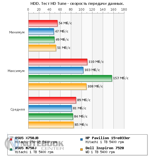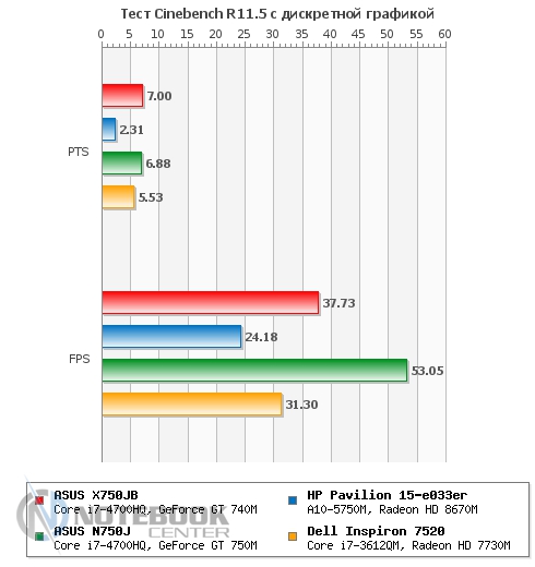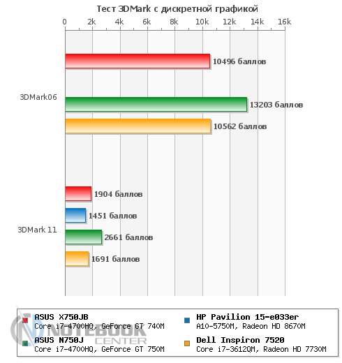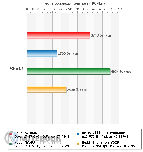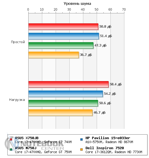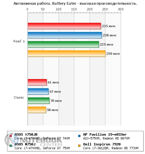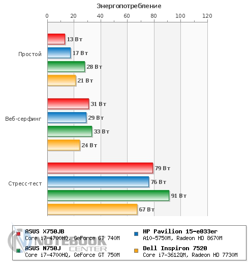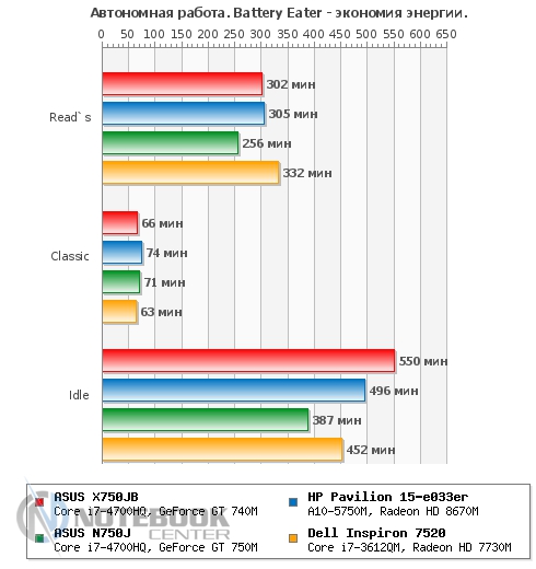 Зато по уровню издаваемого шума ноутбук ASUS X750JB нельзя назвать самым тихим, поскольку в режиме ожидания результаты измерений доходят до 50.8 дБ, а под нагрузкой еще больше – 58.4 дБ. Вообще, учитывая производительность ASUS X750JB, во время работы он и не может быть совсем бесшумным. Кстати, среди устройств, с которыми мы его сравнивали, он стоит на первом месте, а вот самым тихим в этой компании оказался Dell Inspiron 7520. ![]() БатареяВ ноутбуке установлена 4-секционная литий-ионная батарея емкостью 2950 мАч (44 Втч). Прямо скажем, это не слишком большая емкость, тем не менее, с данным аккумулятором ASUS X750JB показывает достаточно неплохую автономность. Например, в плане электропитания «Экономия энергии» в режиме «Read’s» он может работать до 5 часов 2 минут, тогда как в «Classic» продолжительность на порядок ниже и составляет всего 1 час 6 минут. ![]() Безусловно, в режиме «Высокой производительности» ноутбук продержится без подзарядки меньше: «Read’s» – не более 3 часов 55 минут, «Classic» – около часа. Зато самым продолжительным по времени, естественно, является режим «Idle» (простой), в котором устройство разрядится только через 9 часов 10 минут. ![]() Стоит отметить, что для зарядки аккумулятора используется 120-ваттный блок питания, при этом АКБ заряжается достаточно быстро – за 2 часа 49 минут. ![]() ![]() В плане энергопотребления ASUS X750JB революции не совершил, хотя в режиме простоя он действительно потребляет совсем немного – 13 Вт. При веб-серфинге показатель увеличился почти в полтора раза и составил 31 Вт, а под нагрузкой – до 79 Вт. Между тем сравнительный график показывает, что в ненагруженном состоянии данный ноутбук самый энергоэффективный, тогда как в двух остальных тестах он занимает вторую позицию, следуя за ASUS N750J, что действительно подтверждает тот факт, что новая платформа Haswell является очень энергоэффективной. ![]() ЗаключениеВ действительности ASUS X750JB достаточно хороший мультимедийник. В нем есть все, что нужно для рабочих задач, а также для развлечений. В первую очередь результативность работы достигается оптимальной связкой мощного процессора четвертой генерации Intel Core i7-4700HQ и дискретной видеокарты NVIDIA GeForce GT 740M. Не может не радовать суммарный объем двух жестких дисков 1500 ГБ, а также 12 ГБ оперативной памяти. Безусловно, ряд достоинств не ограничивается одной лишь начинкой, поскольку в ноутбуке ASUS X750JB есть привод Blu-ray, четыре порта USB, а также довольно крупная эргономичная клавиатура и тачпад. Пожалуй, назвать компактным 17-дюймовый ноутбук не получится, но на деле он очень аккуратный. Субъективно в этом ноутбуке веб-камере не хватает разрешения, акустике – гармоничного и достаточно громкого звучания, а корпусу большей жесткости. Но и стоимость данной модели не так высока – порядка $1100. Благодарим представительство ASUS в Украине www.asus.ua за любезно предоставленный для тестирования ноутбук. Дата: 29.01.2014