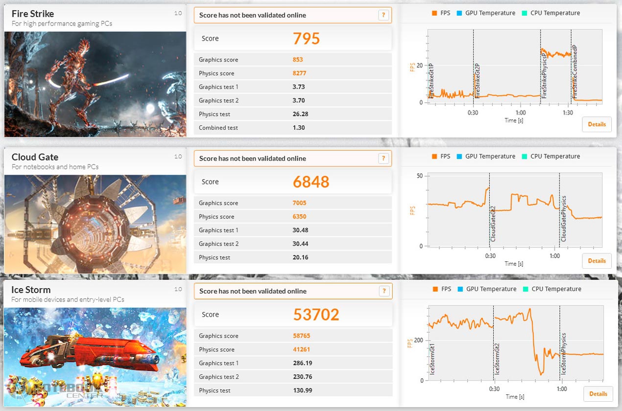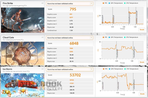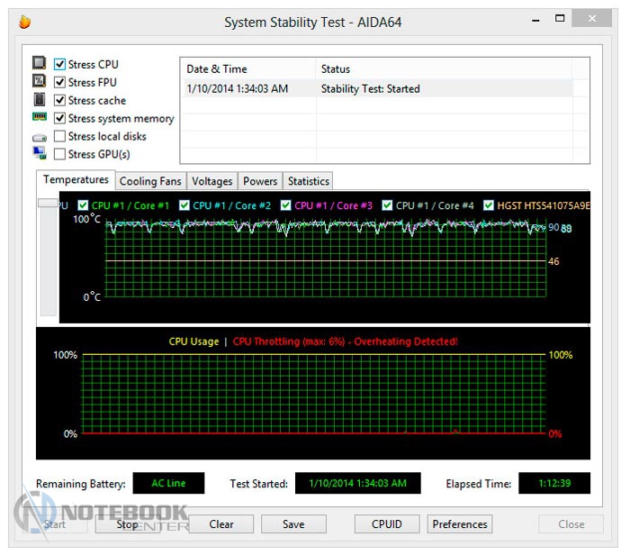 Для того, чтобы проверить как ведет себя ноутбук под нагрузкой на два часа был запущен тест FurMark (нагружает видеокарту) и стресс-тест AIDA (эмулирует загрузку процессора на 100%). В результате левая часть рабочей поверхности и, соответственно, правая на днище нагрелись достаточно ощутимо, а разница между простоем и нагрузкой превысила 7°C. Вдобавок на нижней панели ноутбука очень горячим оказался правый верхний угол, где температура поднялась до 39.2 градуса. Если говорить о самом прохладном месте, то им оказалась зона подладонной площадки, а также нижний левый угол днища, что свидетельствует о том, что даже во время игровых баталий или активной работы, печатать на ноутбуке будет весьма комфортно, и ничего не будет обжигать кисти рук.