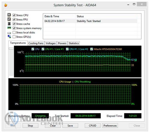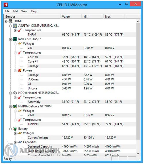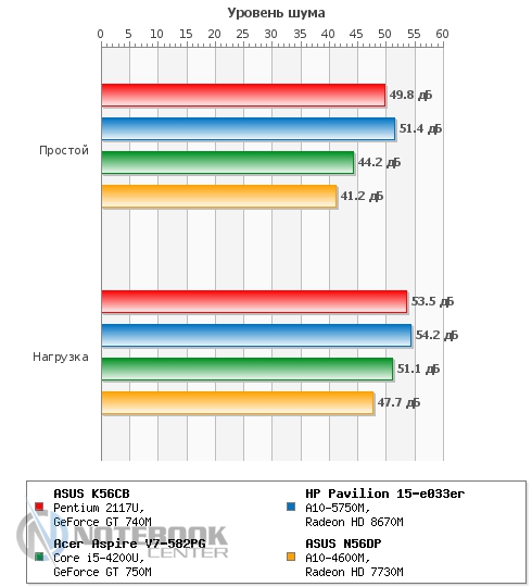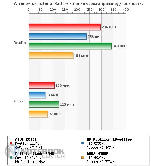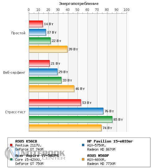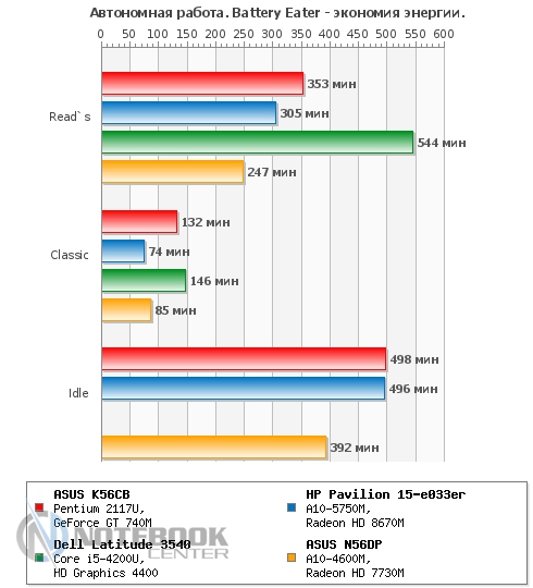 Что касается нагрева внутренних компонентов, то при запуске приложения CPUID HWMonitor датчики, стоящие на процессоре, жестком диске и видеокарте показали следующие результаты: меньше всех нагрелся накопитель, его максимальная температура составила 35°C. В сравнении с ним нагрев дискретной видеокарты NVIDIA GeForce GT 740M и процессора Pentium 2117U оказался более высоким, дойдя до 79 градусов и 64 градусов по Цельсию соответственно. Кстати, троттлинга во время тестирования не было, следовательно, производительность процессора не ограничивалась. ![]() ![]() Что касается шумности работы ноутбука, то, безусловно, при активном использовании к звуку работающего винчестера добавится и работа системы охлаждения. Нельзя сказать, что с этой позиции ASUS K56CB слишком мешает окружающим, тем не менее, показатели говорят о том, что результат не самый низкий среди конкурентов. Так, на графике видно, что 49.8 дБ в простое ставят данный ноутбук на второе место после HP Pavilion 15-e033er. Несмотря на то, что под нагрузкой результаты всех четырех моделей сильно не отличаются, самым тихим в этой компании оказался ASUS N56DP. ![]() БатареяВ данном ноутбуке установлена 4-секционная литий-ионная батарея емкостью 2950 мАч (44 Втч). Она обеспечивает пусть не слишком высокую, но достаточную для командировок и других поездок автономность. ![]() ![]() Так, в плане электропитания «Экономия энергии» в режиме «Read’s» ASUS K56CB достойно продержался 5 часов 53 минуты. Конечно, при работе в «Сlassic» заряд аккумулятора уменьшается быстрей, поэтому здесь можно рассчитывать на продолжительность работы около 2 часов 12 минут. Если говорить о времени разрядки в «Idle» (простой), то в данном режиме ноутбук разрядится только через 8 часов 18 минут. ![]() При изменении плана электропитания на «Высокую производительность» мы, безусловно, ожидали менее длительной работы без подзарядки, поэтому время 4 часа 56 минут и 1 час 46 минут, полученное в «Read’s» и «Сlassic» соответственно, не стало неожиданностью. ![]() Если говорить о зарядке АКБ, то она осуществляется 65-ваттным блоком питания и занимает 3 часа 10 минут. ![]() Энергопотребление ноутбука не выходит за рамки ожидаемого. Например, в простое он потребляет всего 14 Вт, чуть больше показатели при просмотре интернет-страниц – 21 Вт и, наконец, максимальные под нагрузкой – 53 Вт. На графике видно, что энергопотребление ASUS K56CB ниже, чем у HP Pavilion 15, Acer Aspire V7 и ASUS N56DP. Впрочем, начинка перечисленных устройств мощнее, так что тут все объяснимо. ![]() ЗаключениеПодводя итоги, хочется отметить, что ноутбук ASUS K56CB можно считать достаточно хорошим вариантом, если вы собираетесь его использовать для ежедневной офисной работы и досуга. Для этого в нем предусмотрена эргономичная клавиатура с отдельным цифровым блоком и большой тачпад, а также неплохая начинка, включающая процессор третьего поколения и производительную дискретную видеокарту. Между тем владелец этого лэптопа может свободно отправляться в поездки и рассчитывать на сравнительно неплохую автономность, возможность своевременно решать рабочие задачи или же без проблем подключать различные устройства. В то же время не стоит полагаться на дисплей в плане профессиональной работы в графических редакторах, поскольку в ходе тестирования он оказался попросту бюджетным. Зато дизайн ASUS K56CB не оставит никого безучастным, он выполнен в духе современных решений от AS