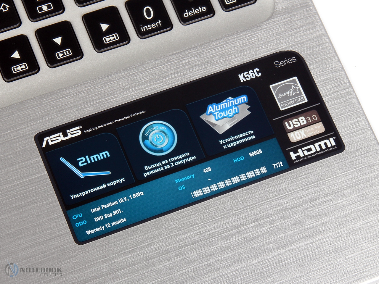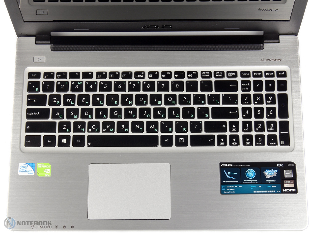 Комплект поставкиНоутбук ASUS K56CB поставляется в обычной картонной коробке. В ней кроме самого лэптопа мы увидели батарею, блок питания, необходимые провода, а также ряд полезной и необходимой документации: краткая инструкция к началу работы, два руководства пользователя (для операционной системы Windows 8 и непосредственно для ноутбука). Кроме того, в коробку был вложен гарантийный талон, диск с драйверами и утилитами и, наконец, рекламный буклет с представленным ассортиментом беспроводных маршрутизаторов. ![]() ДизайнПервое впечатление от дизайна ноутбука – классика, не лишенная стиля. Итак, корпус устройства сделан из алюминия, он матовый и достаточно маркий, поскольку от малейшего прикосновения на поверхности остаются заметные отпечатки пальцев. ![]() На крышке ASUS K56CB имеется продольная шлифовка, придающая дизайну привлекательный, скорее, даже элегантный вид. В центре размещается фирменный логотип компании, а ближе к краю – обычная полоса пластика, за которой скрываются антенны беспроводной сети. ![]() Интерьер ноутбука имеет такой же симпатичный дизайн, что и внешняя часть. Правда, здесь есть существенное отличие в расцветке. И если снаружи используется темно-коричневый и черный цвета, то внутренняя поверхность в основном серебристая. ![]() В целом общий фон ненавязчивый, не раздражающий, наоборот, он достаточно спокойный, создает рабочую атмосферу. Кстати, дизайнерам удалось действительно гармонично соединить темную рамку вокруг дисплея, а также светлую рабочую область. Кроме того, достаточно органично смотрится классическая форма ноутбука с обычными закругленными углами и отсутствием резких переходов или рубленых краев. ![]() Днище ноутбука выполнено полностью из пластика. Здесь можно увидеть довольно крупный отсек, благодаря которому легко добраться до оперативной памяти и винчестера; съемную батарею; ползунки для ее извлечения, а также несколько вентиляционных решеток для забора воздуха. ![]() Безусловно, предусмотрены резиновые ножки, благодаря которым ноутбук не скользит на плоской поверхности стола. Кстати, несмотря на использование пластика, нижнюю панель совсем непросто прогнуть, ввиду ее отличной жесткости. ![]() ![]() Стоит отметить, что основание и дисплей соединяются двумя петлями. С их помощью ноутбук раскрывается до 144 градусов. Приятно, что петли достаточно тугие, поэтому экран практически не раскачивается. ![]() Что касается размеров, то они не слишком велики, как для 15.6-дюймового устройства. Длина и глубина ноутбука составляют 380 и 266 мм, тогда как толщина не превышает 22 мм. По всей видимости, ASUS K56CB не станет для владельца громоздкой и тяжелой ношей, если брать лэптоп в командировки, ведь вес ноутбука 2.28 кг является сравнительно небольшим, даже с учетом дополнительных 235 граммов зарядного устройства. Дисплей, звук, веб-камераВ ASUS K56CB установлен 15.6-дюймовый дисплей Samsung LTN156AT20-P01 со стандартным разрешением 1366х768 пикселей и кинематографическим соотношением сторон 16:9. Поверхность экрана глянцевая, она сильно отражает и бликует при ярком свете. Работать с таким дисплеем удобно, при условии, что солнечные лучи не будут направлены на него. Так что лучше использовать ноутбук в помещении, а не на улице, чтобы свести неудобства к минимуму. ![]() Экран ASUS K56CB имеет ожидаемую для TN-матрицы обзорность, хотя в целом не только горизонта
